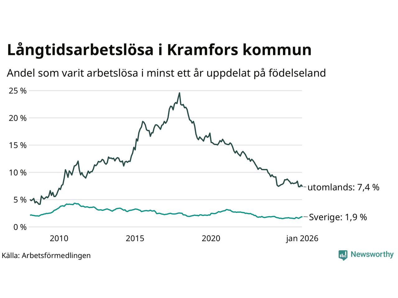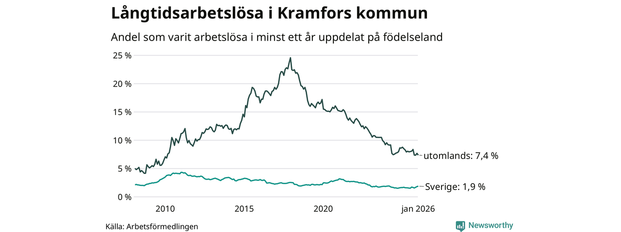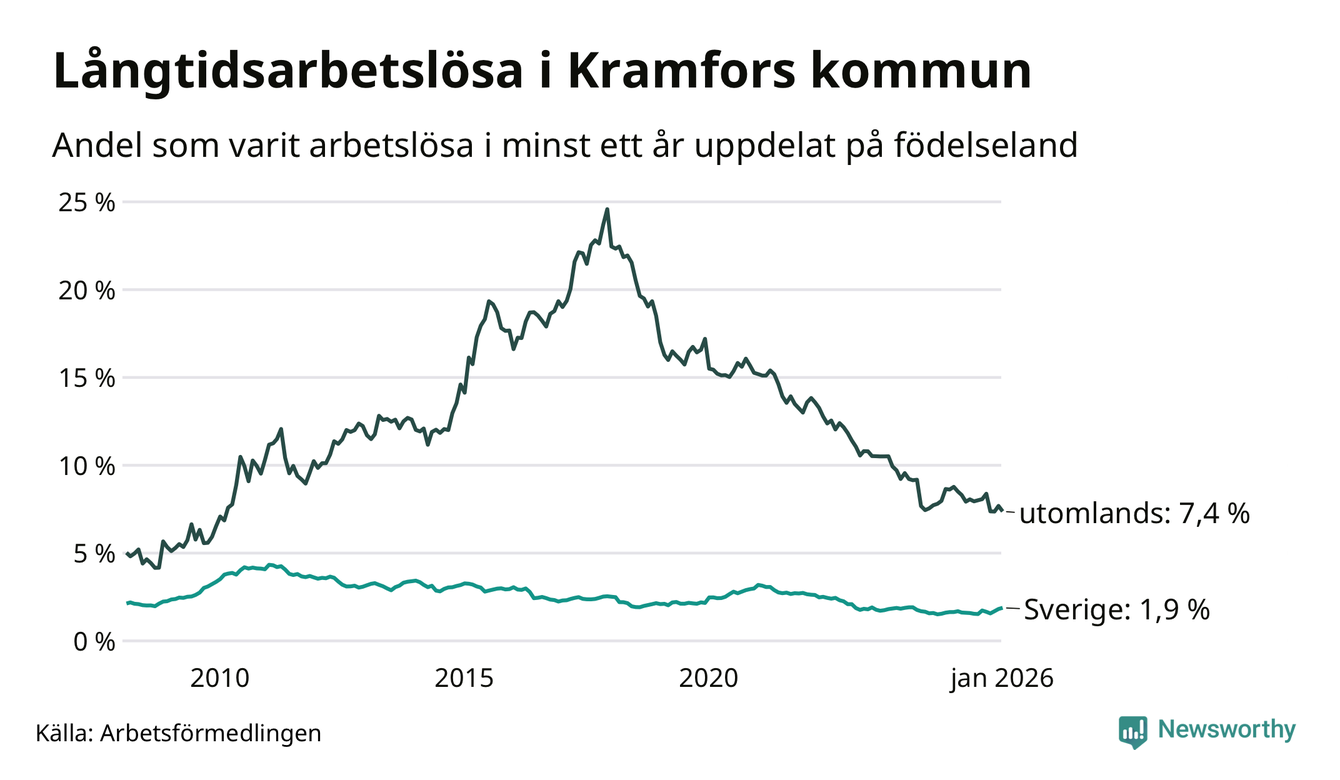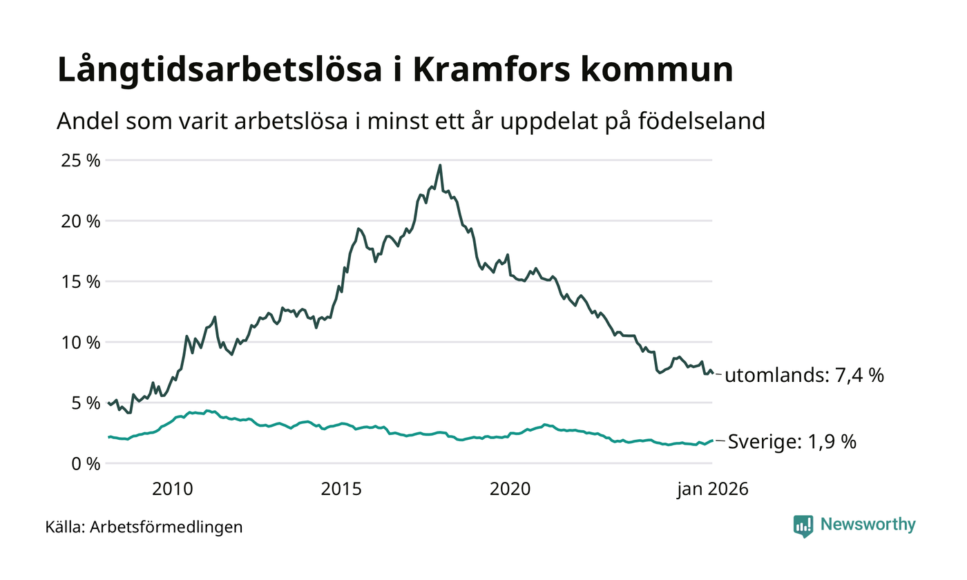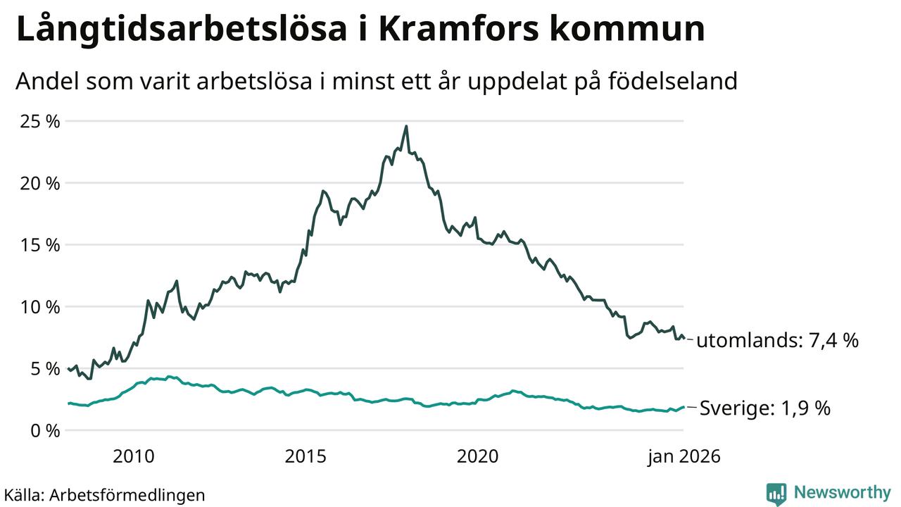 123 av de långtidsarbetslösa i Kramfors är födda i Sverige, medan 91 är födda utomlands. Det innebär att långtidsarbetslösheten bland Sverigefödda är 1,9 procent, medan den är fyra gånger så hög – 7,4 procent – bland födda utomlands. Även i riket som helhet är arbetslösheten högre bland utrikesfödda.