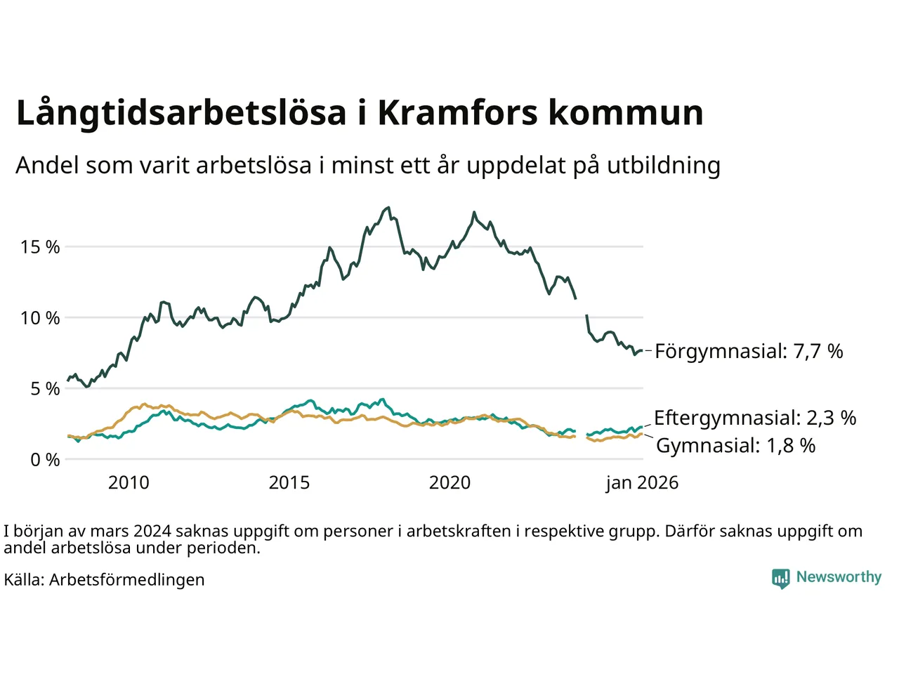 | Andel arbetslösa i minst två år | 1,5 % | 1,4 % | 1,6 % |