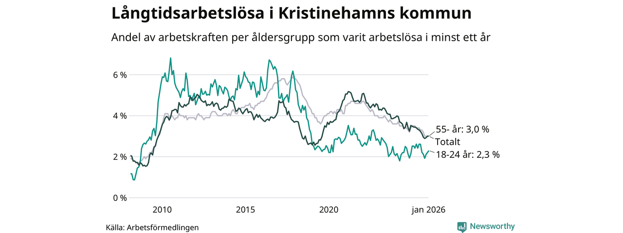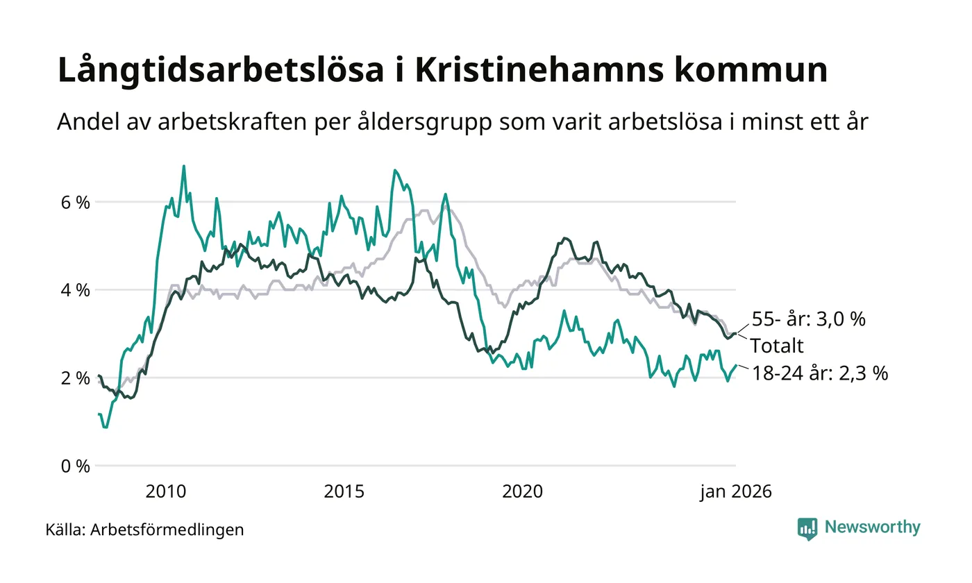 Av de 329 personerna som varit arbetslösa i mer än ett år i Kristinehamns kommun är 85 personer mellan 55 och 661 år och 24 är mellan 18 och 24 år. För den äldre gruppen är andelen arbetslösa 3,0 procent medan den i den yngre gruppen är 2,3 procent. Även i riket som helhet är långtidsarbetslösheten högre i gruppen äldre.
