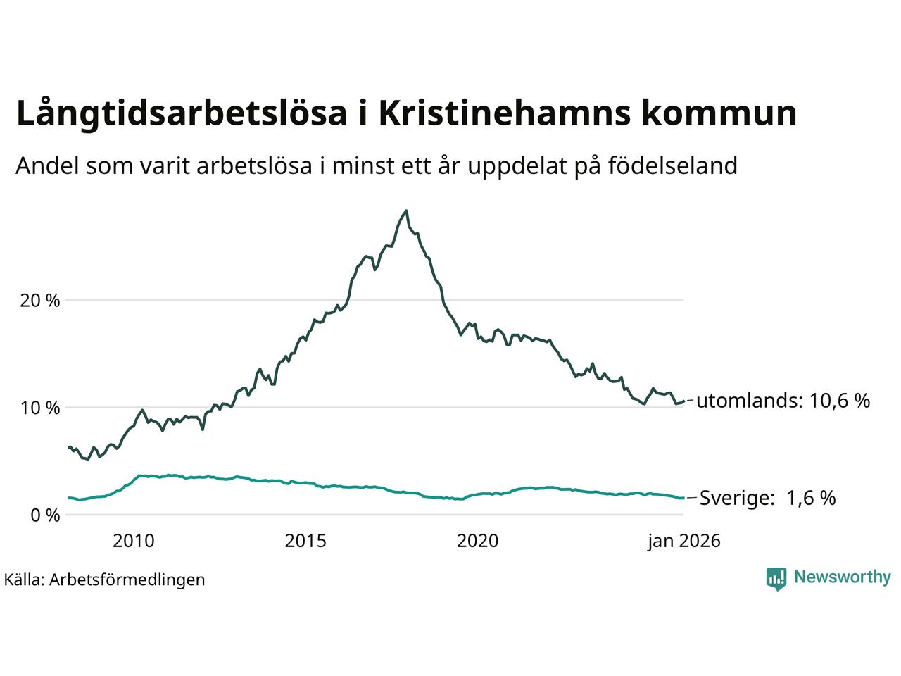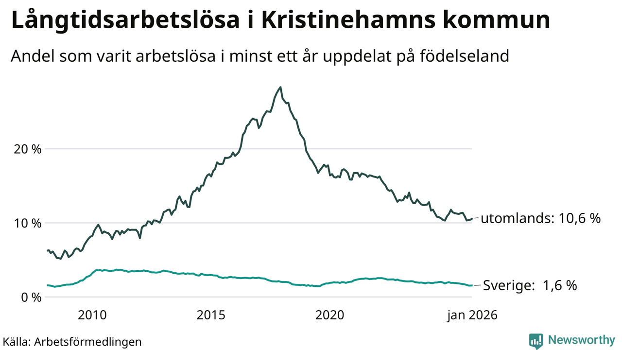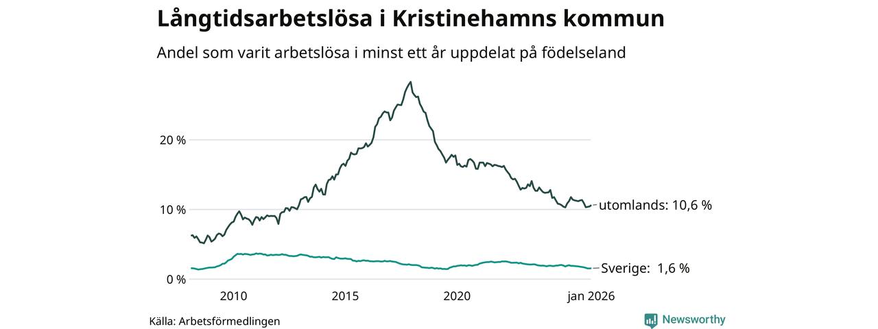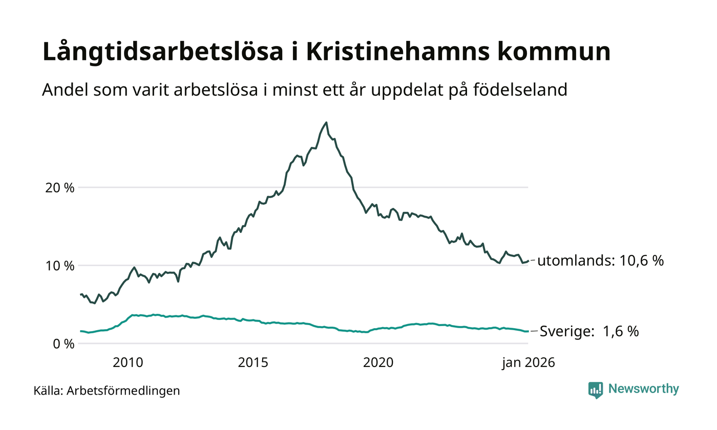 141 av de långtidsarbetslösa i Kristinehamn är födda i Sverige, medan 188 är födda utomlands. Det innebär att långtidsarbetslösheten bland Sverigefödda är 1,6 procent, medan den är sju gånger så hög – 10,6 procent – bland födda utomlands. Även i riket som helhet är arbetslösheten högre bland utrikesfödda.