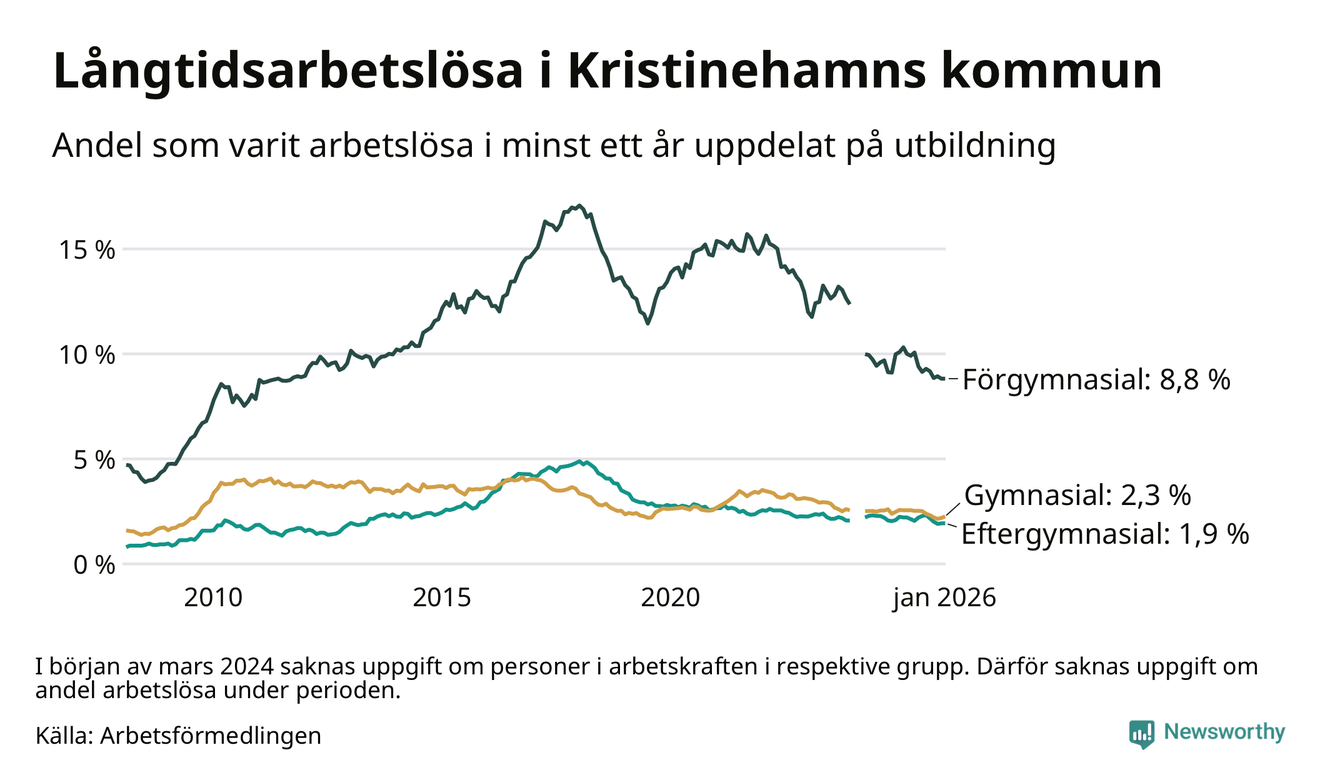 Andelen som varit utan arbete i minst ett år i Kristinehamn i januari var lägre än för ett år sedan. Men jämfört med i december har antalet långtidsarbetslösa ökat.