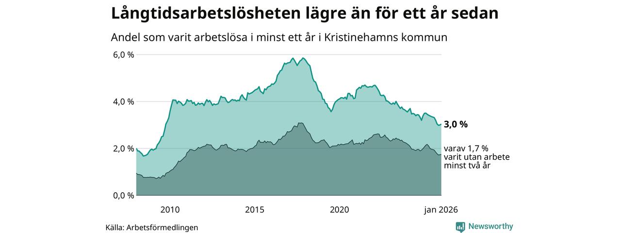 I januari hade 329 Kristinehamnsbor varit arbetslösa i minst ett år, vilket är sju fler än månaden innan. 329 personer motsvarar 3,0 procent av arbetskraften i kommunen – andelen långtidsarbetslösa är 0,5 procentenheter lägre än samma månad för ett år sedan.