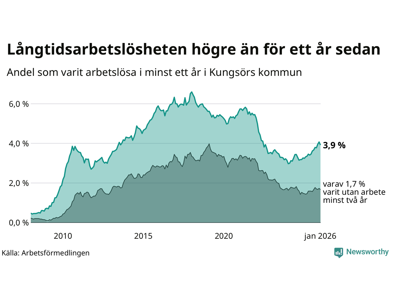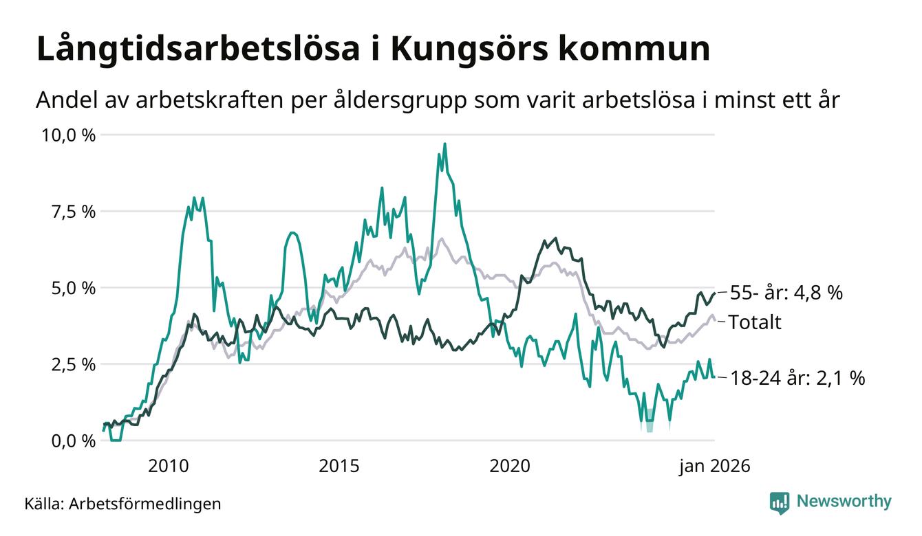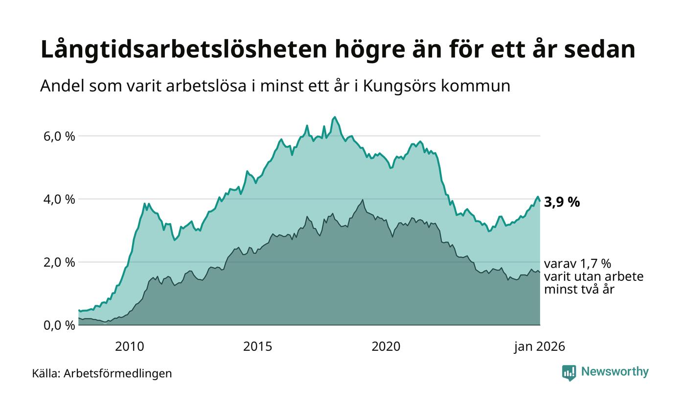 I januari hade 155 Kungsörsbor varit arbetslösa i minst ett år, vilket är fem färre än månaden innan. 155 personer motsvarar 3,9 procent av arbetskraften i kommunen – andelen långtidsarbetslösa är 0,7 procentenheter högre än samma månad för ett år sedan.