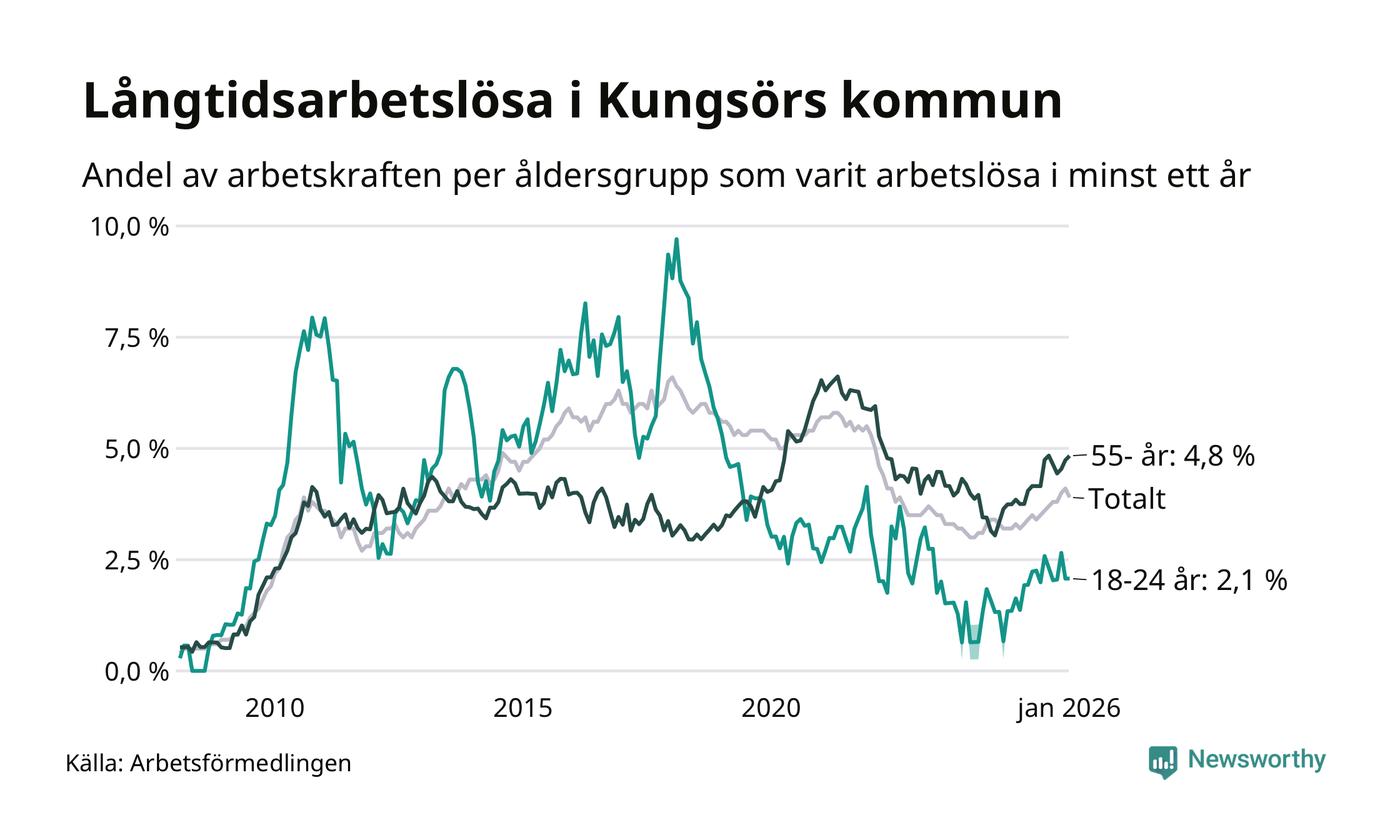 Av de 155 personerna som varit arbetslösa i mer än ett år i Kungsörs kommun är 49 personer mellan 55 och 661 år och sju är mellan 18 och 24 år. För den äldre gruppen är andelen arbetslösa 4,8 procent medan den i den yngre gruppen är 2,1 procent. Även i riket som helhet är långtidsarbetslösheten högre i gruppen äldre.