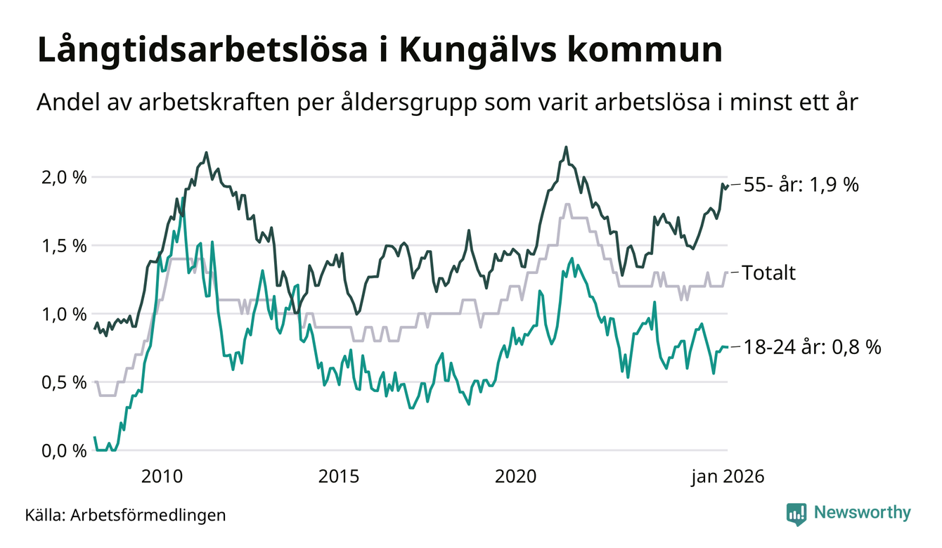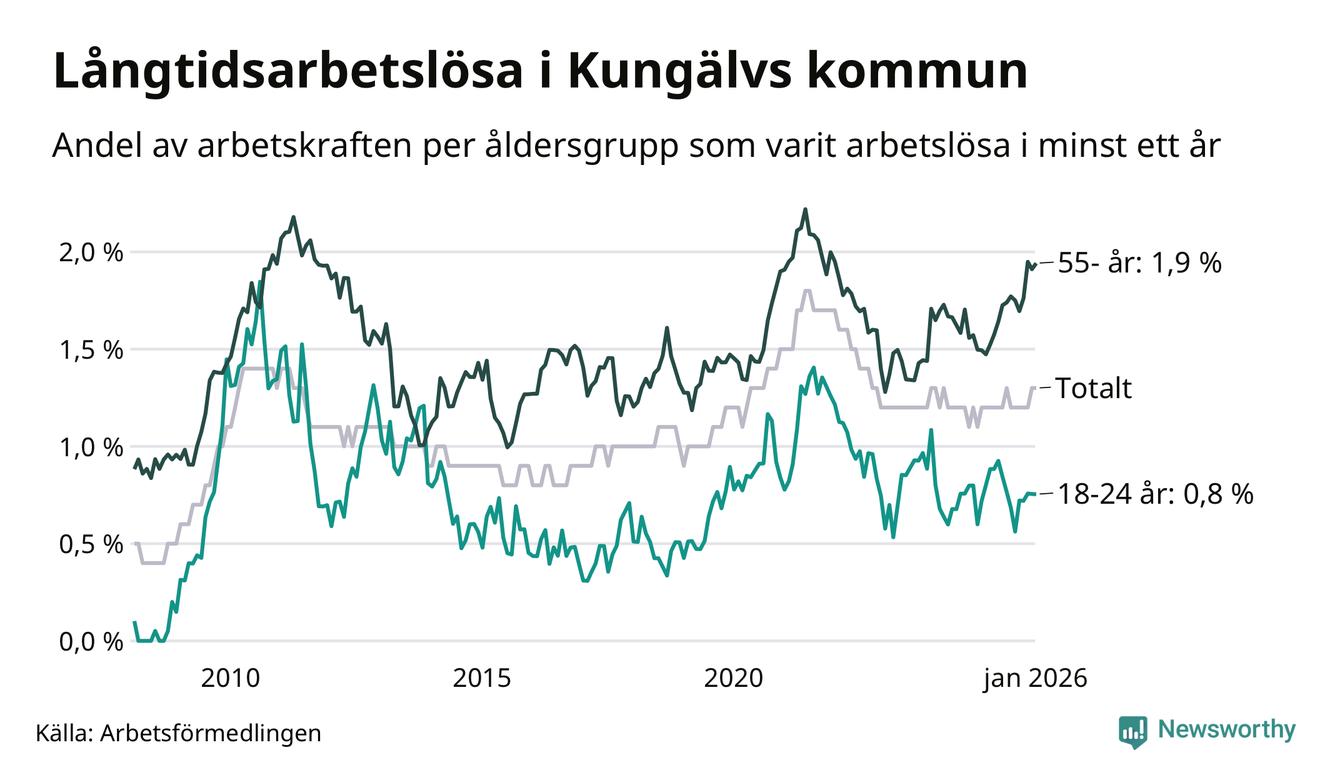 Av de 340 personerna som varit arbetslösa i mer än ett år i Kungälvs kommun är 113 personer mellan 55 och 661 år och 19 är mellan 18 och 24 år. För den äldre gruppen är andelen arbetslösa 1,9 procent medan den i den yngre gruppen är 0,8 procent. Även i riket som helhet är långtidsarbetslösheten högre i gruppen äldre.