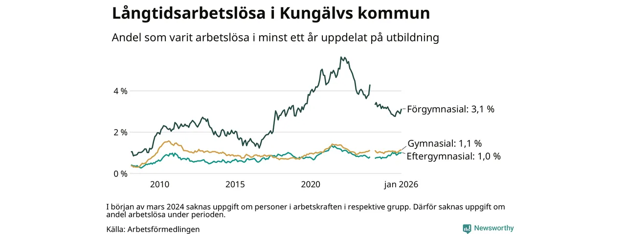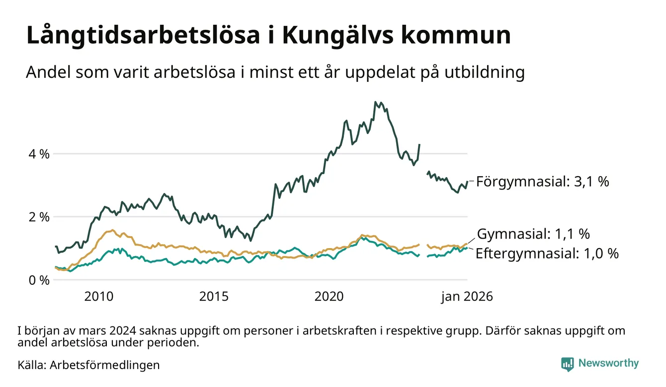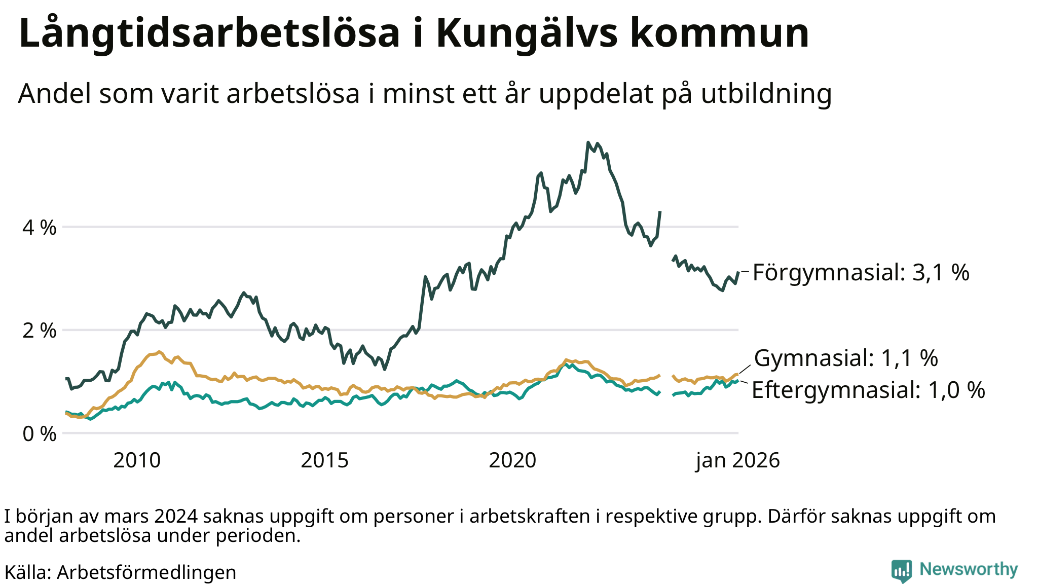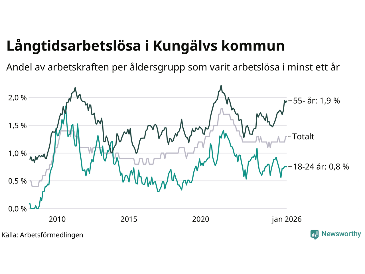 I januari hade 340 Kungälvsbor varit arbetslösa i minst ett år, vilket är 15 fler än månaden innan. Det är den fjärde månaden i rad med ökande antal långtidsarbetslösa. 340 personer motsvarar 1,3 procent av arbetskraften i kommunen – andelen långtidsarbetslösa är ungefär på samma nivå som för ett år sedan.