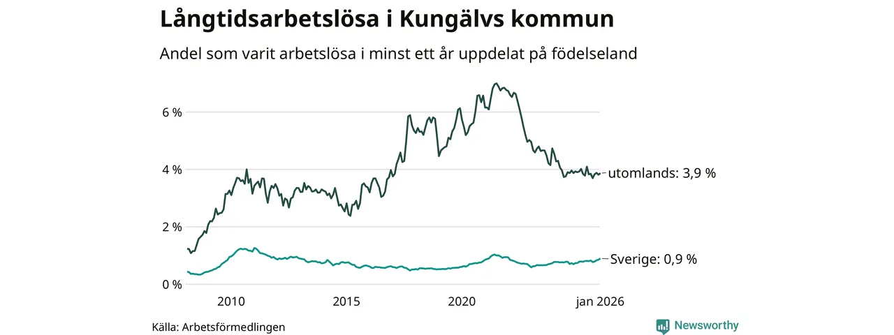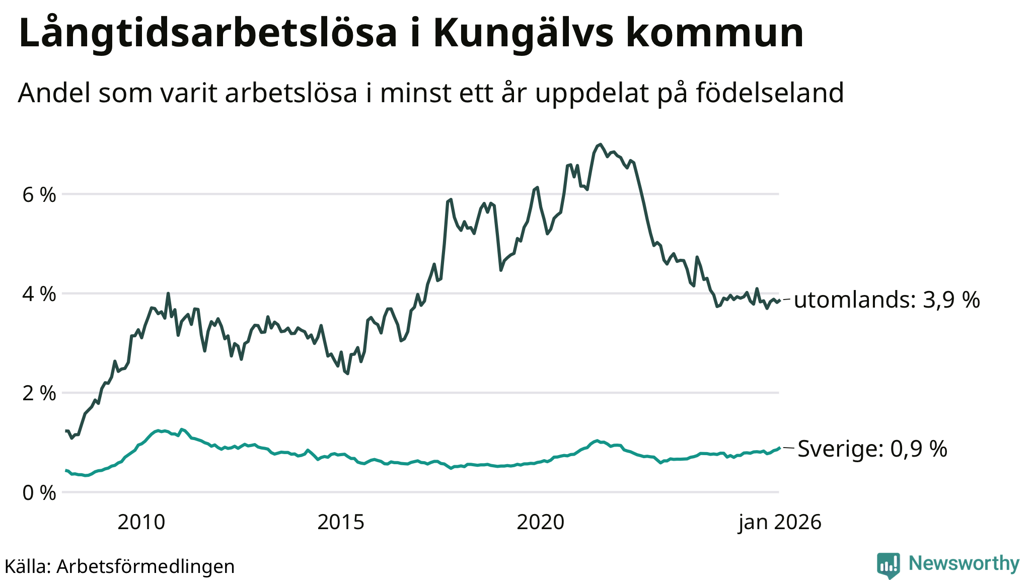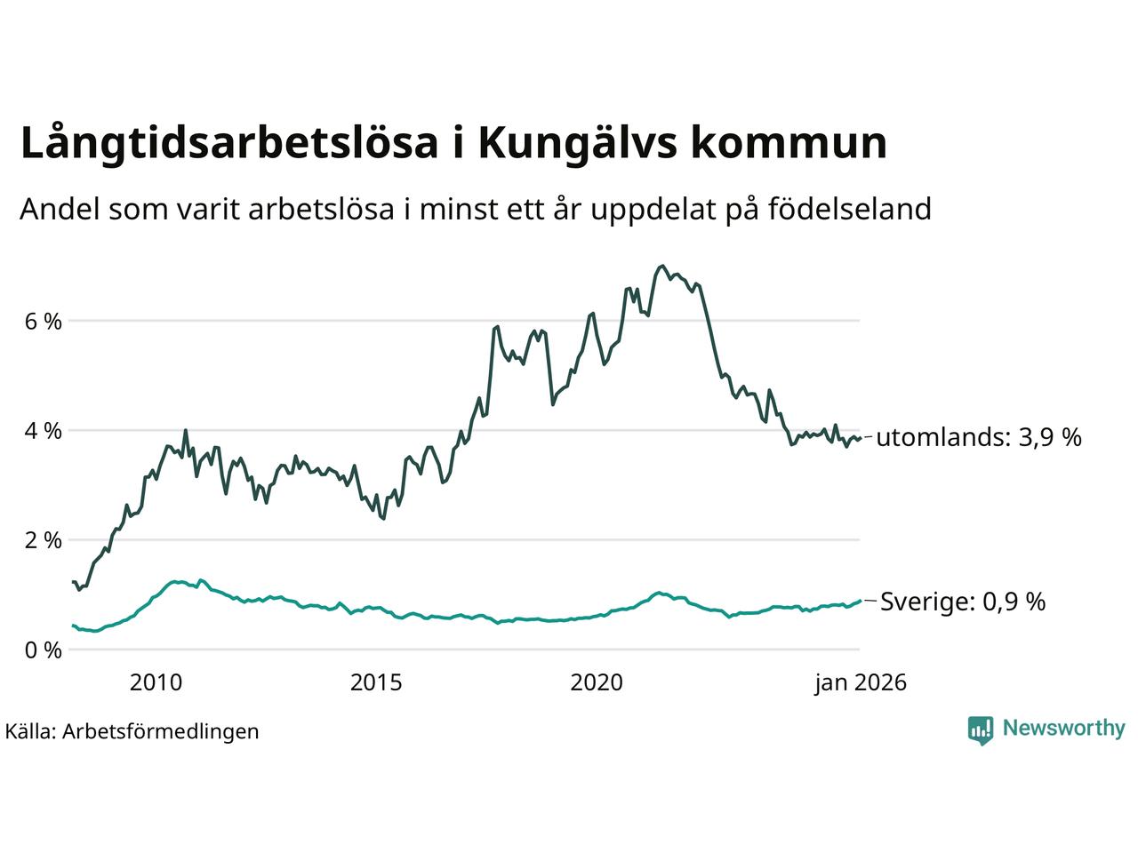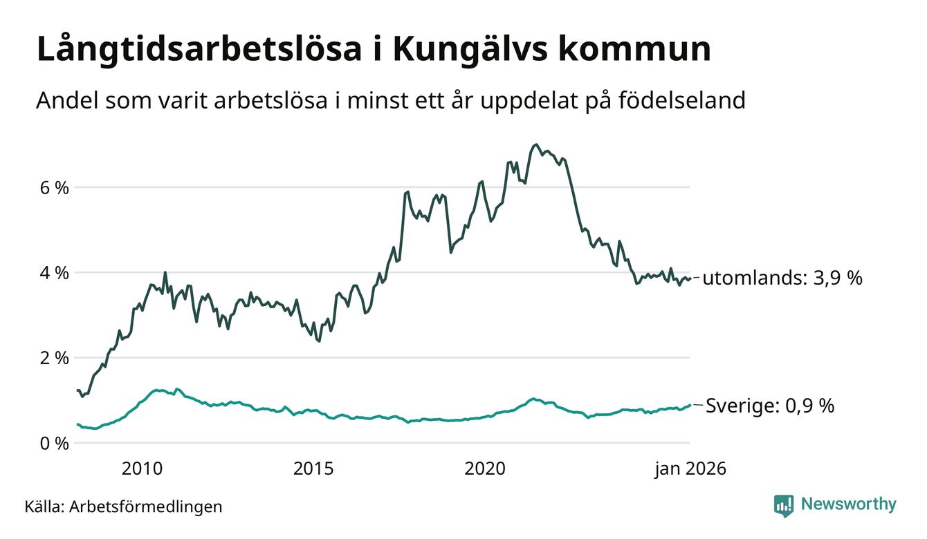 203 av de långtidsarbetslösa i Kungälv är födda i Sverige, medan 137 är födda utomlands. Det innebär att långtidsarbetslösheten bland Sverigefödda är 0,9 procent, medan den är fyra gånger så hög – 3,9 procent – bland födda utomlands. Även i riket som helhet är arbetslösheten högre bland utrikesfödda.