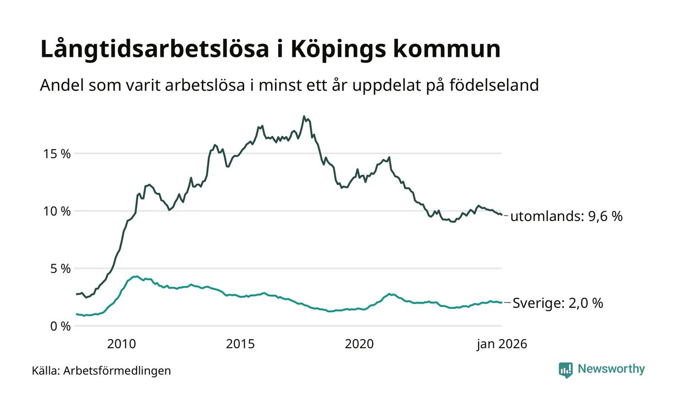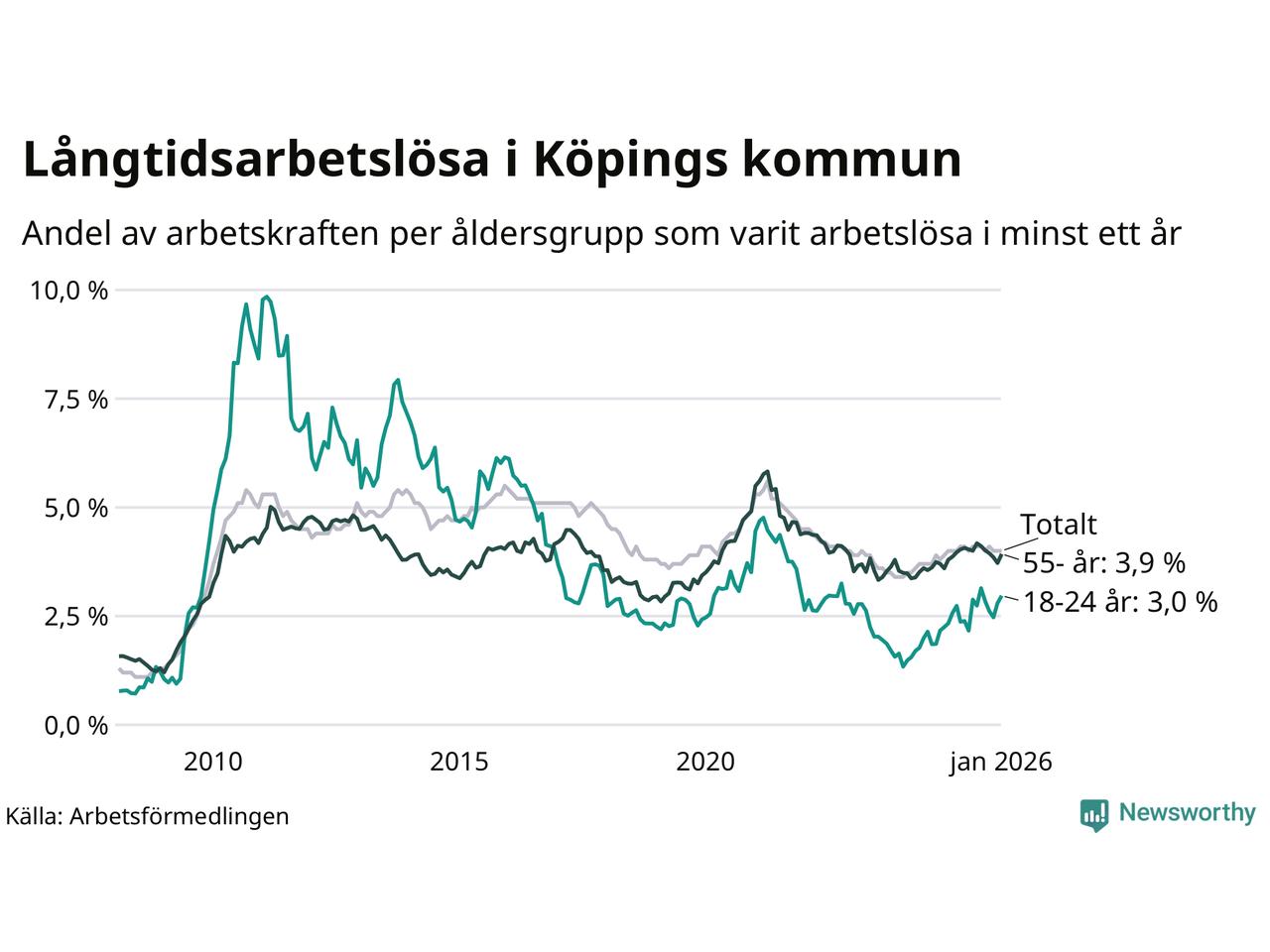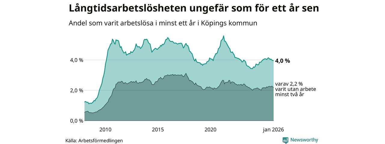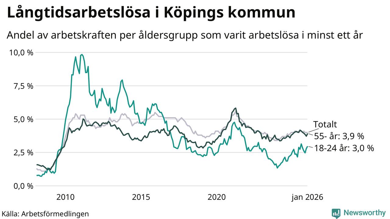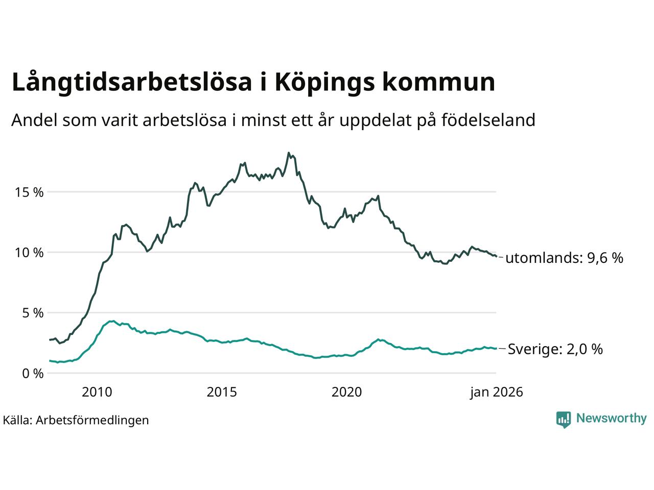 I januari hade 477 Köpingsbor varit arbetslösa i minst ett år, vilket är två fler än månaden innan. 477 personer motsvarar 4,0 procent av arbetskraften i kommunen – andelen långtidsarbetslösa är ungefär på samma nivå som för ett år sedan.