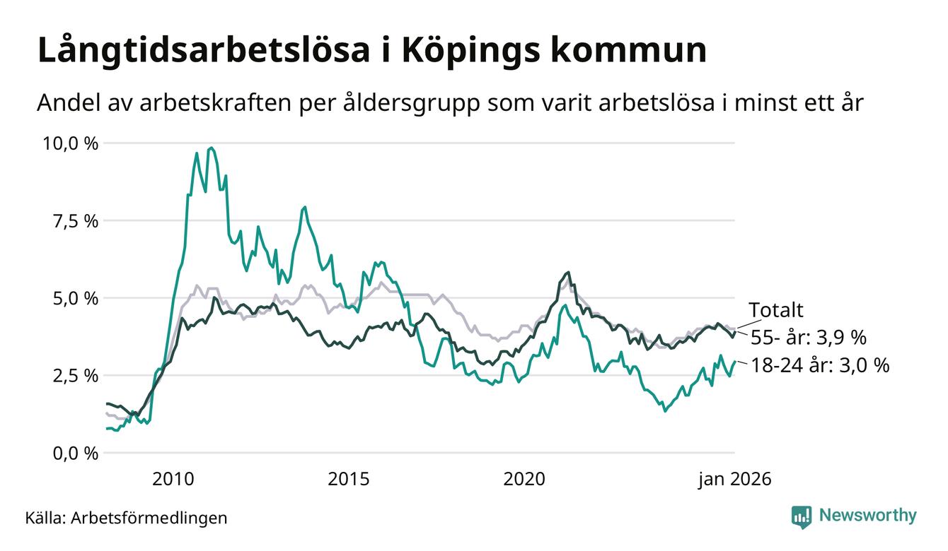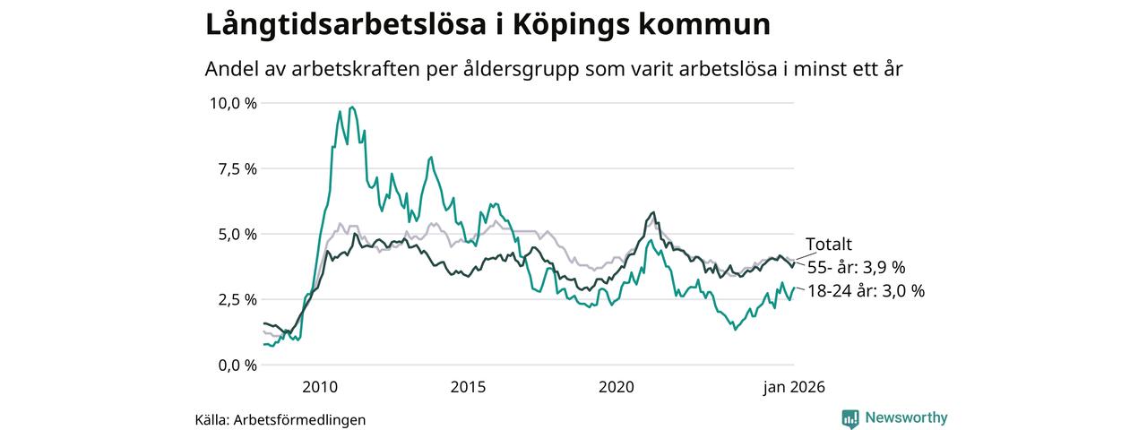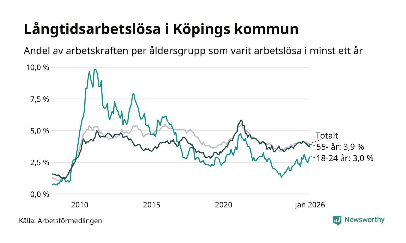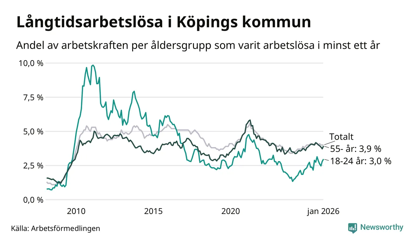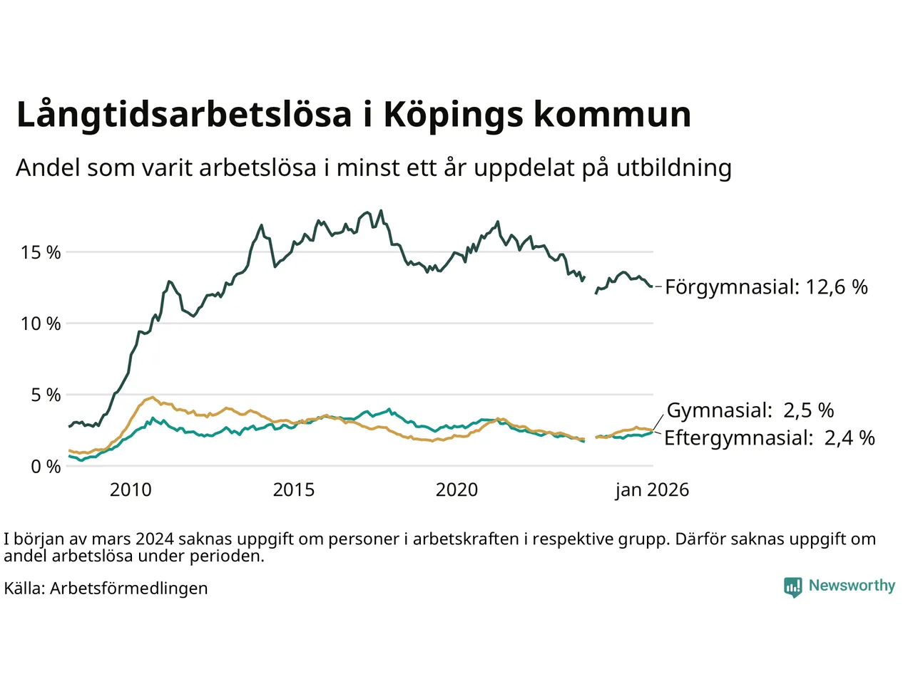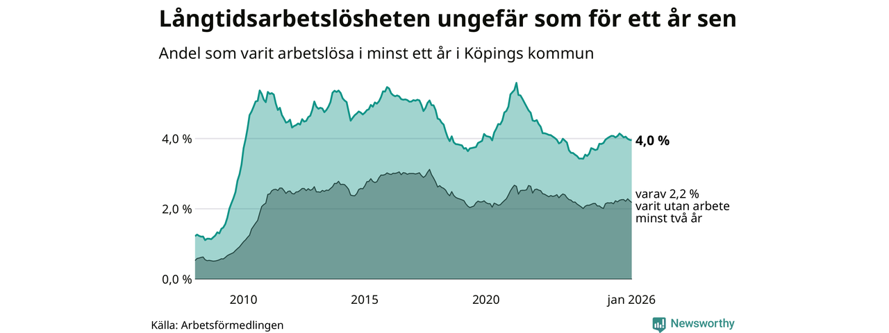 I januari hade 477 Köpingsbor varit arbetslösa i minst ett år, vilket är två fler än månaden innan. 477 personer motsvarar 4,0 procent av arbetskraften i kommunen – andelen långtidsarbetslösa är ungefär på samma nivå som för ett år sedan.