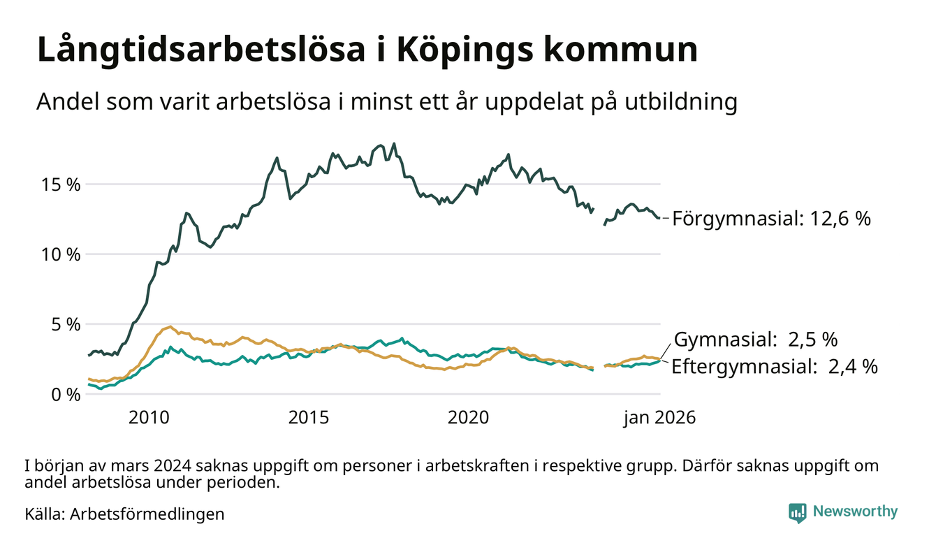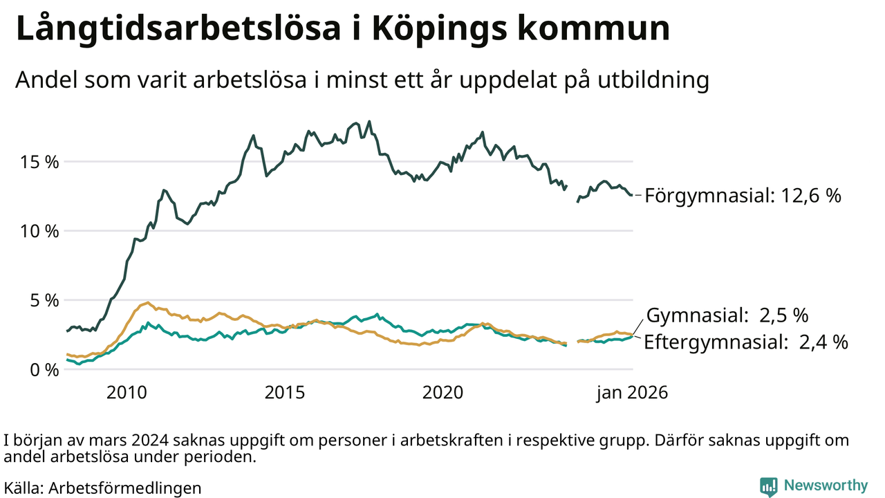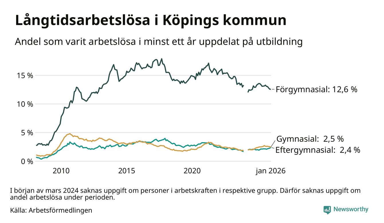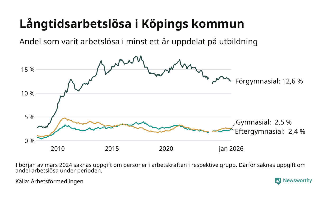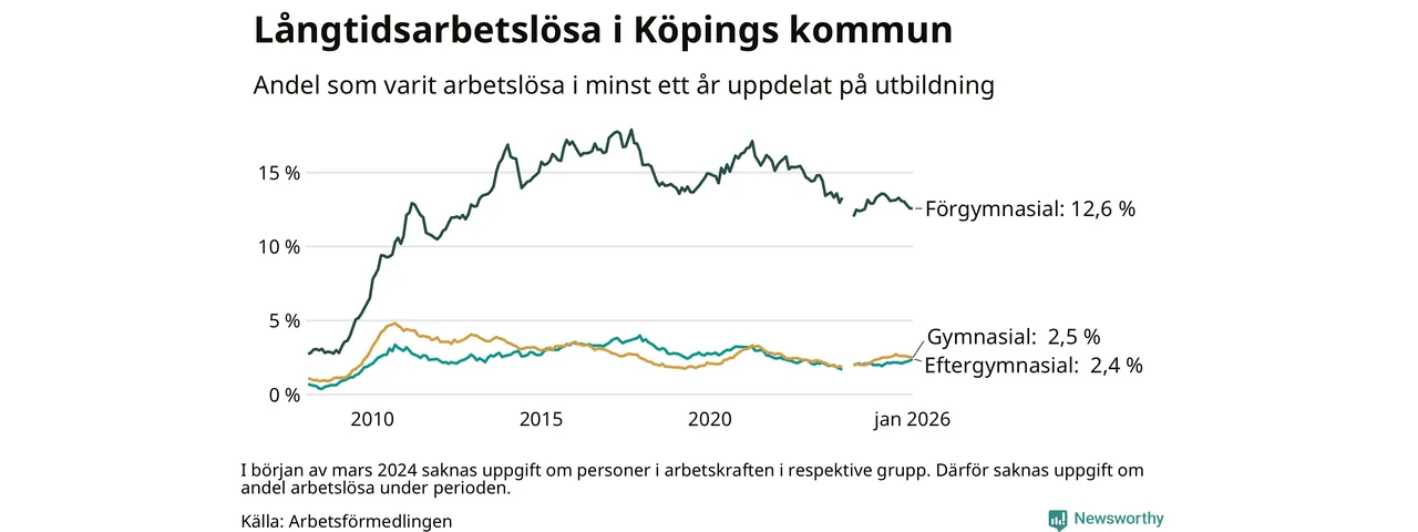 I januari hade 477 Köpingsbor varit arbetslösa i minst ett år, vilket är två fler än månaden innan. 477 personer motsvarar 4,0 procent av arbetskraften i kommunen – andelen långtidsarbetslösa är ungefär på samma nivå som för ett år sedan.
