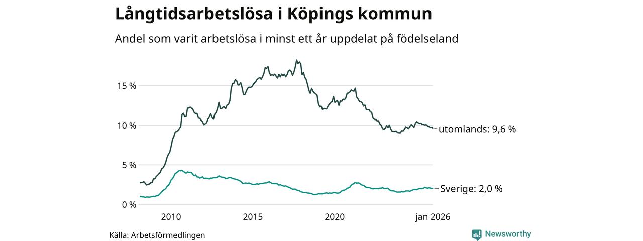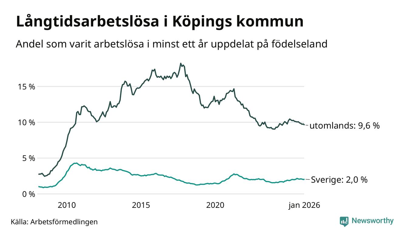 185 av de långtidsarbetslösa i Köping är födda i Sverige, medan 292 är födda utomlands. Det innebär att långtidsarbetslösheten bland Sverigefödda är 2,0 procent, medan den är fem gånger så hög – 9,6 procent – bland födda utomlands. Även i riket som helhet är arbetslösheten högre bland utrikesfödda.