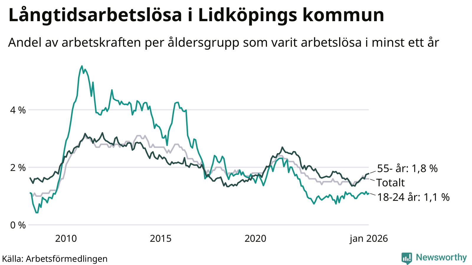 Graf: Andel arbetslösa uppdelat i åldersgrupper i Lidköping