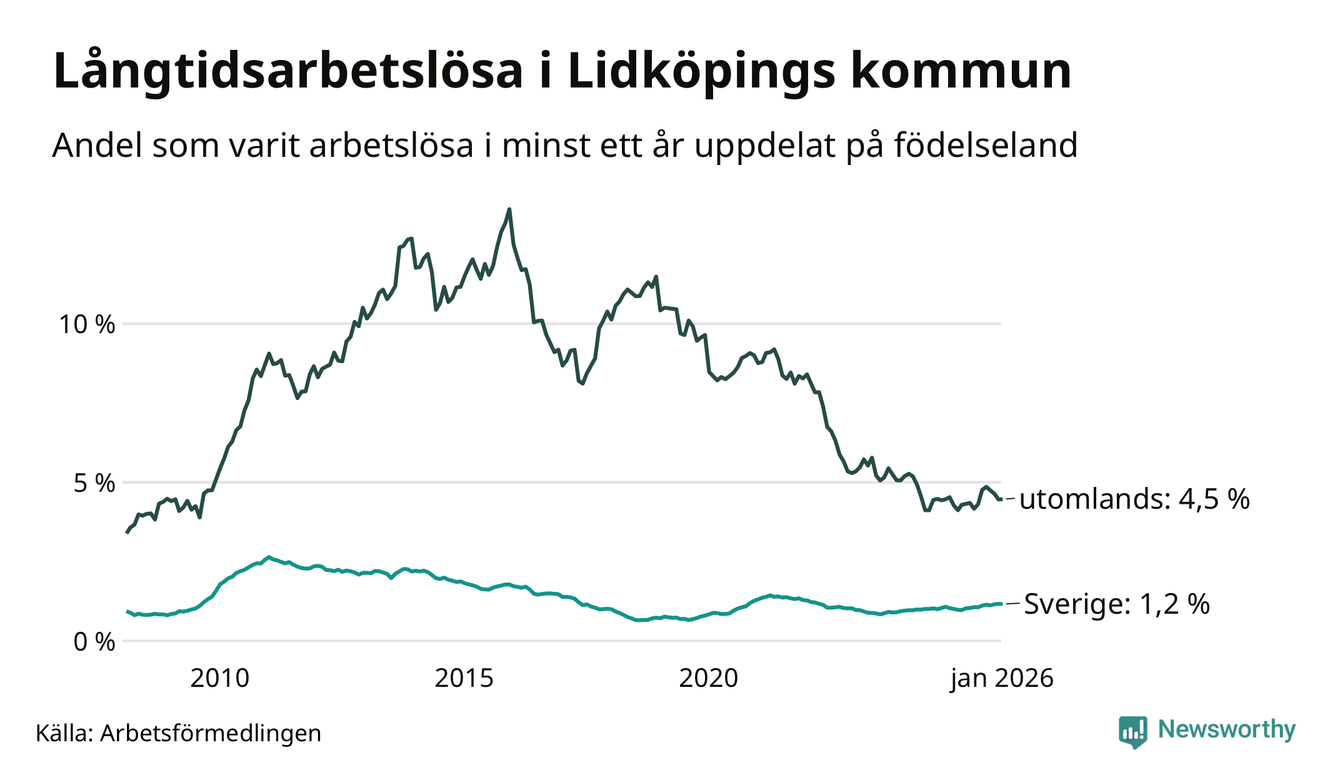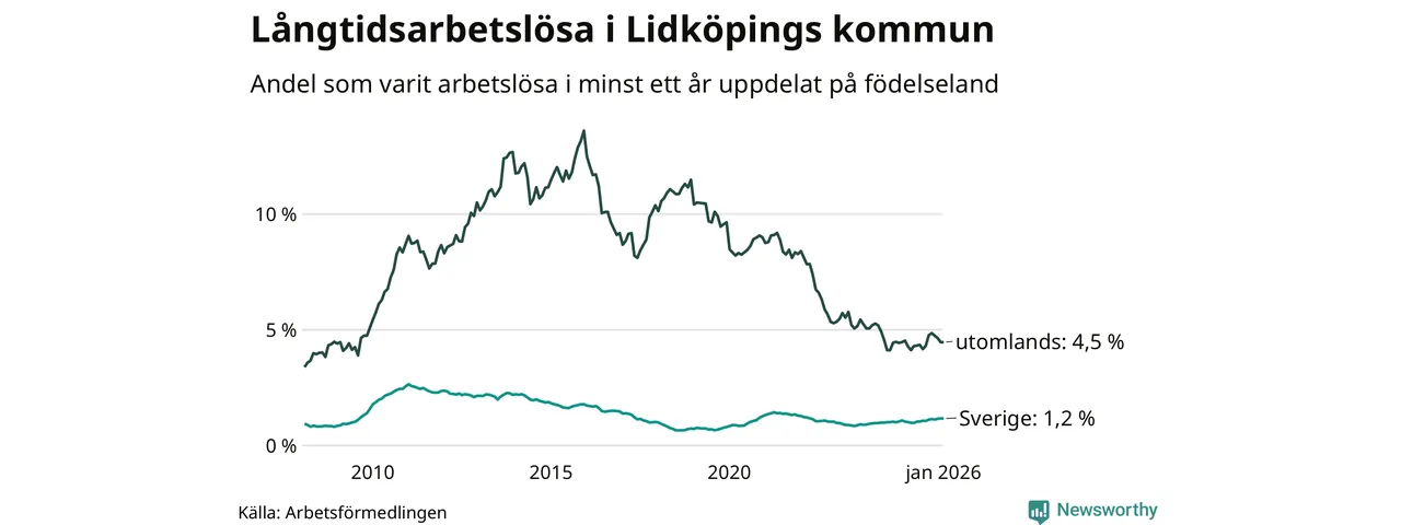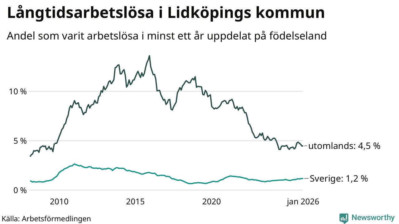 Graf: Andel arbetslösa uppdelat på födelseland i Lidköping