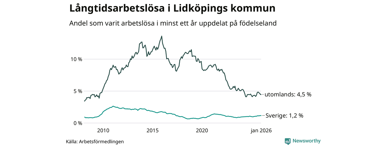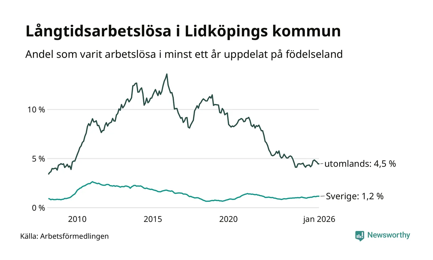 201 av de långtidsarbetslösa i Lidköping är födda i Sverige, medan 127 är födda utomlands. Det innebär att långtidsarbetslösheten bland Sverigefödda är 1,2 procent, medan den är fyra gånger så hög – 4,5 procent – bland födda utomlands. Även i riket som helhet är arbetslösheten högre bland utrikesfödda.