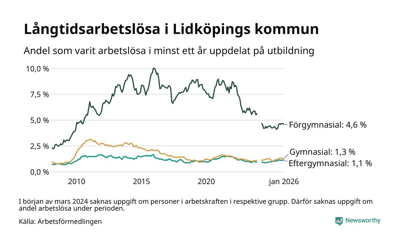 Graf: Andel arbetslösa i Lidköping som varit utan arbete i minst 12 månader