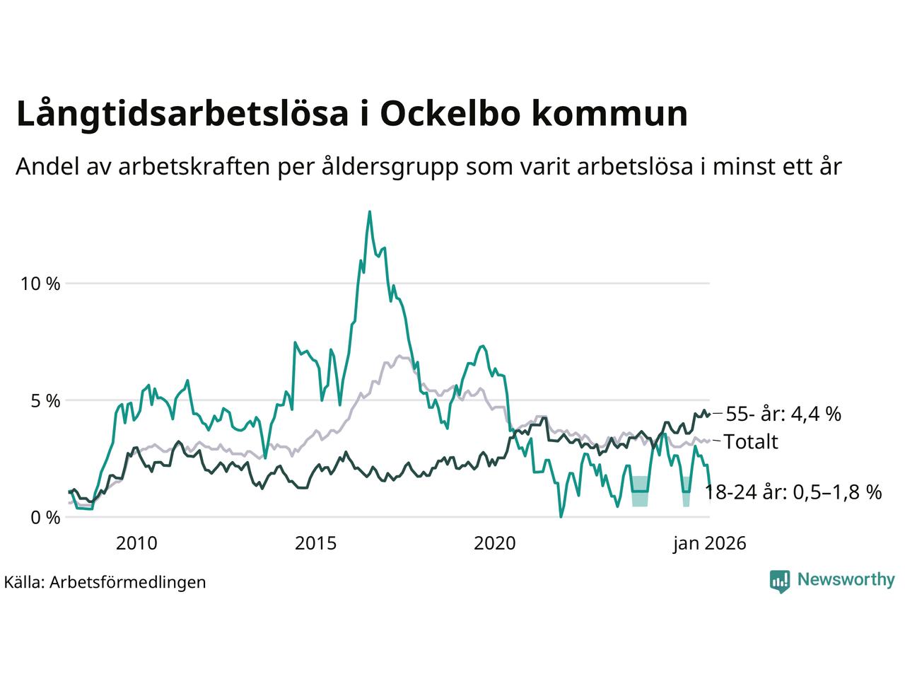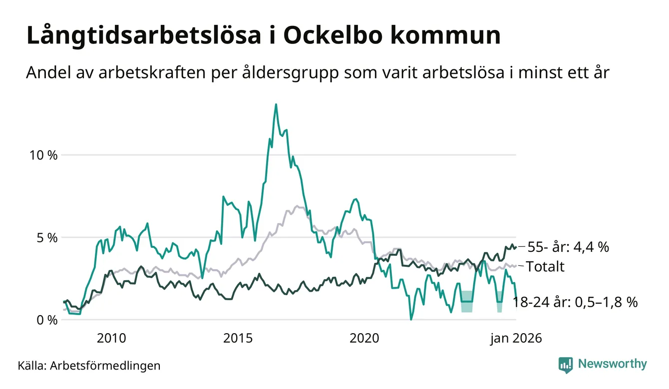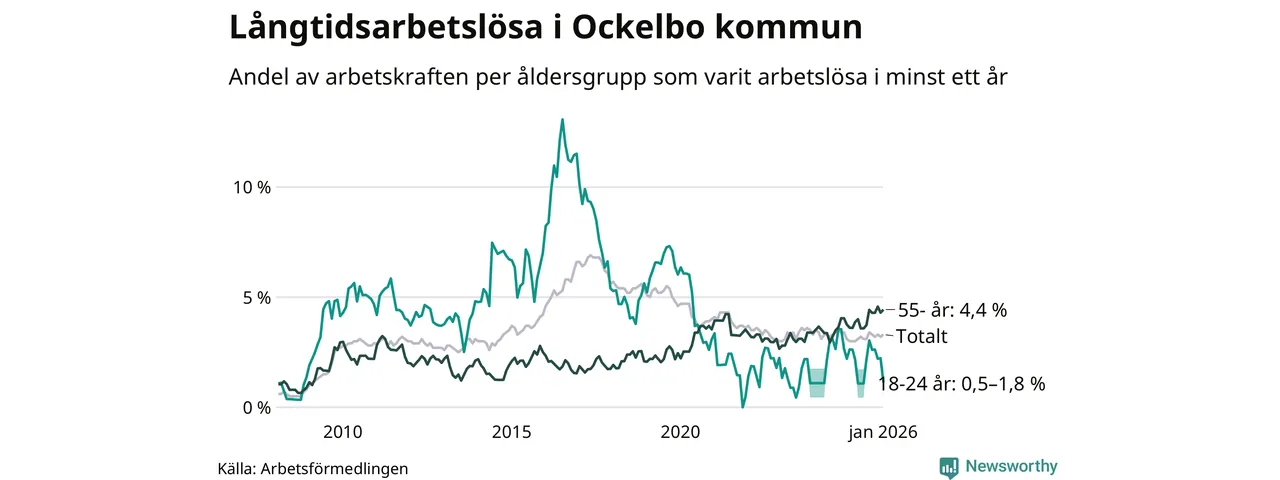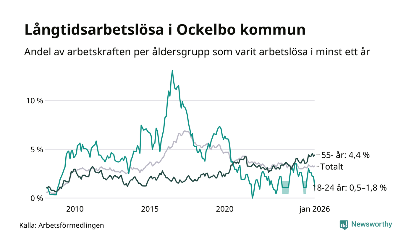 Av de 83 personerna som varit arbetslösa i mer än ett år i Ockelbo kommun är 32 personer mellan 55 och 661 år och mellan en och fyra är mellan 18 och 24 år. För den äldre gruppen är andelen arbetslösa 4,4 procent medan den i den yngre gruppen är mellan 0,5 och 1,8 procent. Även i riket som helhet är långtidsarbetslösheten högre i gruppen äldre.