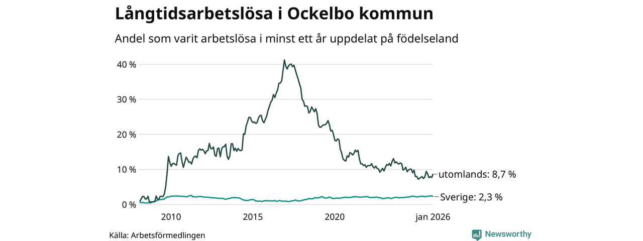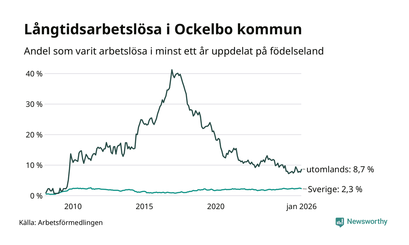 49 av de långtidsarbetslösa i Ockelbo är födda i Sverige, medan 34 är födda utomlands. Det innebär att långtidsarbetslösheten bland Sverigefödda är 2,3 procent, medan den är fyra gånger så hög – 8,7 procent – bland födda utomlands. Även i riket som helhet är arbetslösheten högre bland utrikesfödda.