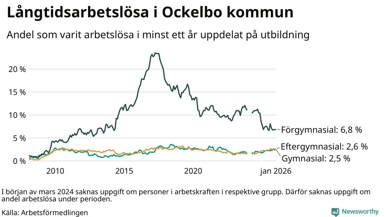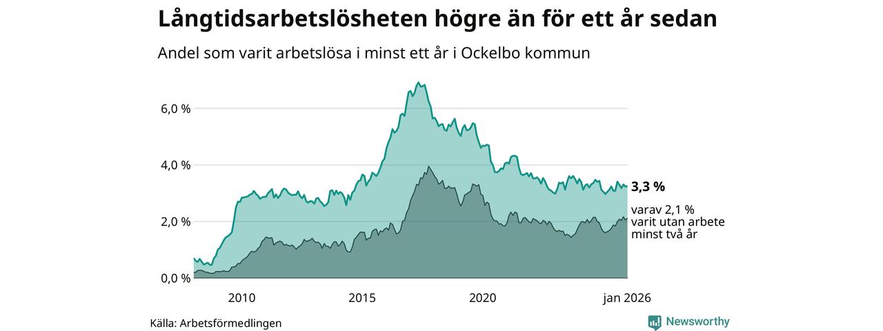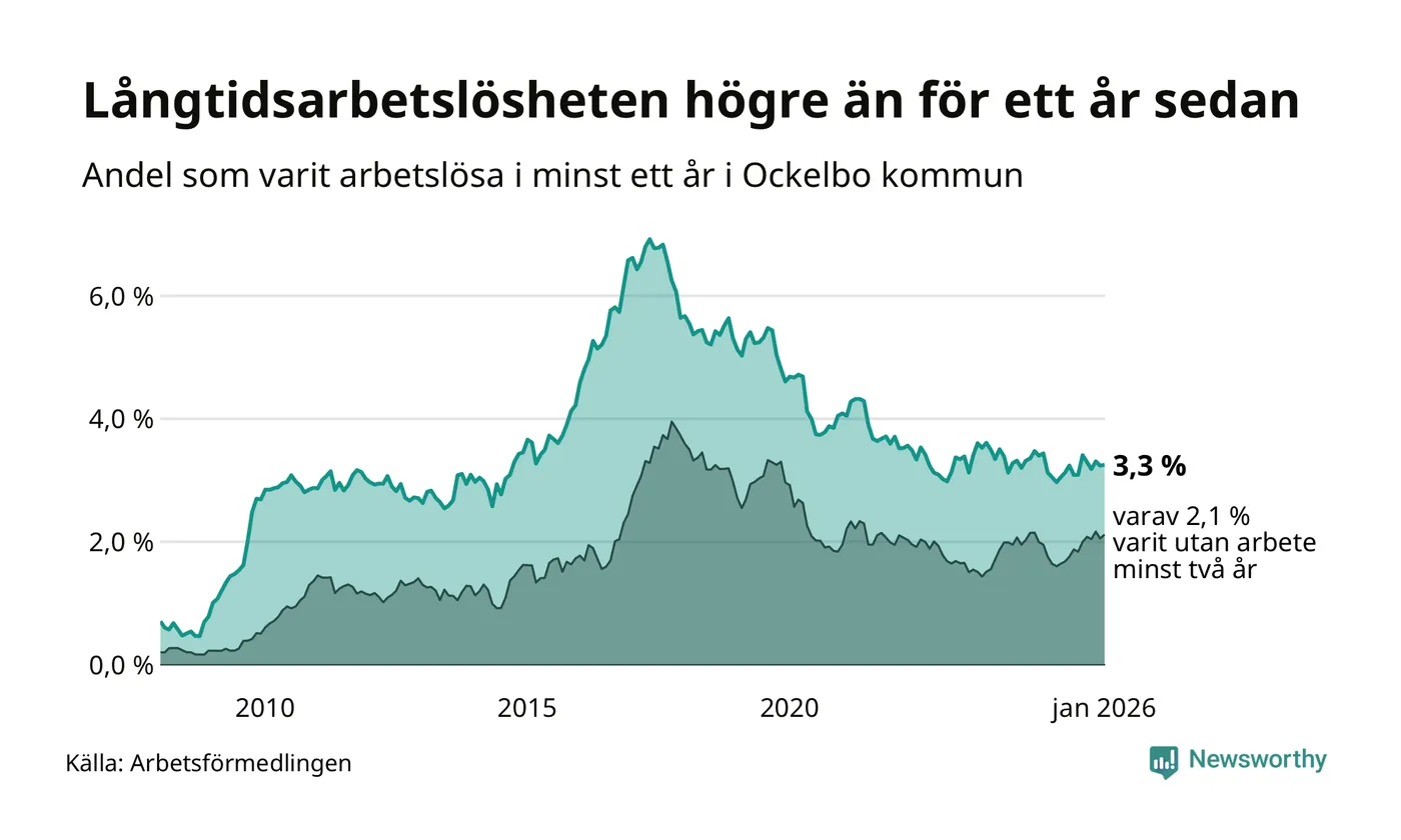 I januari hade 83 Ockelbobor varit arbetslösa i minst ett år, vilket är en fler än månaden innan. 83 personer motsvarar 3,3 procent av arbetskraften i kommunen – andelen långtidsarbetslösa är 0,3 procentenheter högre än samma månad för ett år sedan.