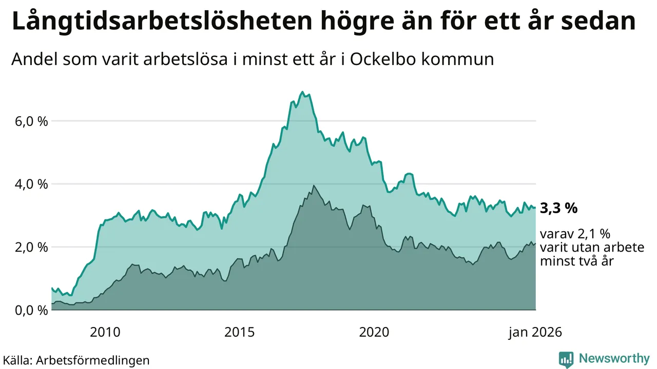 Andelen som varit utan arbete i minst ett år i Ockelbo var högre i januari jämfört med samma månad för ett år sedan. Det visar Arbetsfömedlingens senaste månadsstatistik.