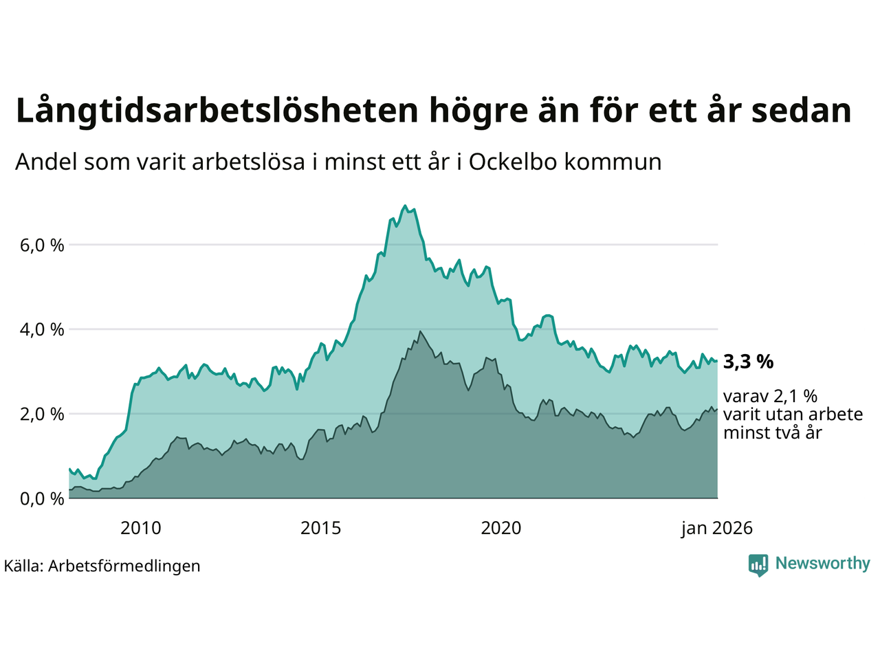 | Andel arbetslösa i minst ett år | 3,3 % | 3,8 % | 2,9 % |