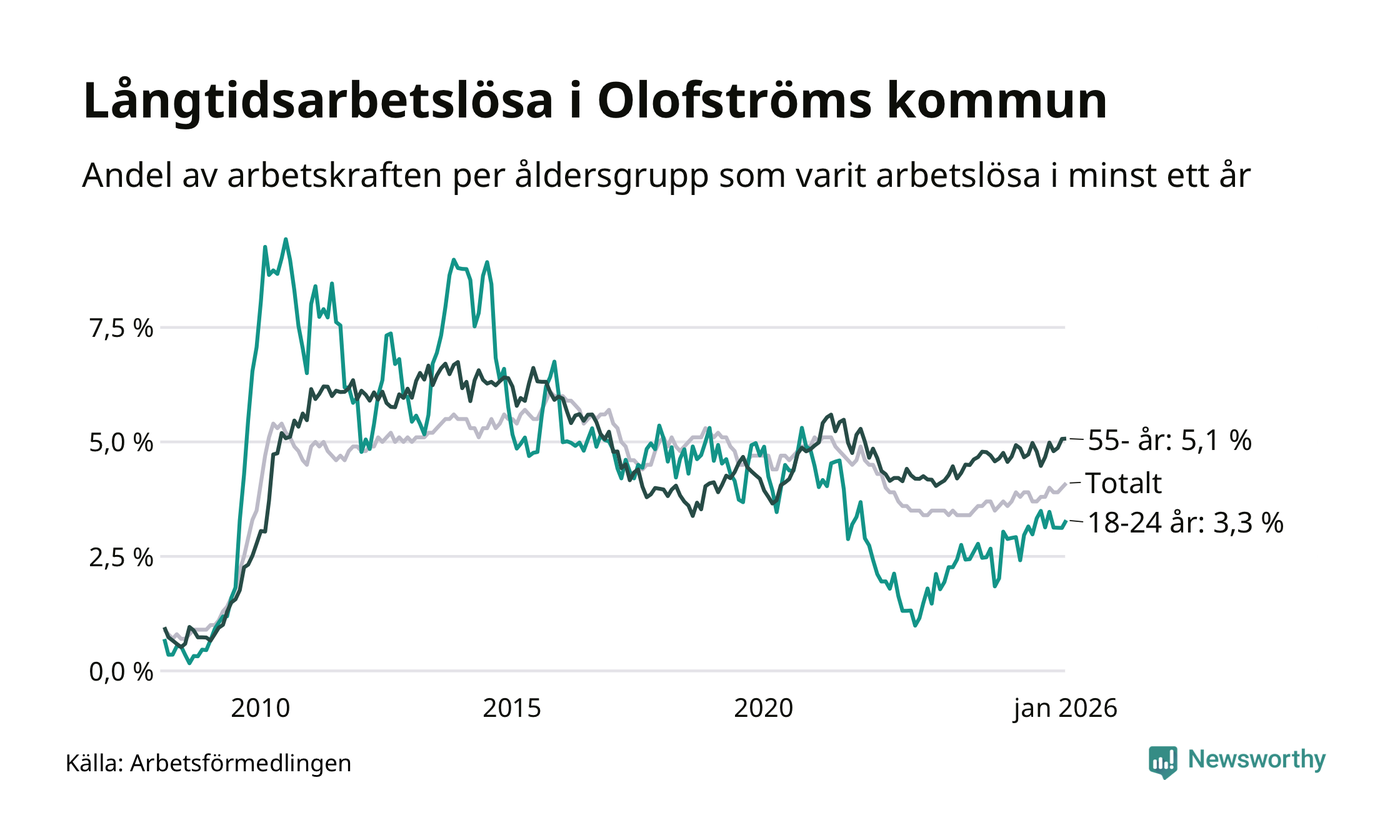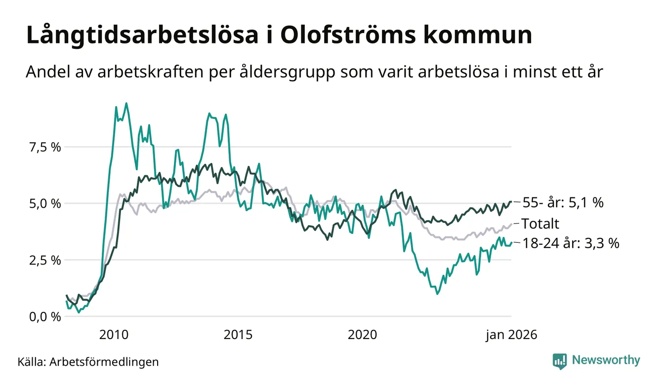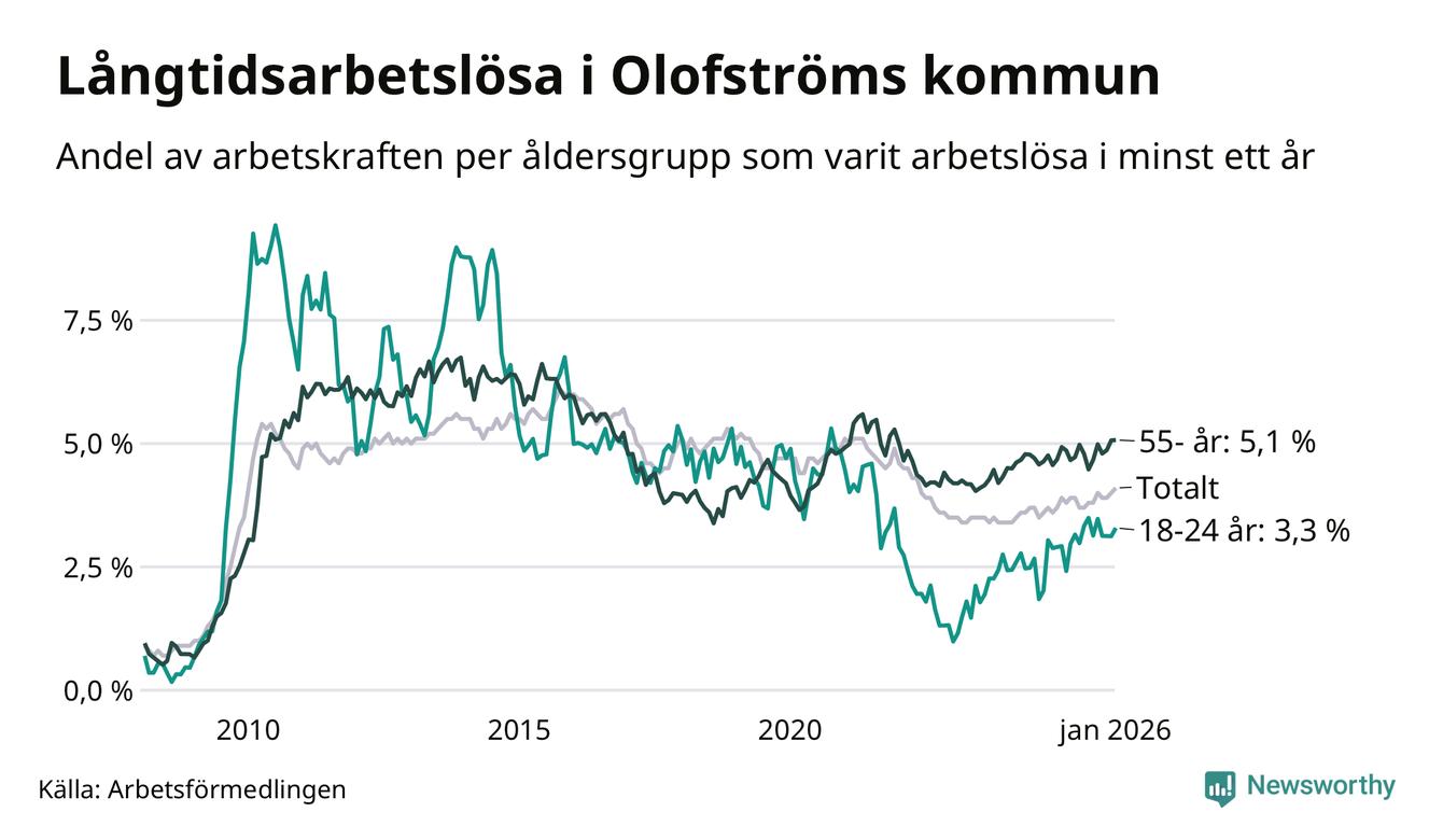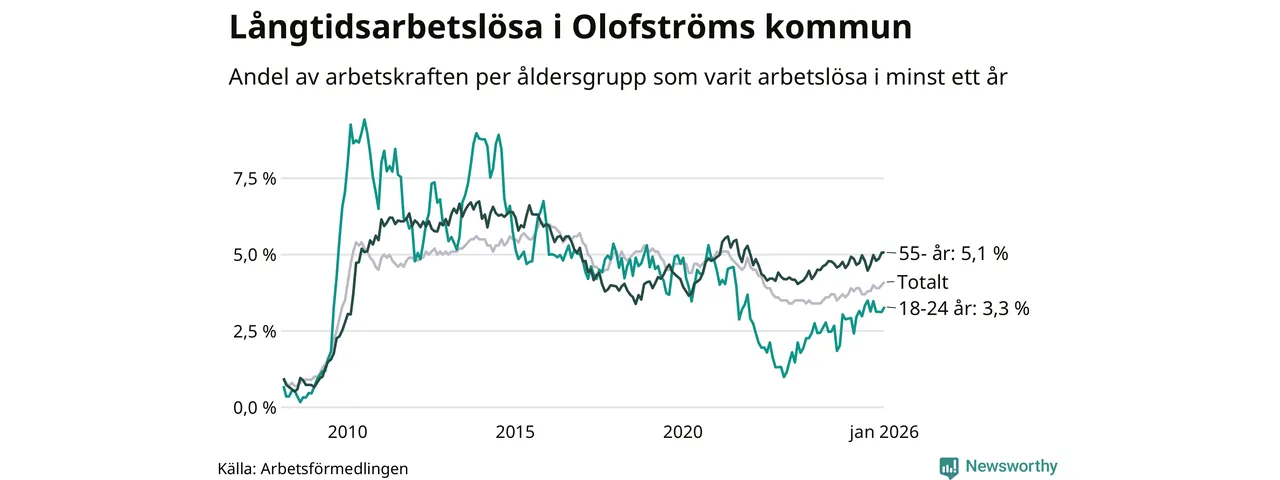 Av de 243 personerna som varit arbetslösa i mer än ett år i Olofströms kommun är 80 personer mellan 55 och 661 år och 19 är mellan 18 och 24 år. För den äldre gruppen är andelen arbetslösa 5,1 procent medan den i den yngre gruppen är 3,3 procent. Även i riket som helhet är långtidsarbetslösheten högre i gruppen äldre.