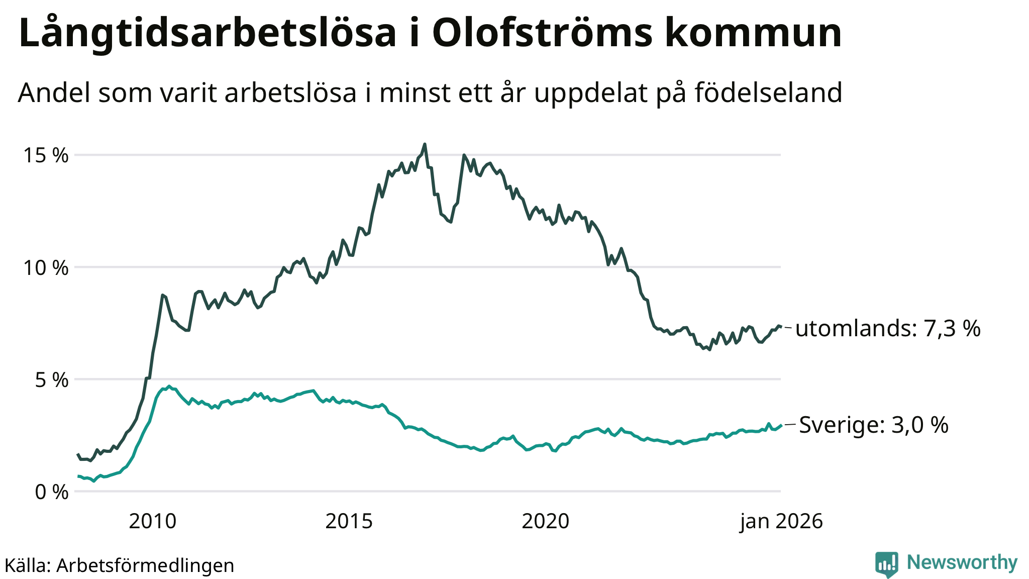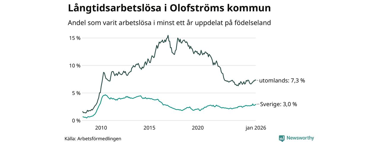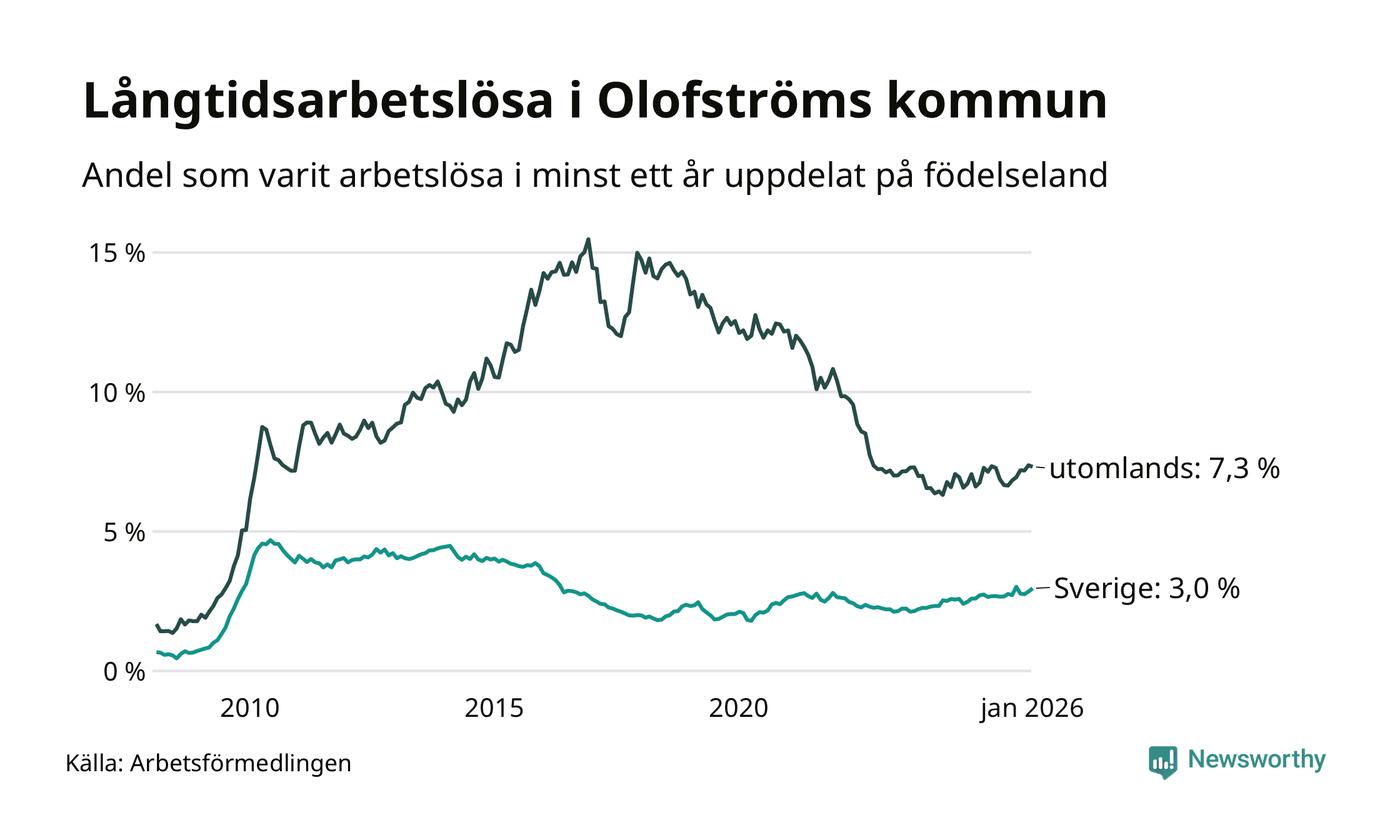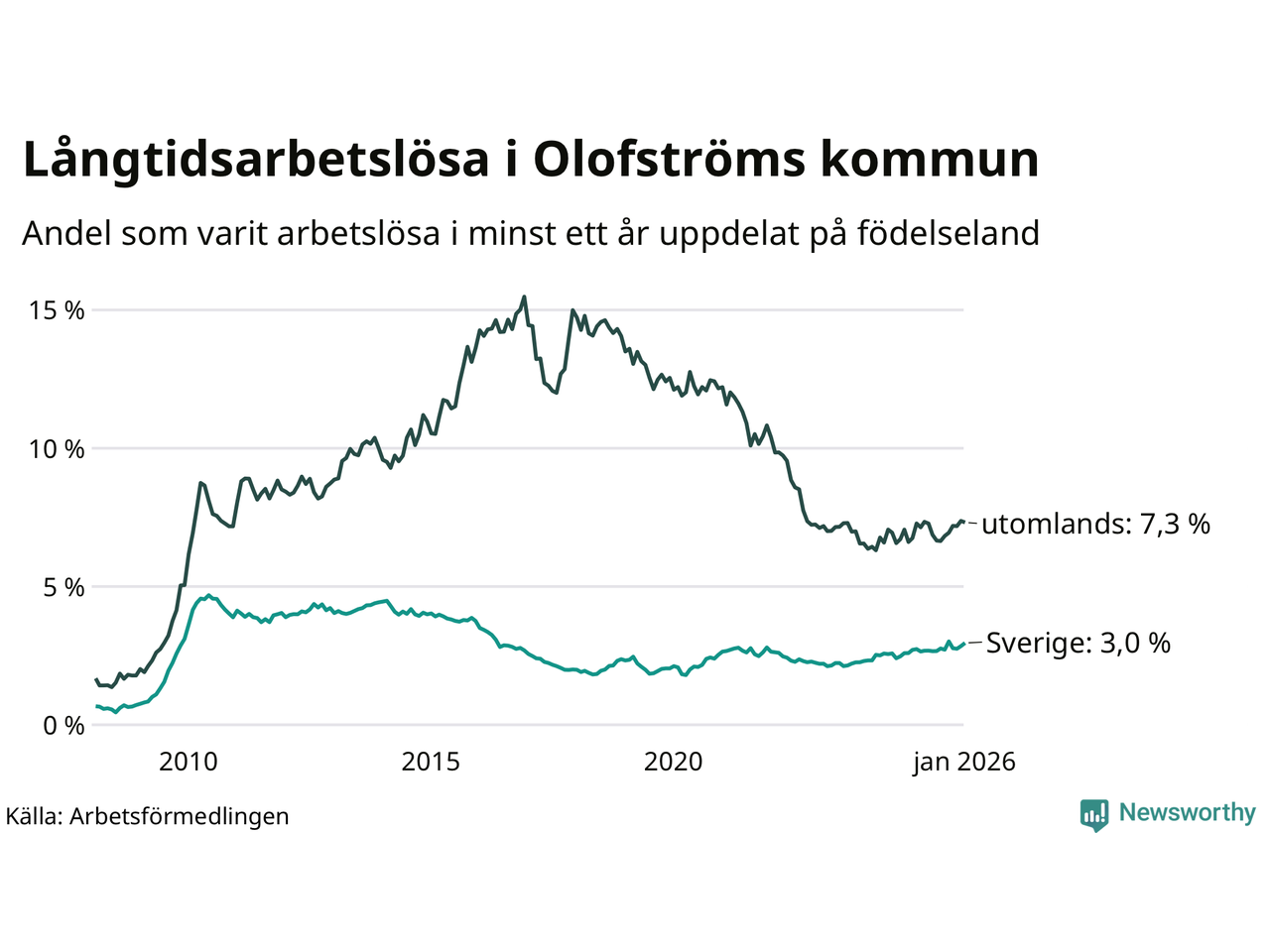 130 av de långtidsarbetslösa i Olofström är födda i Sverige, medan 113 är födda utomlands. Det innebär att långtidsarbetslösheten bland Sverigefödda är 3,0 procent, medan den är två gånger så hög – 7,3 procent – bland födda utomlands. Även i riket som helhet är arbetslösheten högre bland utrikesfödda.