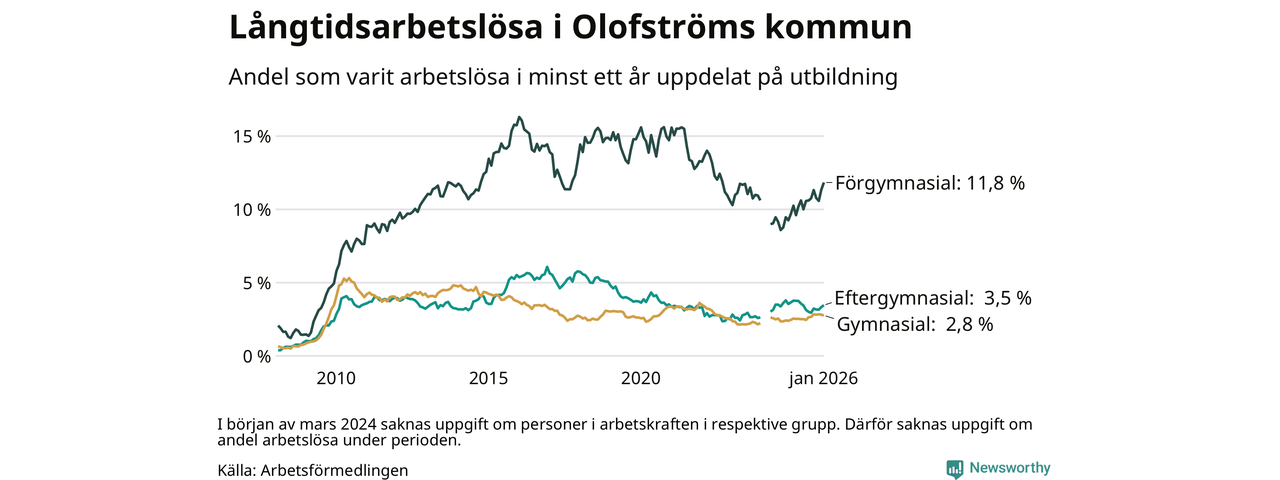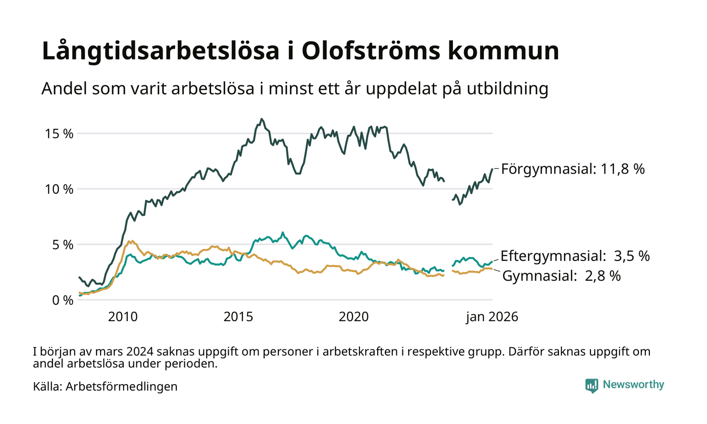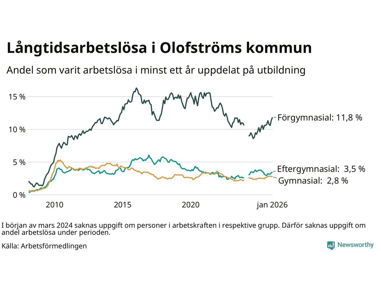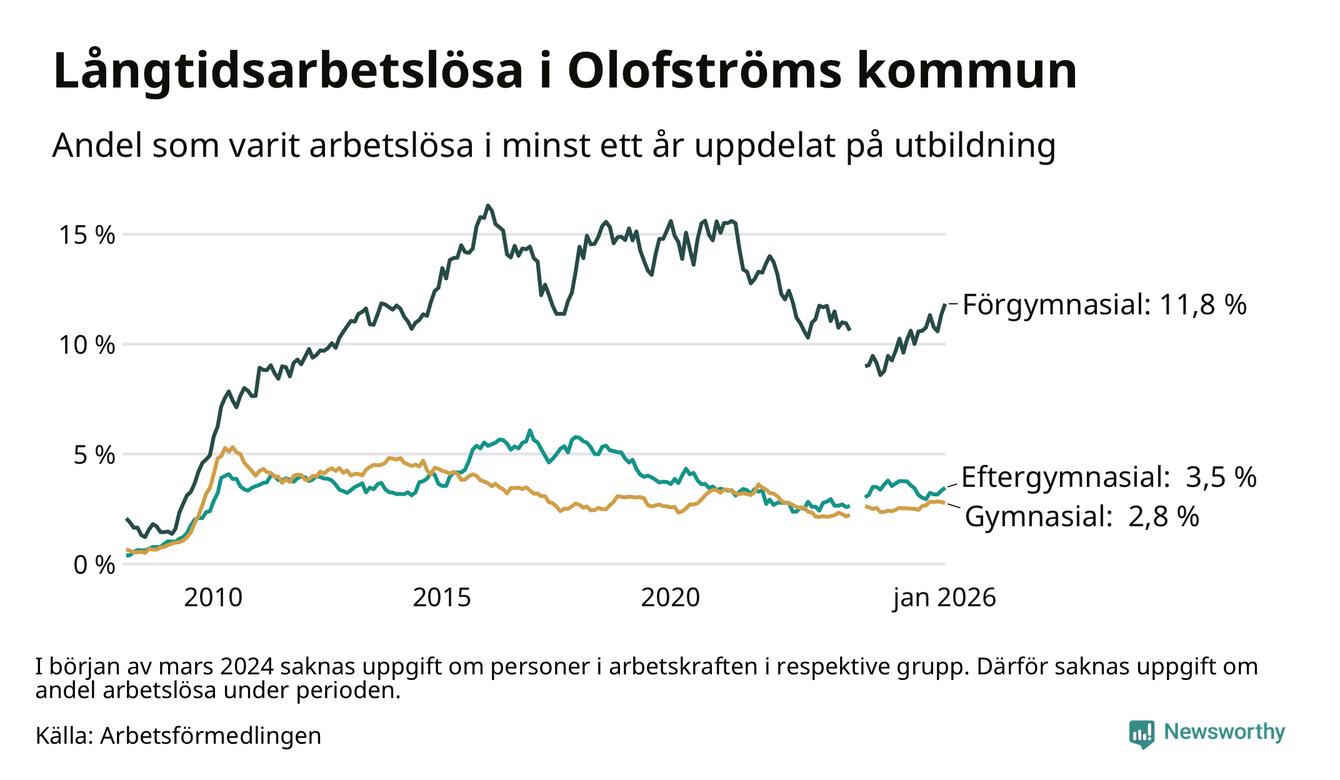 Inte sedan maj 2022 har andelen långtidsarbetslösa varit så hög i Olofström. Det visar Arbetsförmedlingens senaste månadsstatistik.