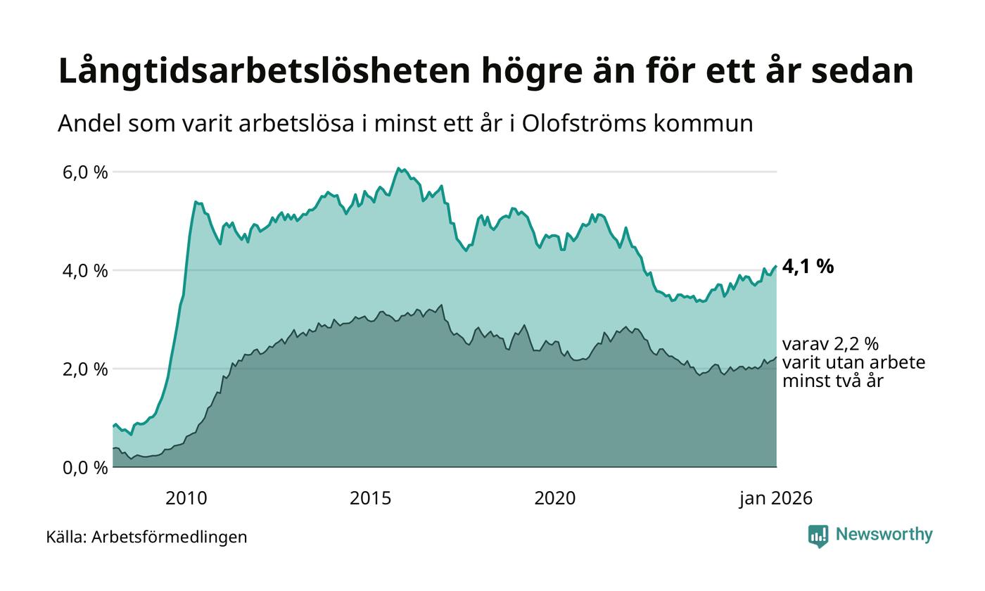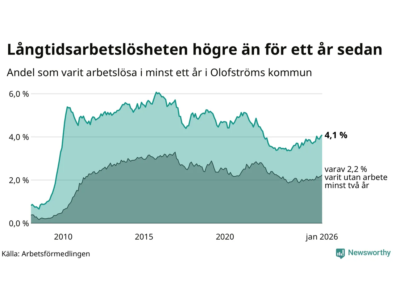 I januari hade 243 Olofströmsbor varit arbetslösa i minst ett år, vilket är sex fler än månaden innan. 243 personer motsvarar 4,1 procent av arbetskraften i kommunen – andelen långtidsarbetslösa är 0,2 procentenheter högre än samma månad för ett år sedan.
