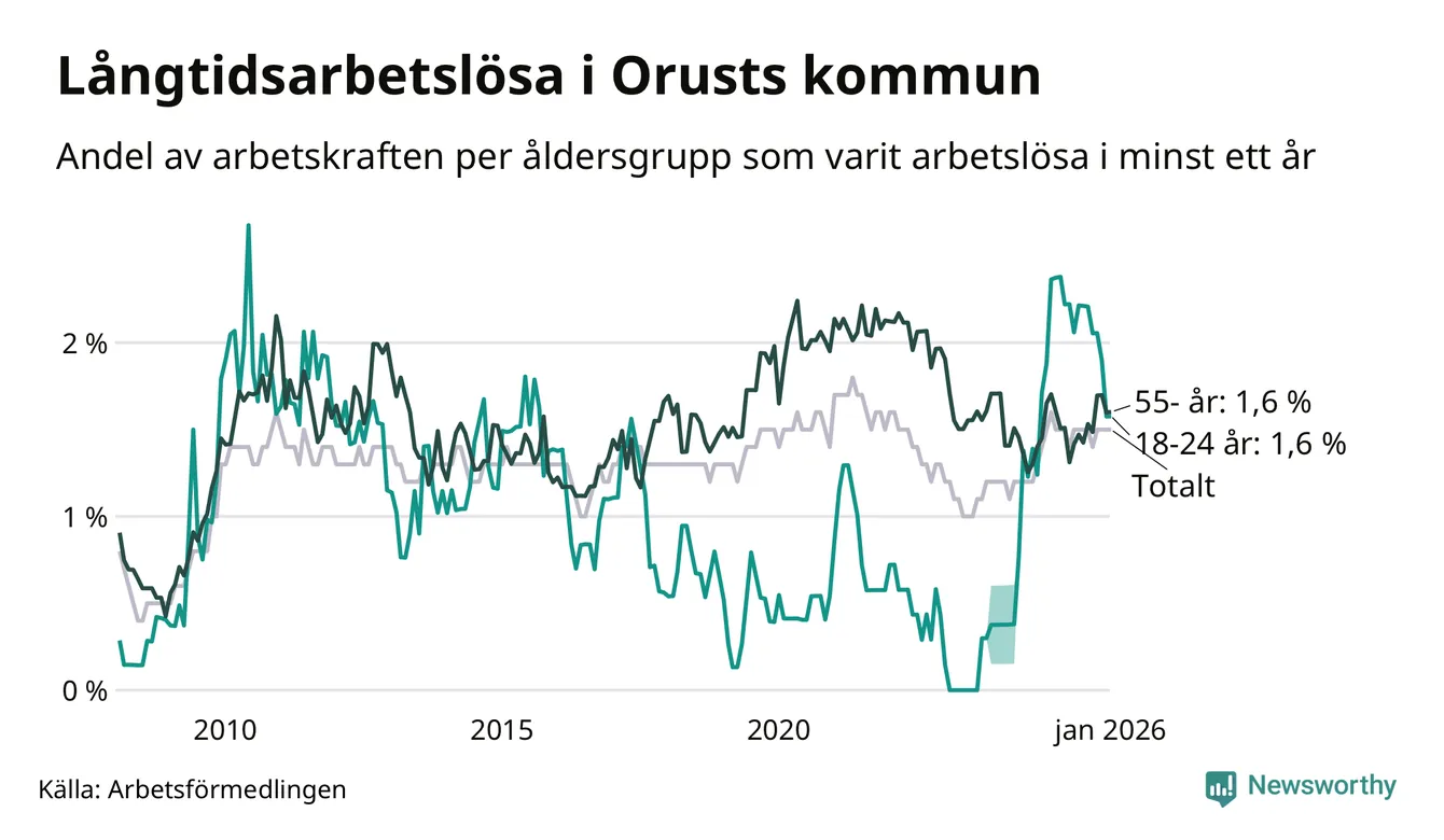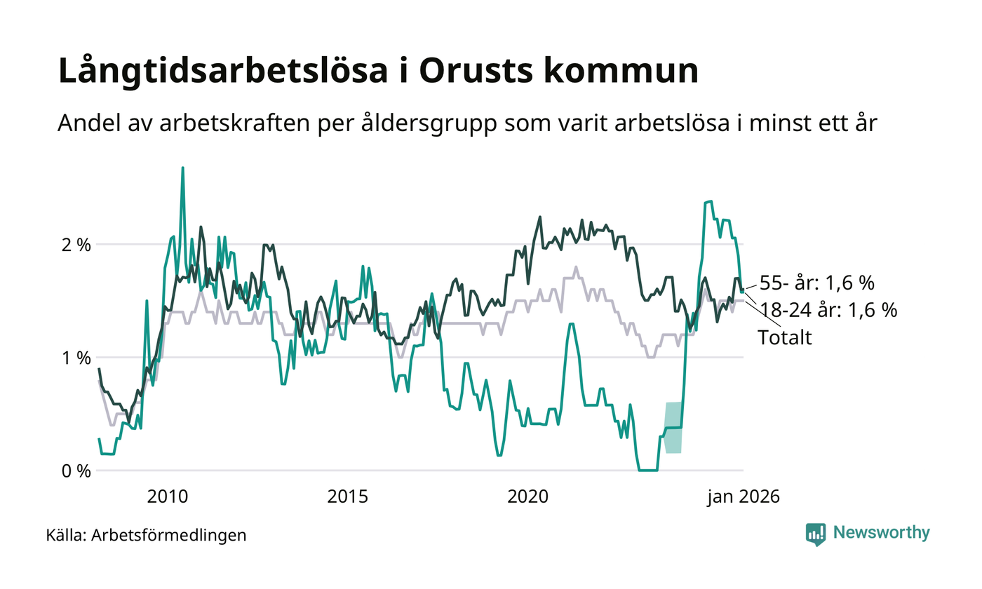 Av de 101 personerna som varit arbetslösa i mer än ett år i Orusts kommun är 31 personer mellan 55 och 661 år och tio är mellan 18 och 24 år. För den äldre gruppen är andelen arbetslösa 1,6 procent medan den i den yngre gruppen är 1,6 procent. Även i riket som helhet är långtidsarbetslösheten högre i gruppen äldre.