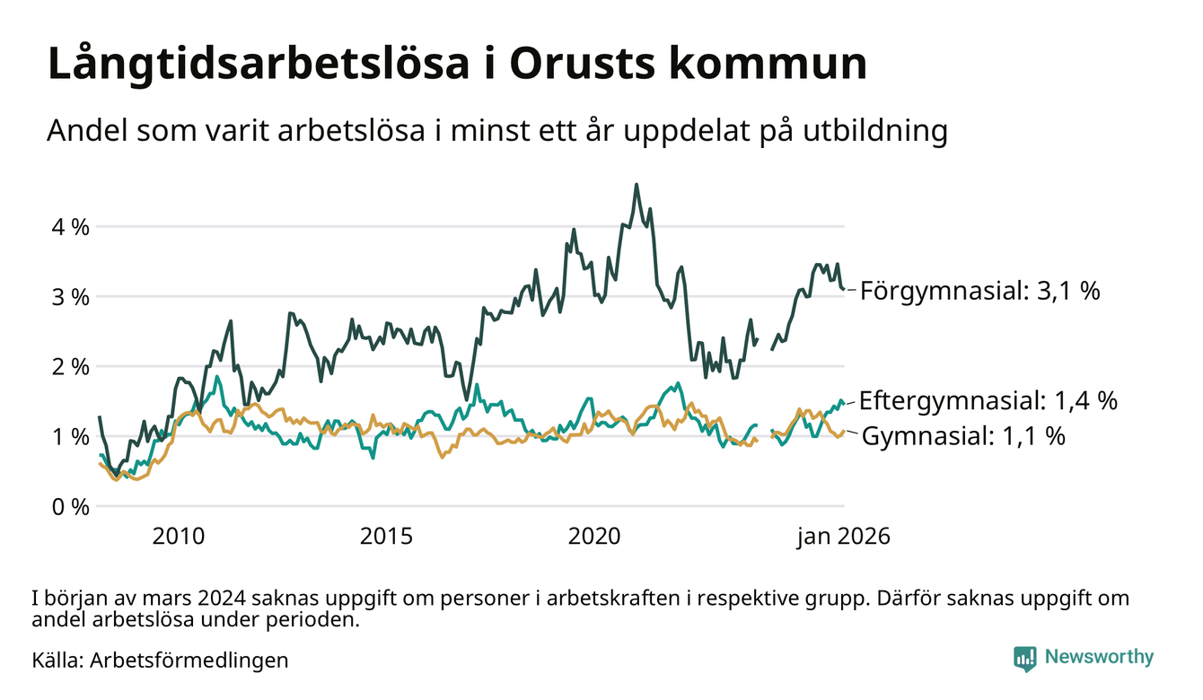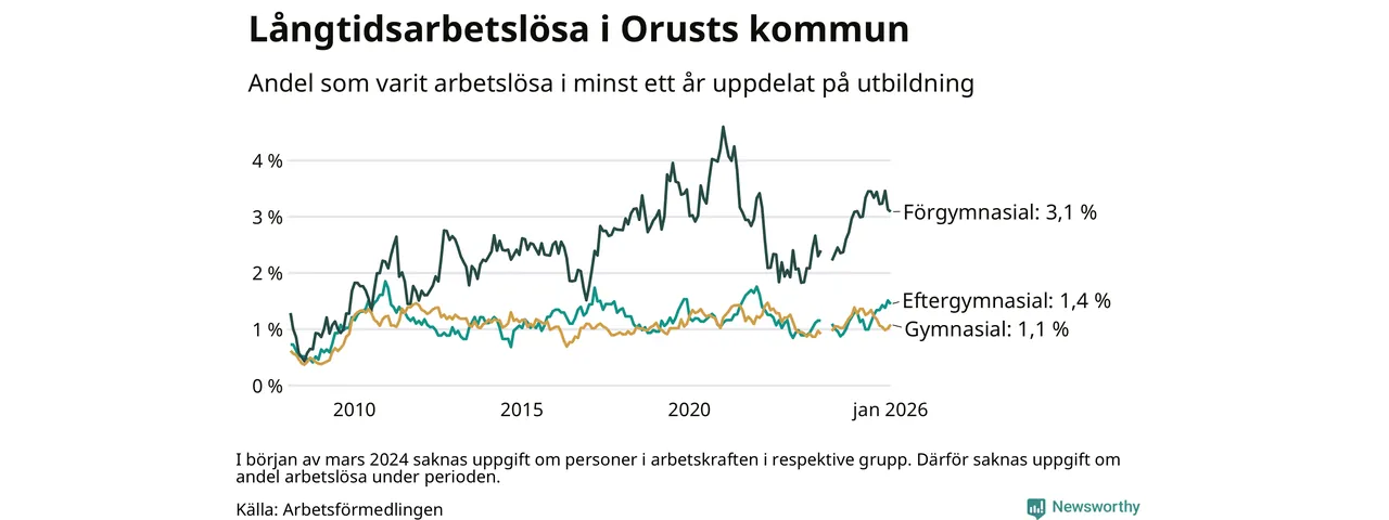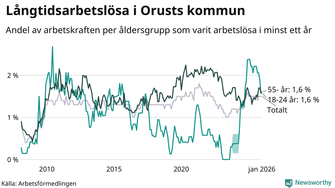 I januari hade 101 Orustbor varit arbetslösa i minst ett år, vilket är två fler än månaden innan. 101 personer motsvarar 1,5 procent av arbetskraften i kommunen – andelen långtidsarbetslösa är ungefär på samma nivå som för ett år sedan.