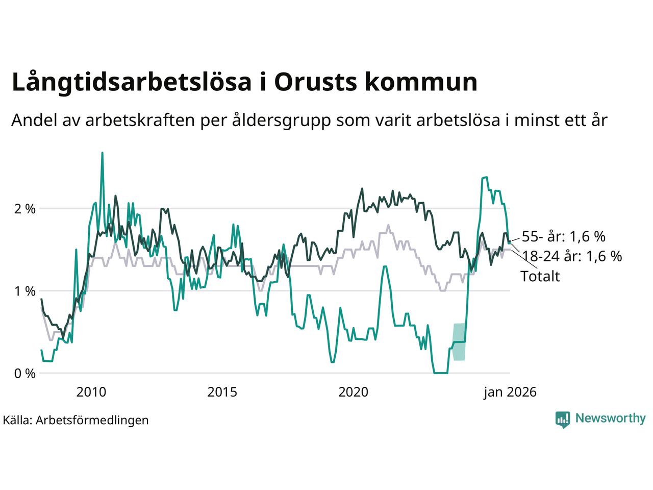| Andel arbetslösa i minst två år | 0,7 % | 1,3 % | 1,6 % |