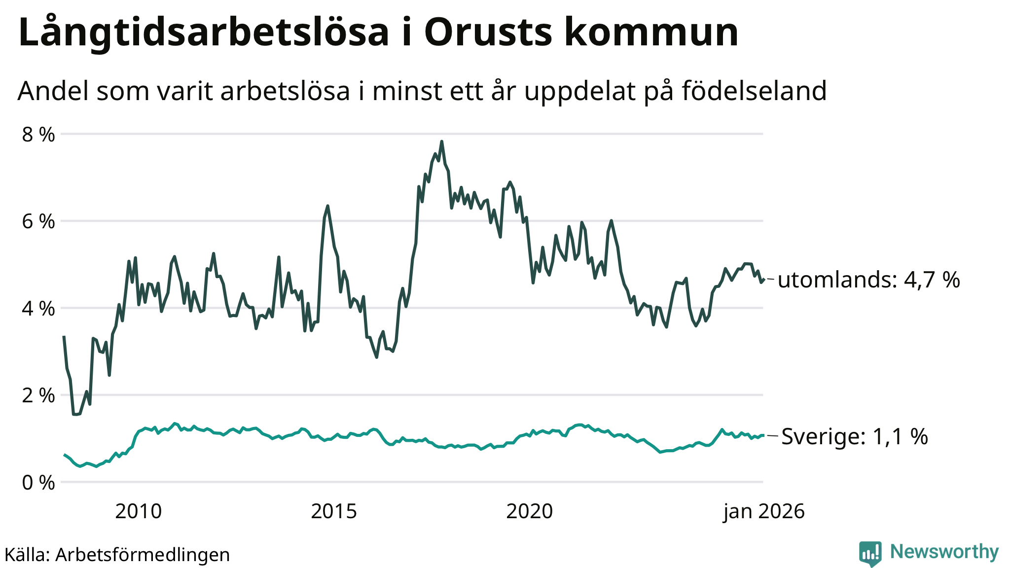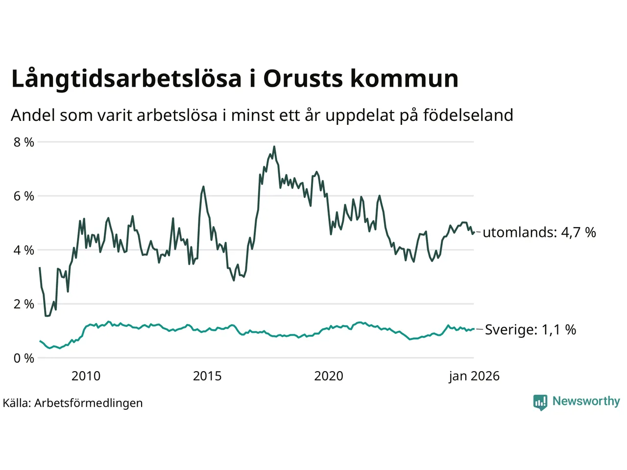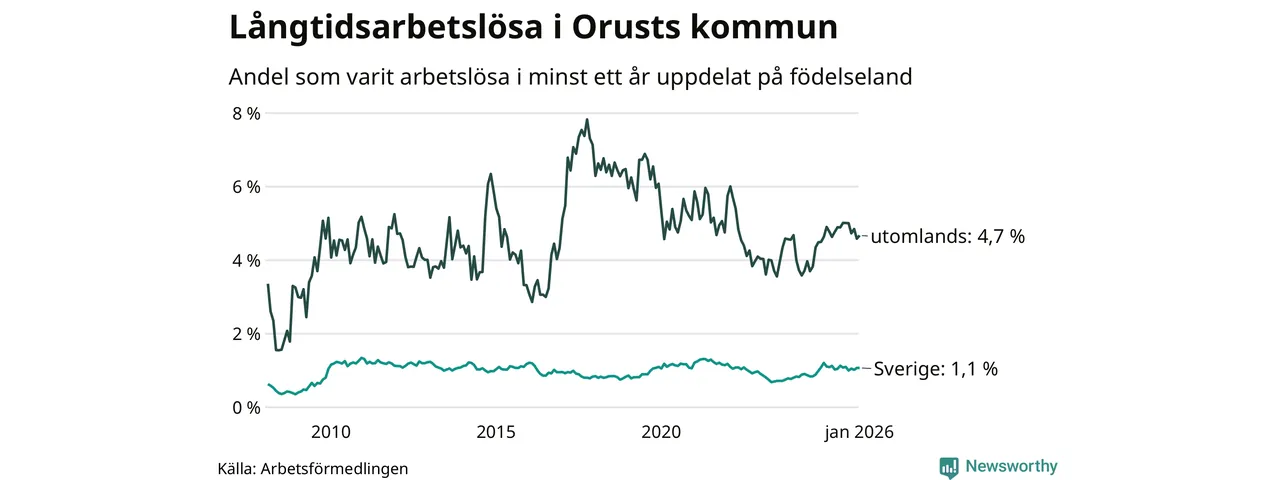 65 av de långtidsarbetslösa på Orust är födda i Sverige, medan 36 är födda utomlands. Det innebär att långtidsarbetslösheten bland Sverigefödda är 1,1 procent, medan den är fyra gånger så hög – 4,7 procent – bland födda utomlands. Även i riket som helhet är arbetslösheten högre bland utrikesfödda.