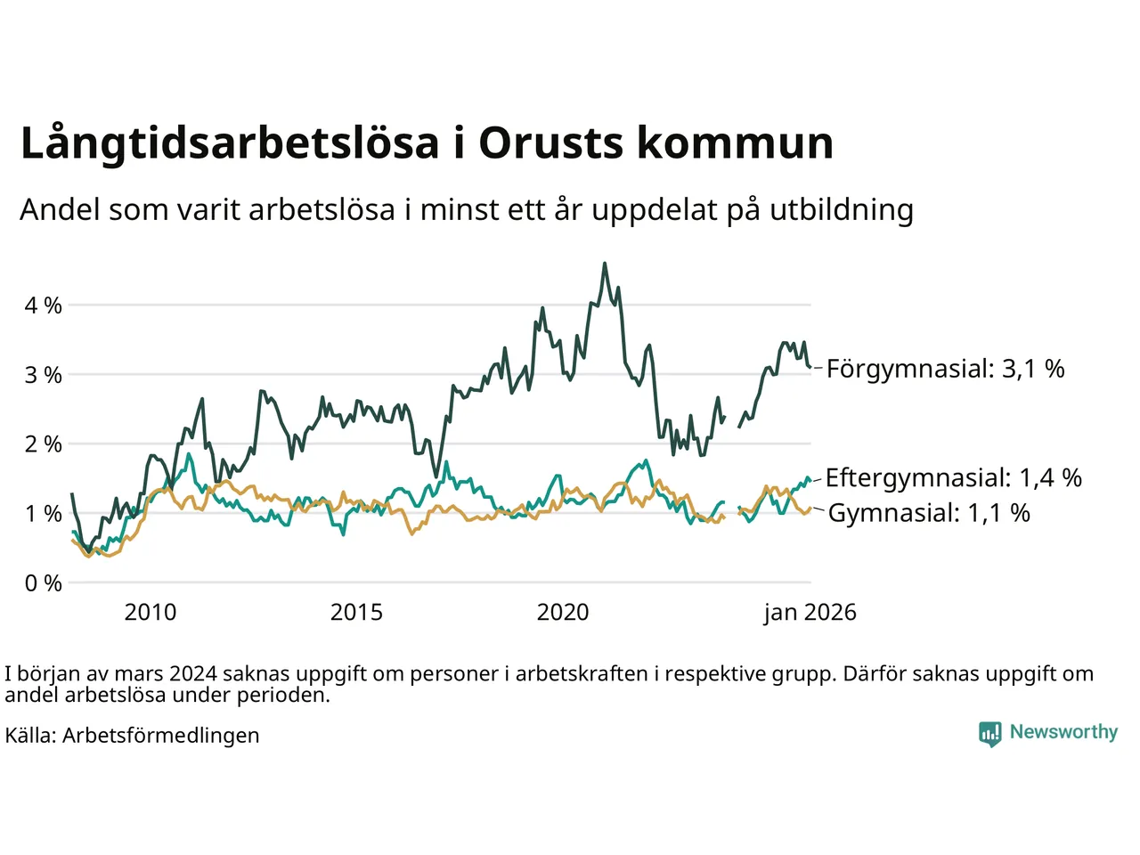 | Andel arbetslösa i minst ett år | 1,5 % | 2,5 % | 2,9 % |