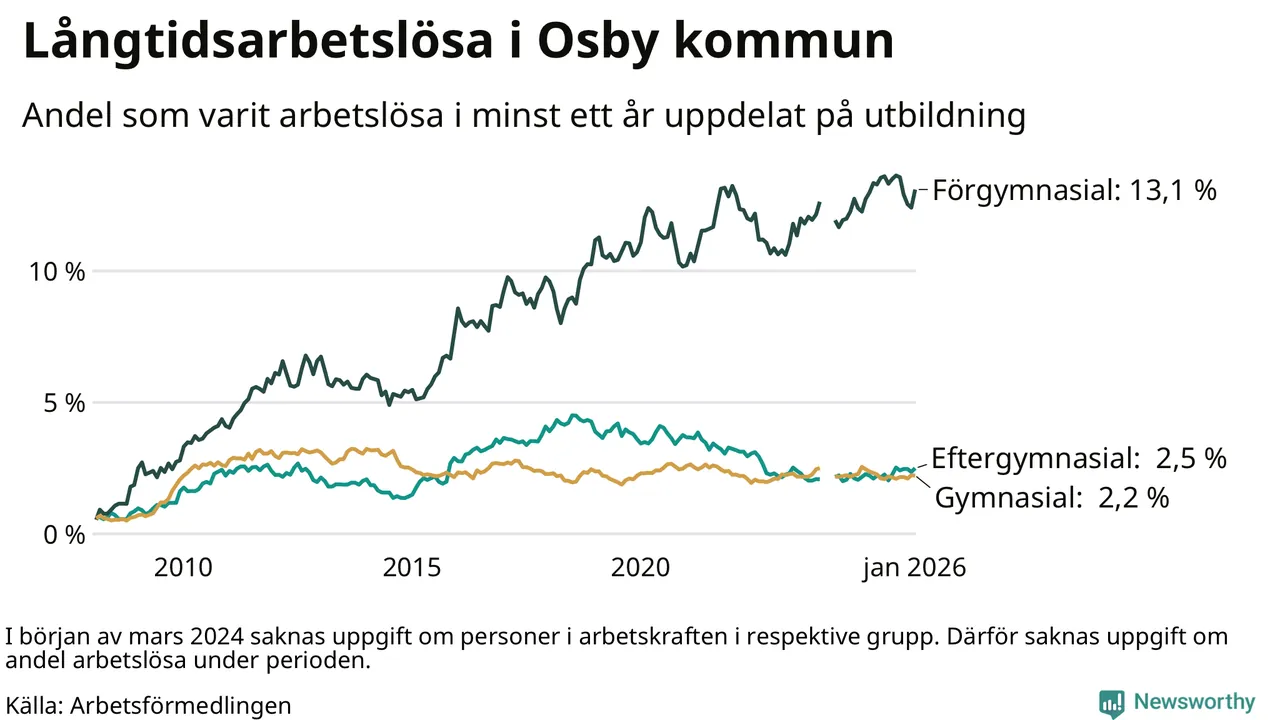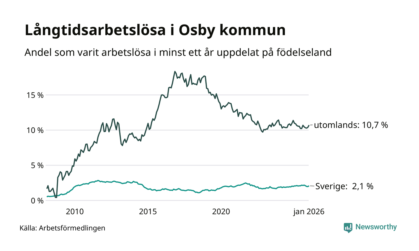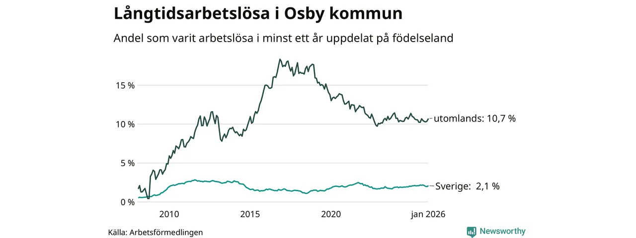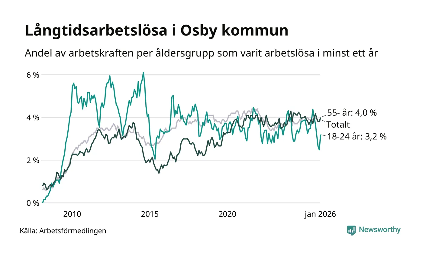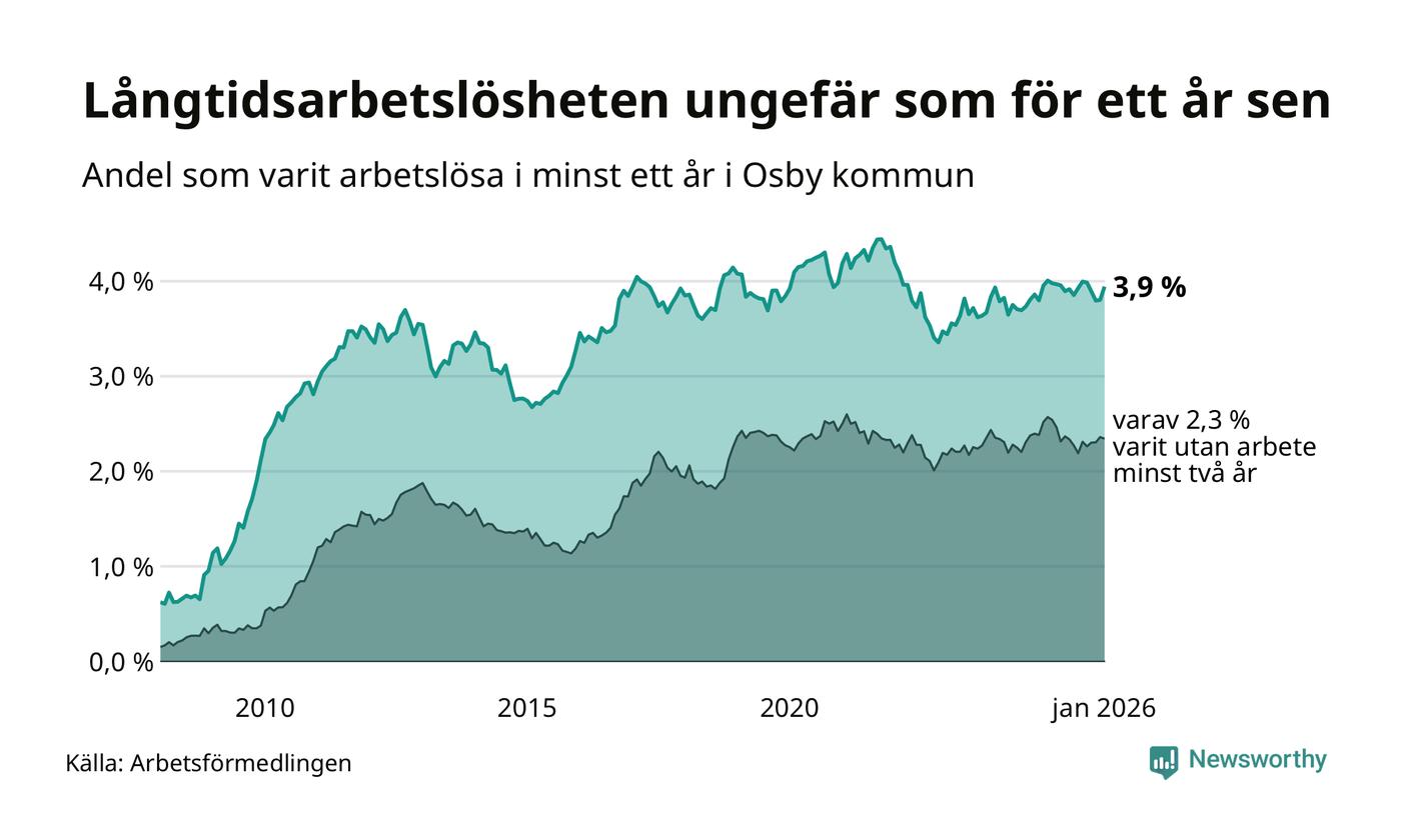 I januari hade 234 Osbybor varit arbetslösa i minst ett år, vilket är tio fler än månaden innan. Det är den första månaden sedan augusti 2025 som antalet arbetslösa ökar. 234 personer motsvarar 3,9 procent av arbetskraften i kommunen – andelen långtidsarbetslösa är ungefär på samma nivå som för ett år sedan.