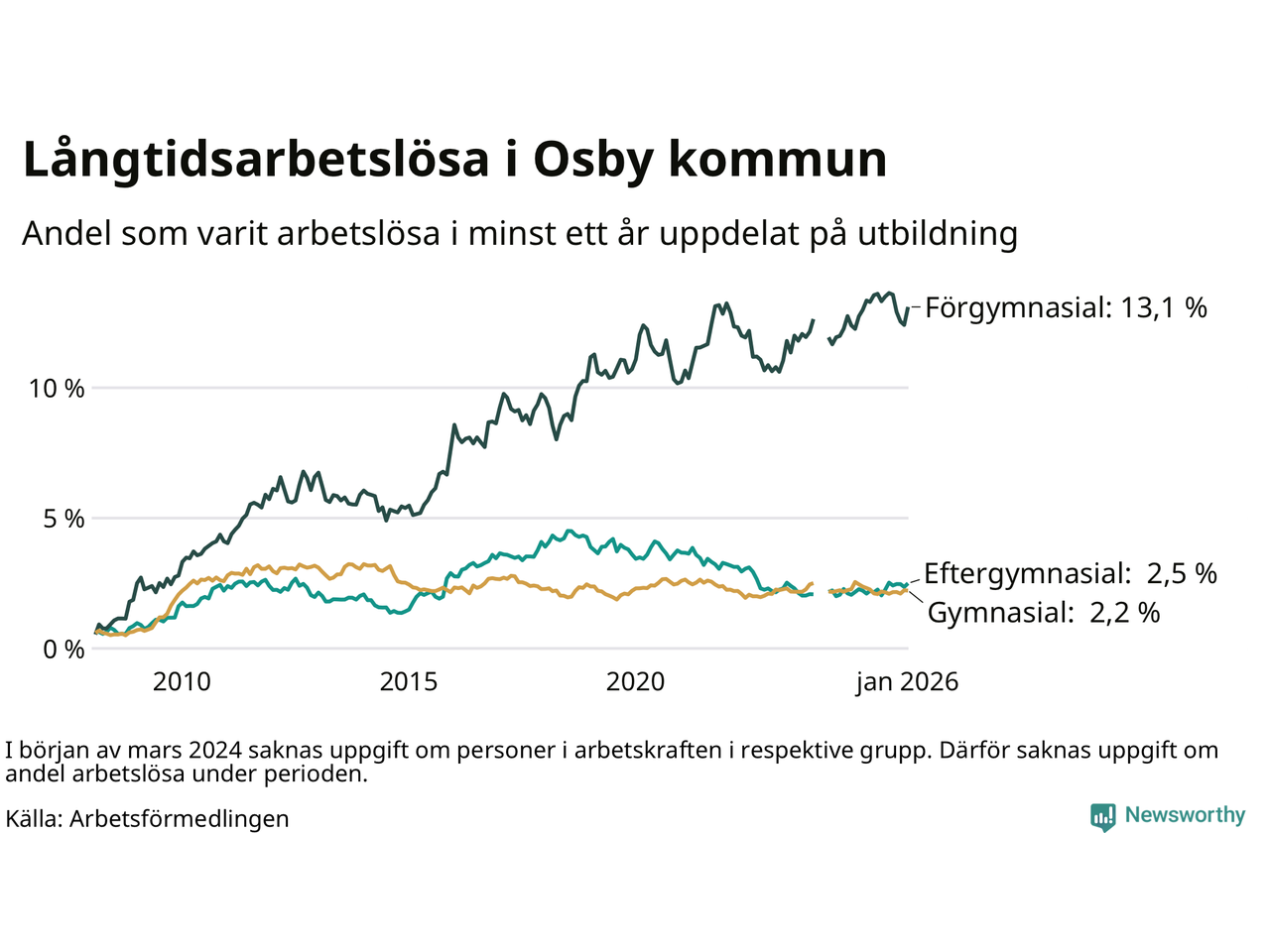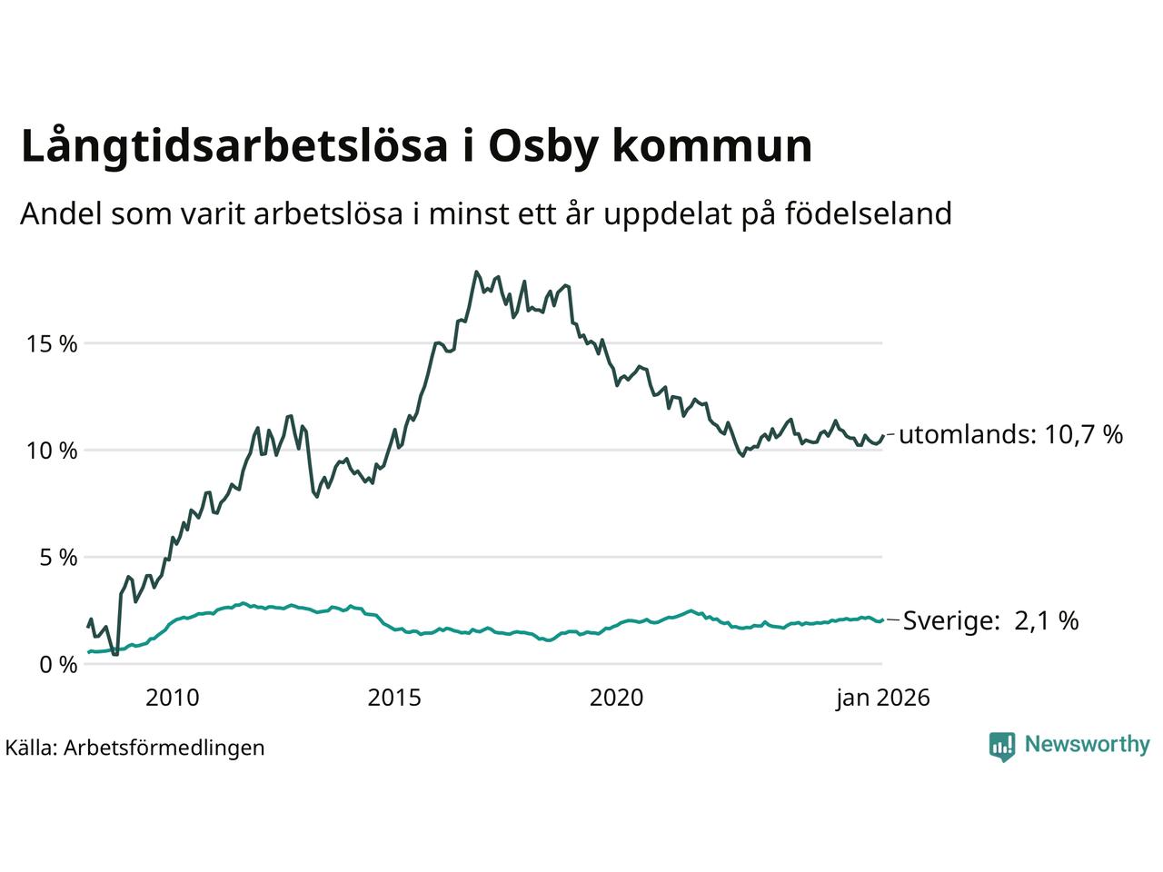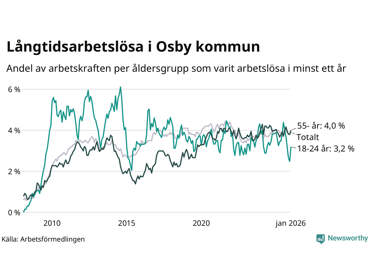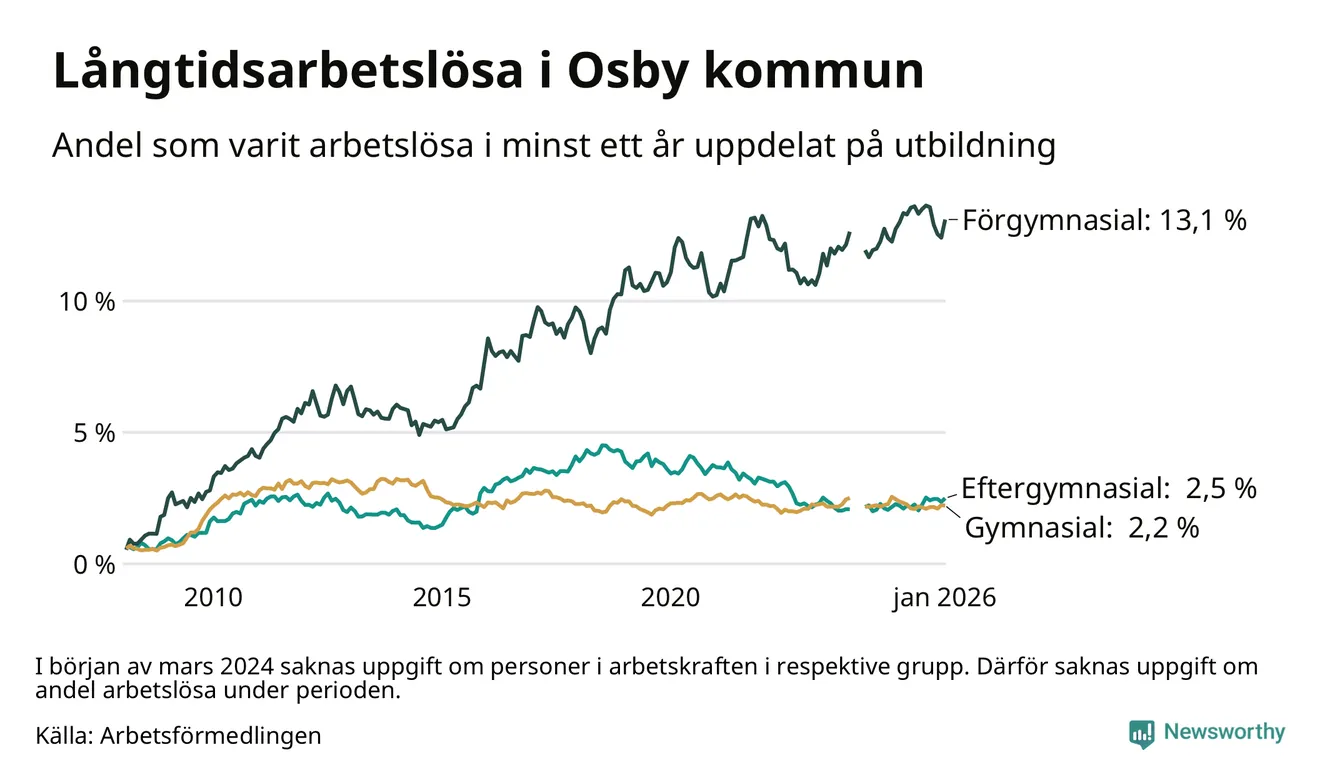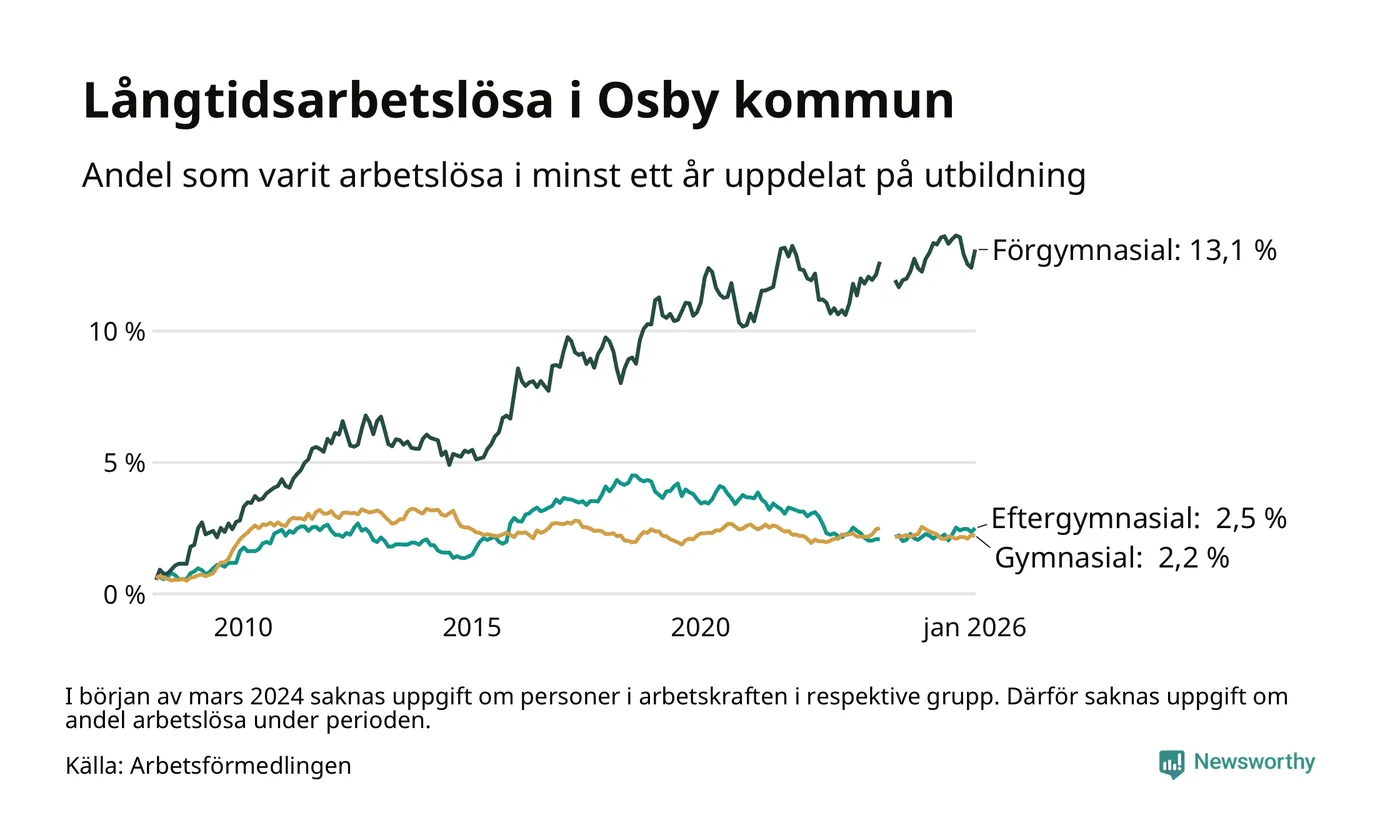 I januari hade 234 Osbybor varit arbetslösa i minst ett år, vilket är tio fler än månaden innan. Det är den första månaden sedan augusti 2025 som antalet arbetslösa ökar. 234 personer motsvarar 3,9 procent av arbetskraften i kommunen – andelen långtidsarbetslösa är ungefär på samma nivå som för ett år sedan.