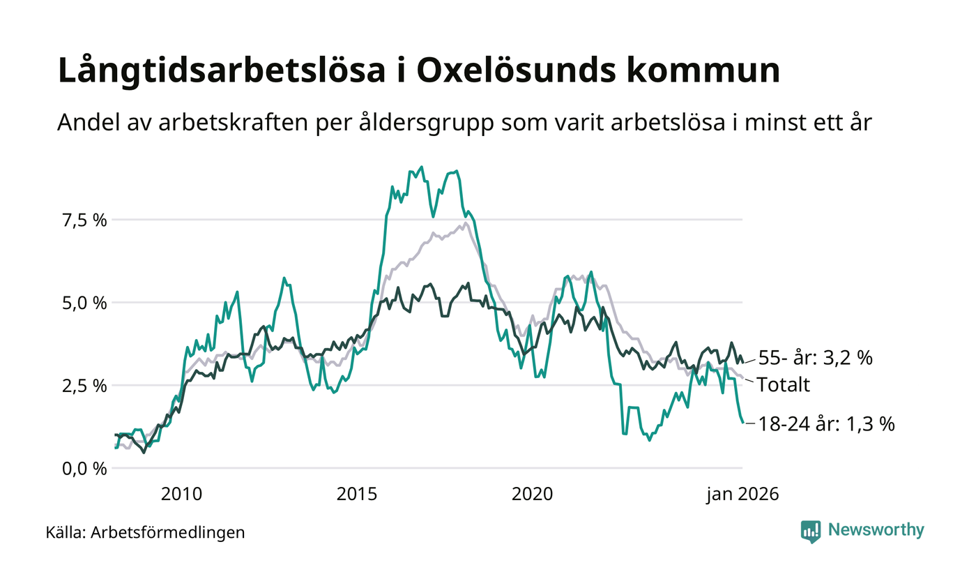 Av de 143 personerna som varit arbetslösa i mer än ett år i Oxelösunds kommun är 41 personer mellan 55 och 661 år och sex är mellan 18 och 24 år. För den äldre gruppen är andelen arbetslösa 3,2 procent medan den i den yngre gruppen är 1,3 procent. Även i riket som helhet är långtidsarbetslösheten högre i gruppen äldre.