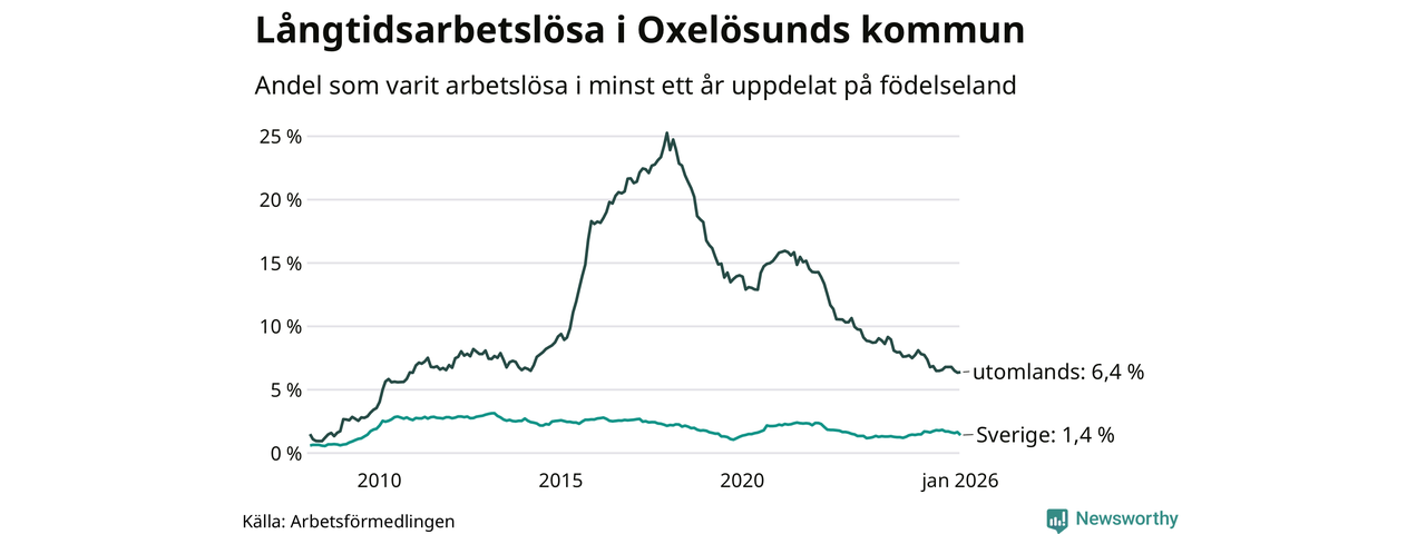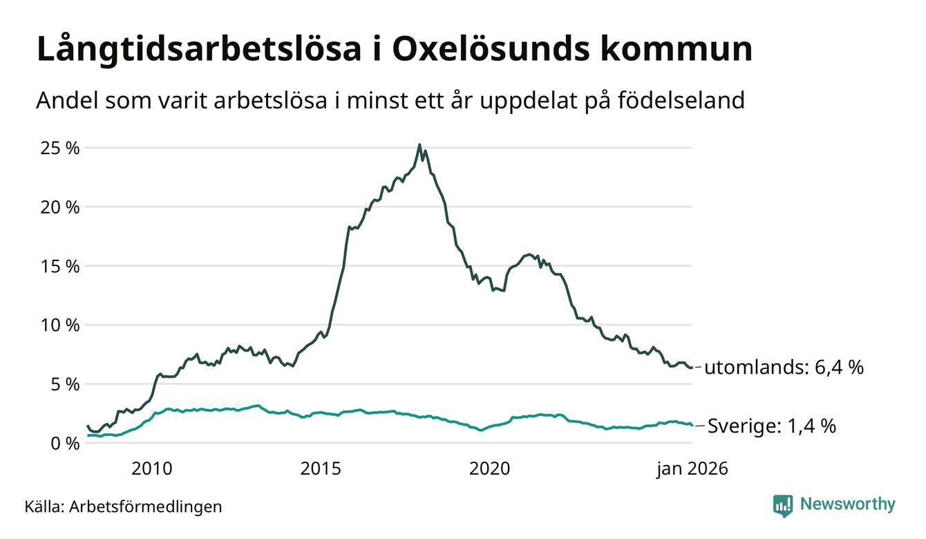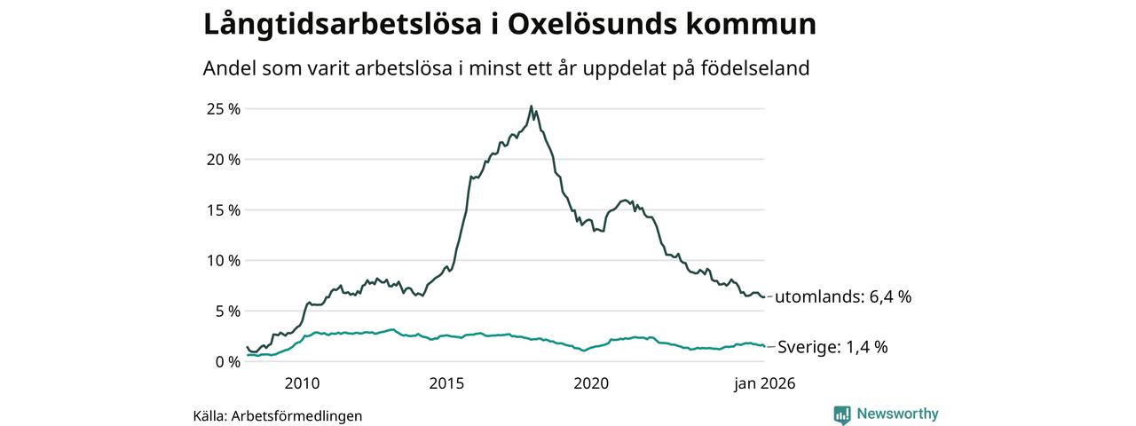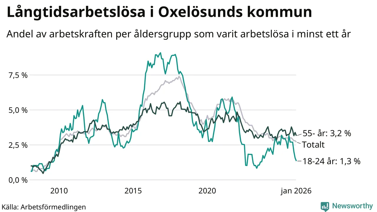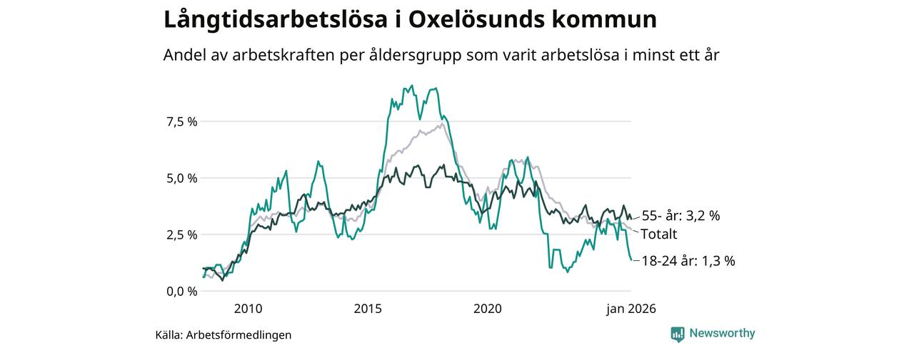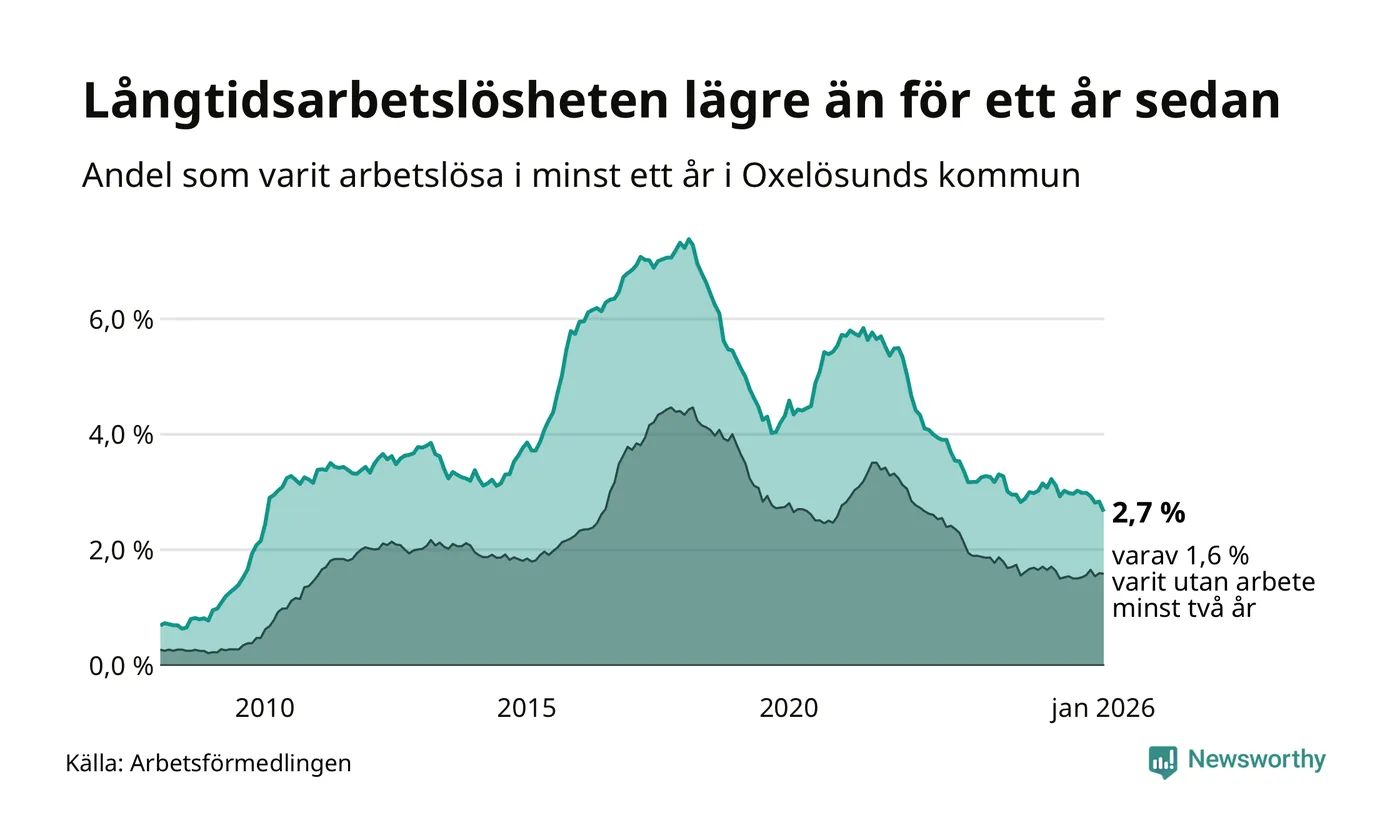 I januari hade 143 Oxelösundsbor varit arbetslösa i minst ett år, vilket är åtta färre än månaden innan. 143 personer motsvarar 2,7 procent av arbetskraften i kommunen – andelen långtidsarbetslösa är 0,5 procentenheter lägre än samma månad för ett år sedan.
