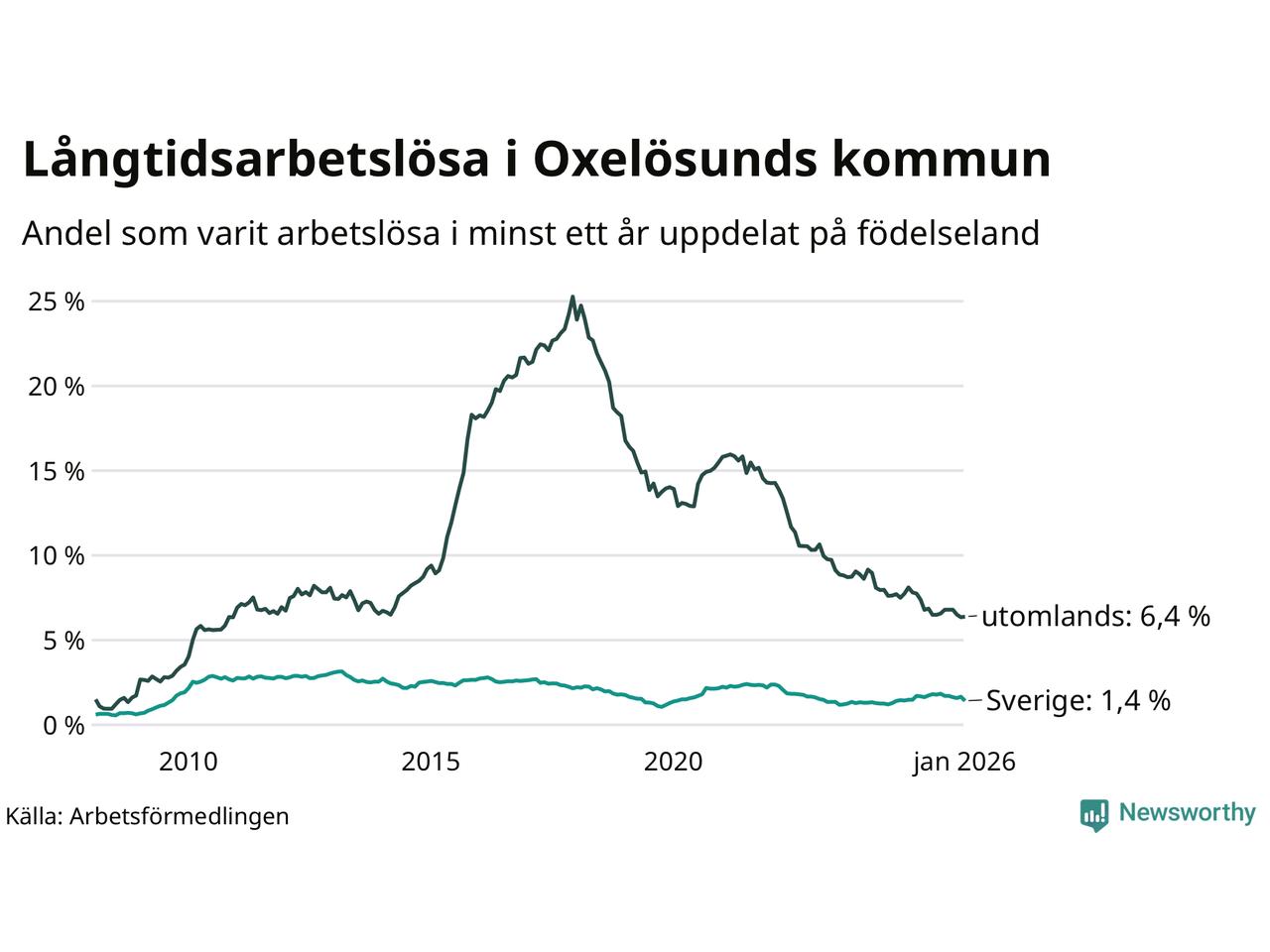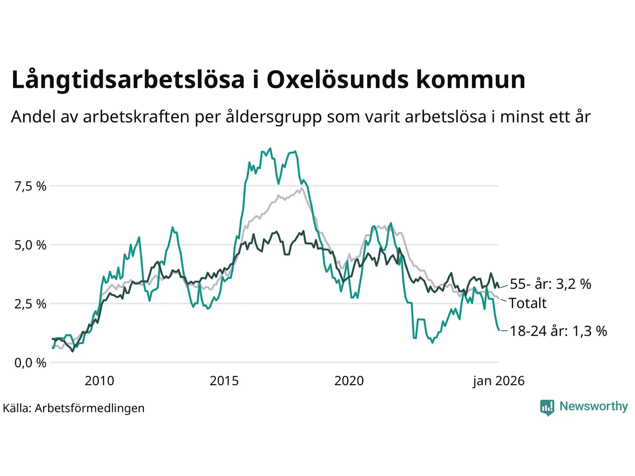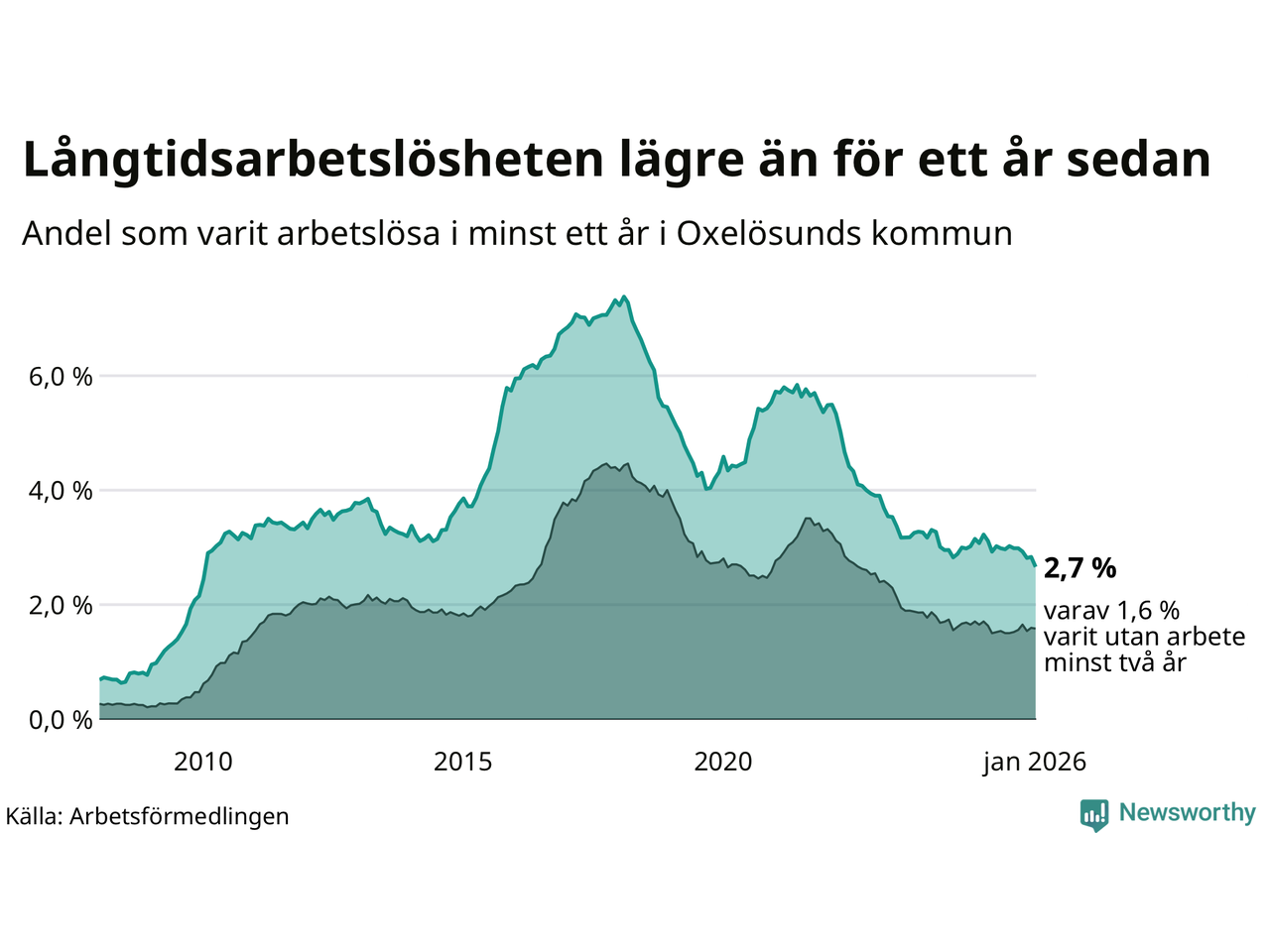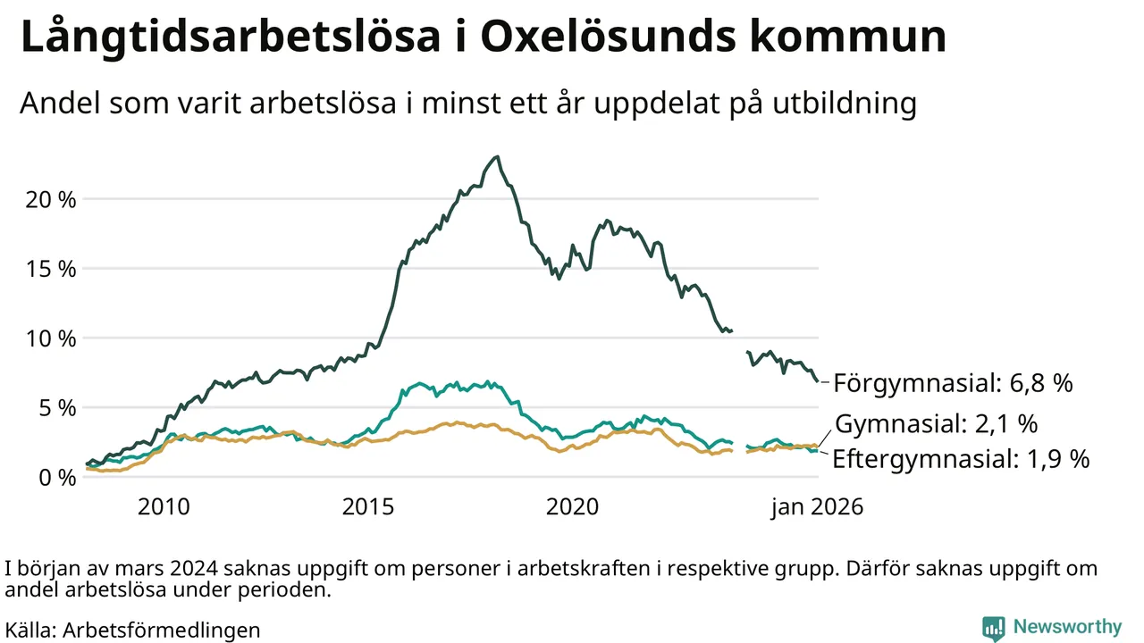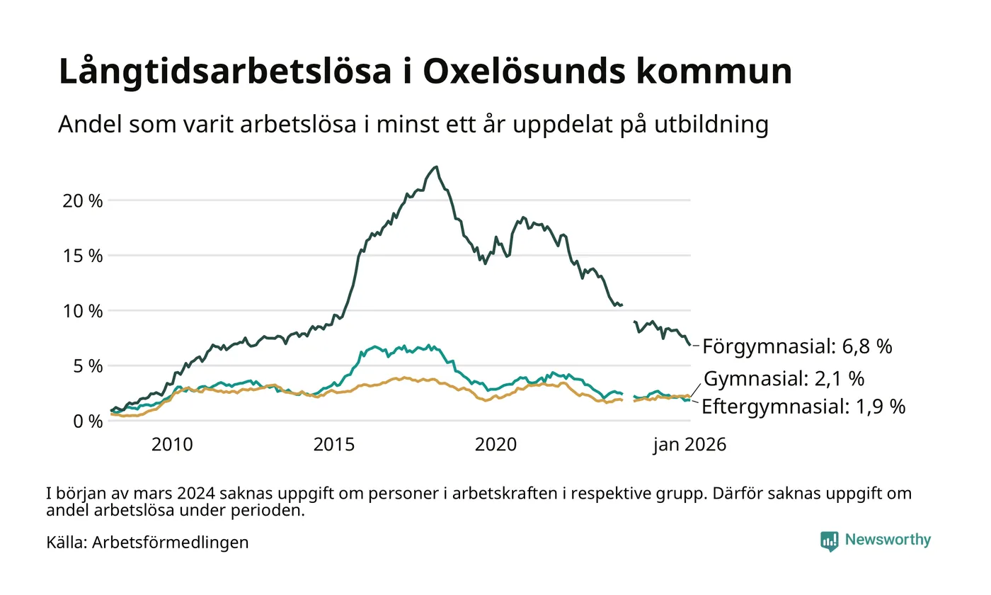 I januari hade 143 Oxelösundsbor varit arbetslösa i minst ett år, vilket är åtta färre än månaden innan. 143 personer motsvarar 2,7 procent av arbetskraften i kommunen – andelen långtidsarbetslösa är 0,5 procentenheter lägre än samma månad för ett år sedan.