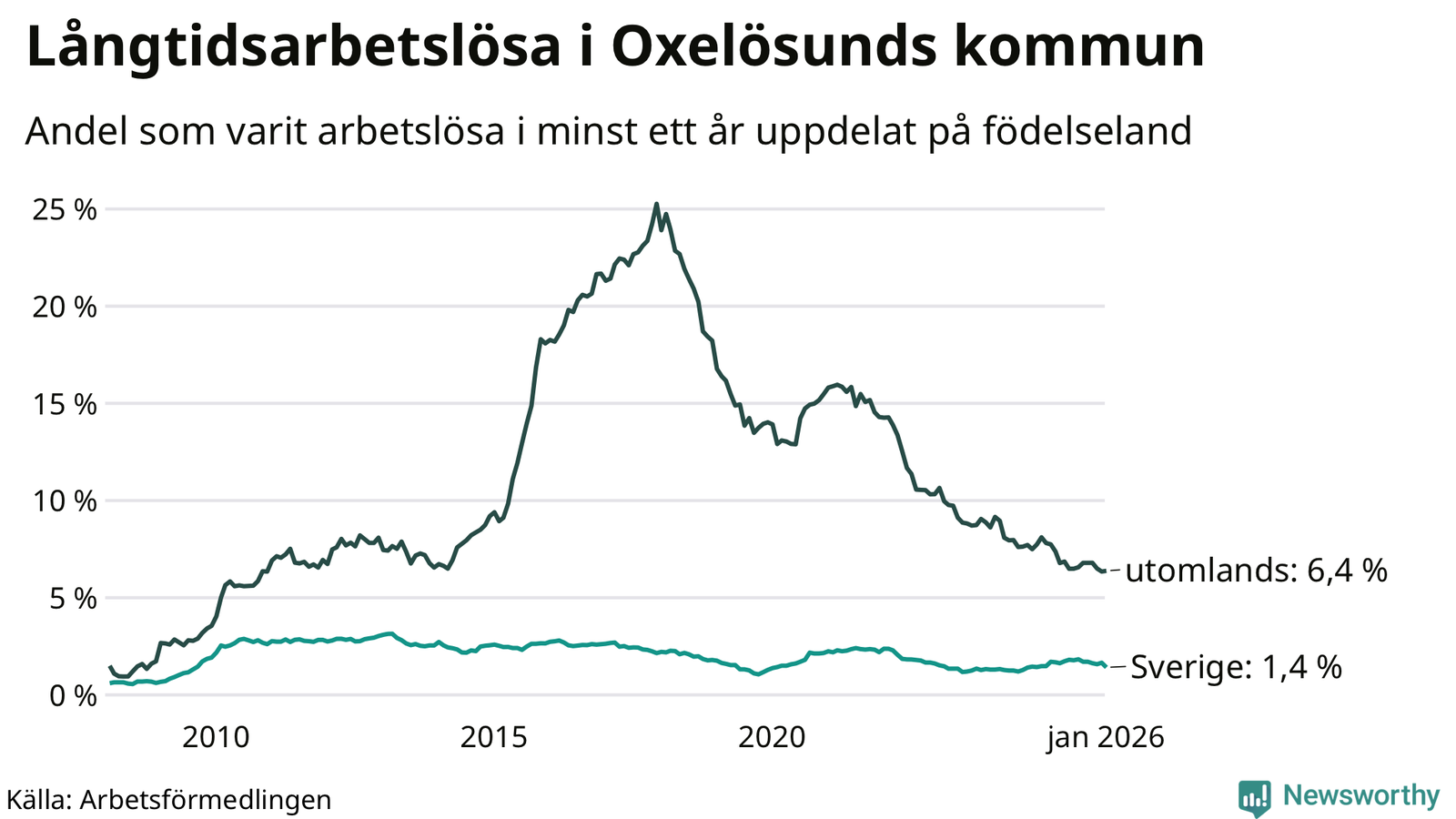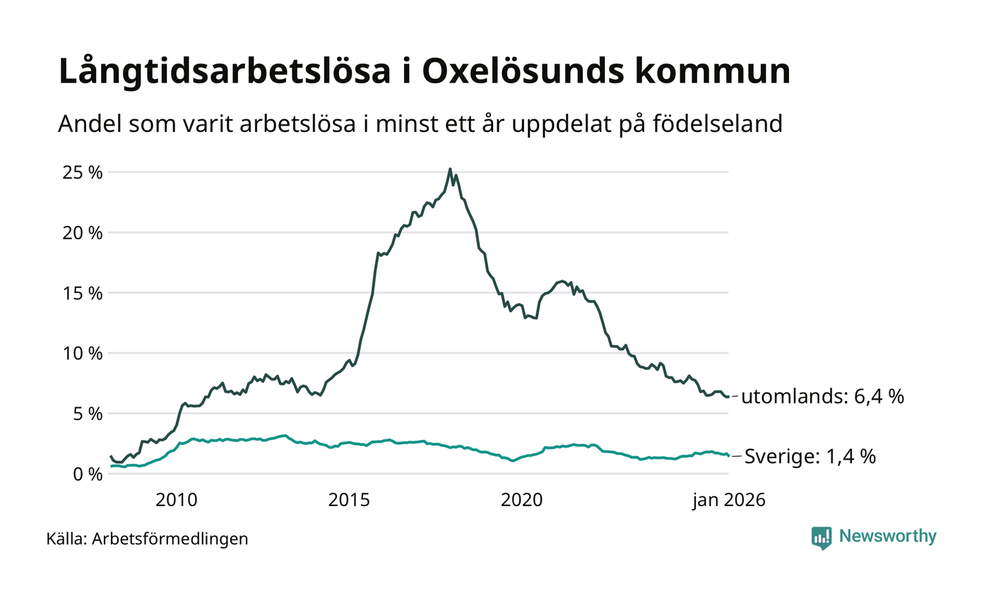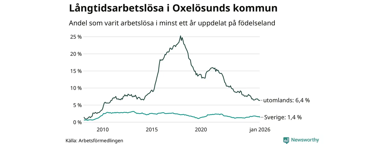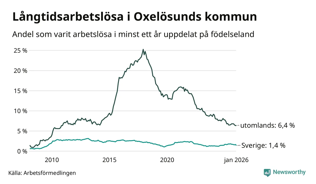 57 av de långtidsarbetslösa i Oxelösund är födda i Sverige, medan 86 är födda utomlands. Det innebär att långtidsarbetslösheten bland Sverigefödda är 1,4 procent, medan den är fem gånger så hög – 6,4 procent – bland födda utomlands. Även i riket som helhet är arbetslösheten högre bland utrikesfödda.