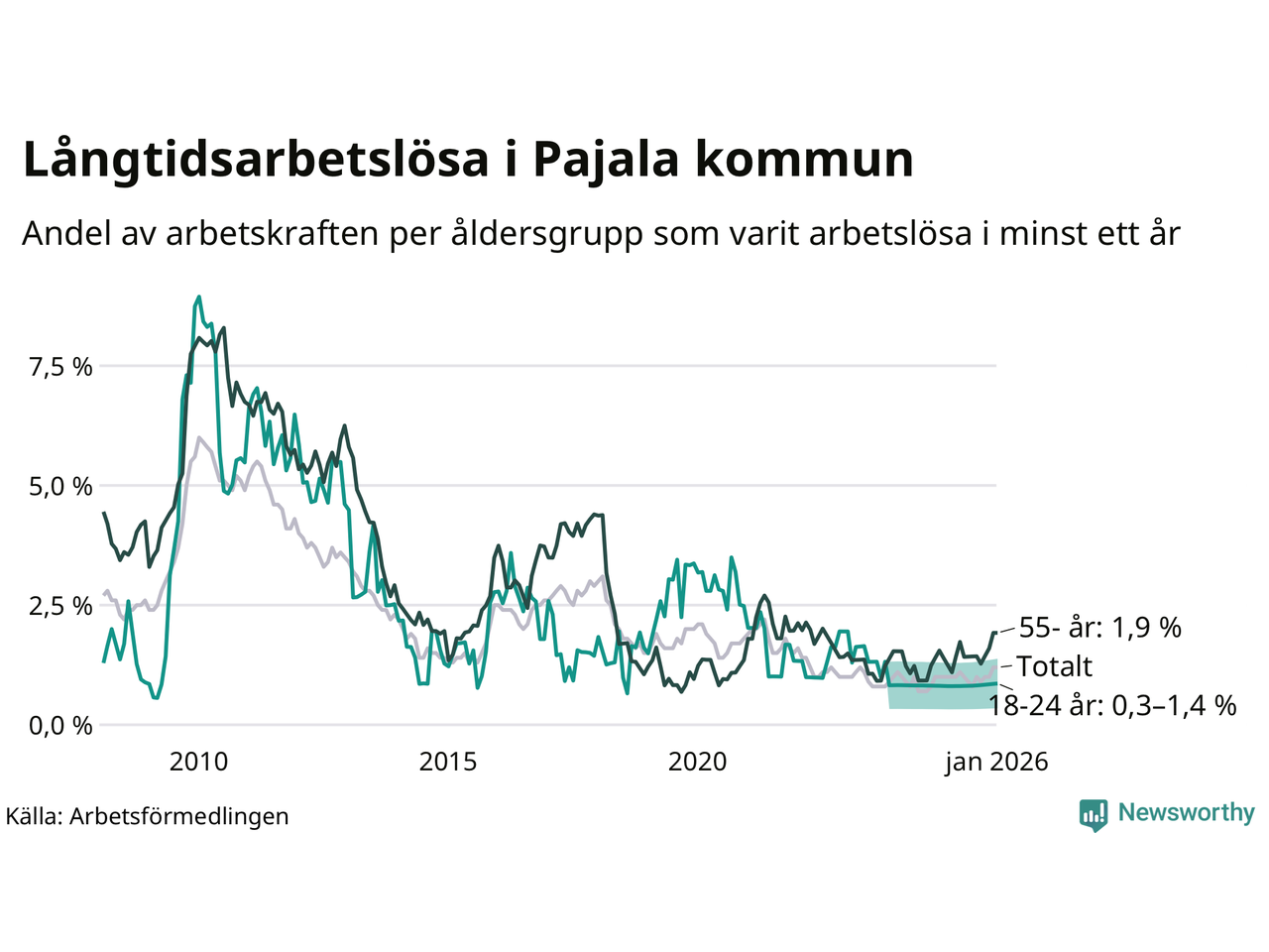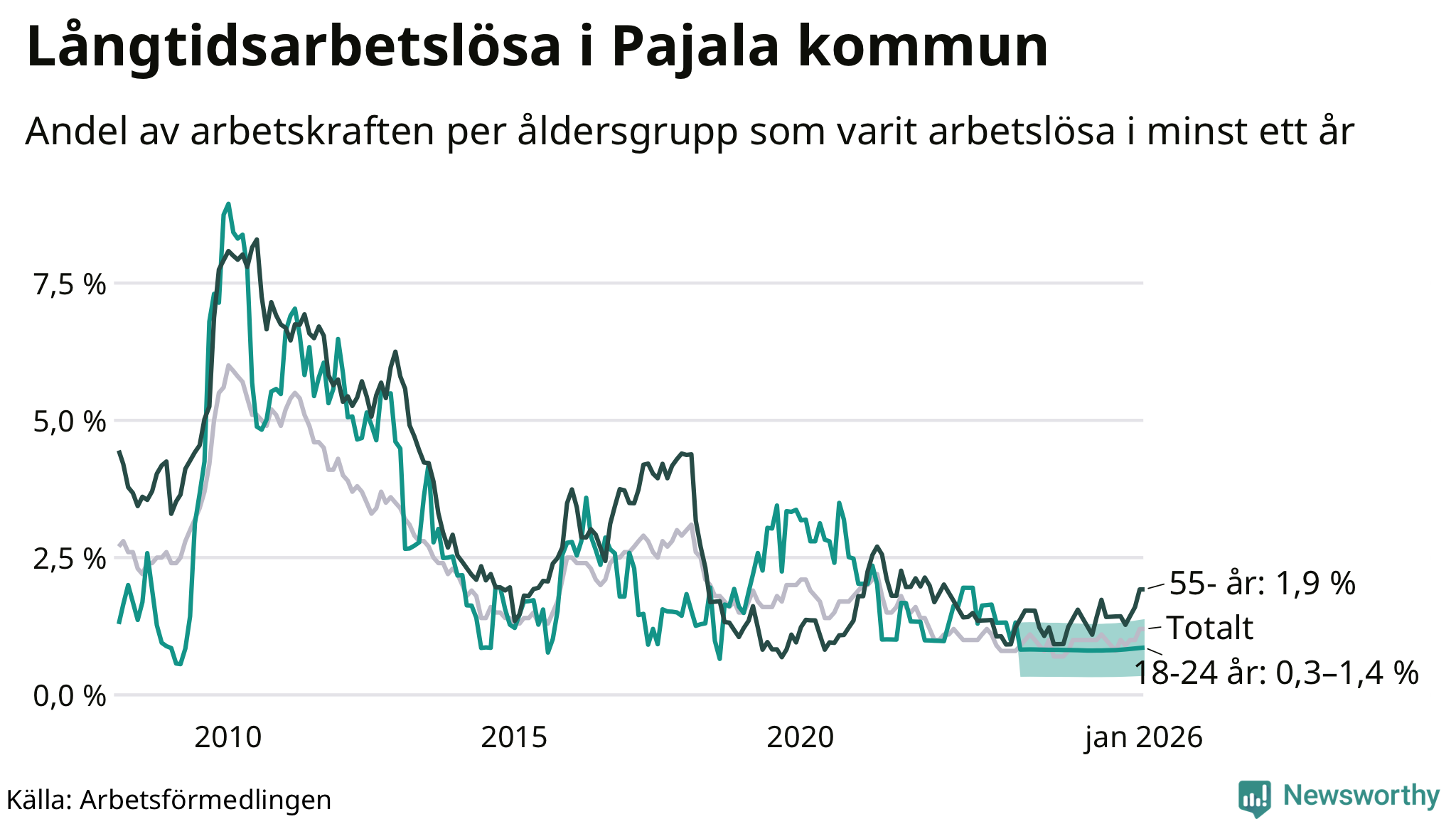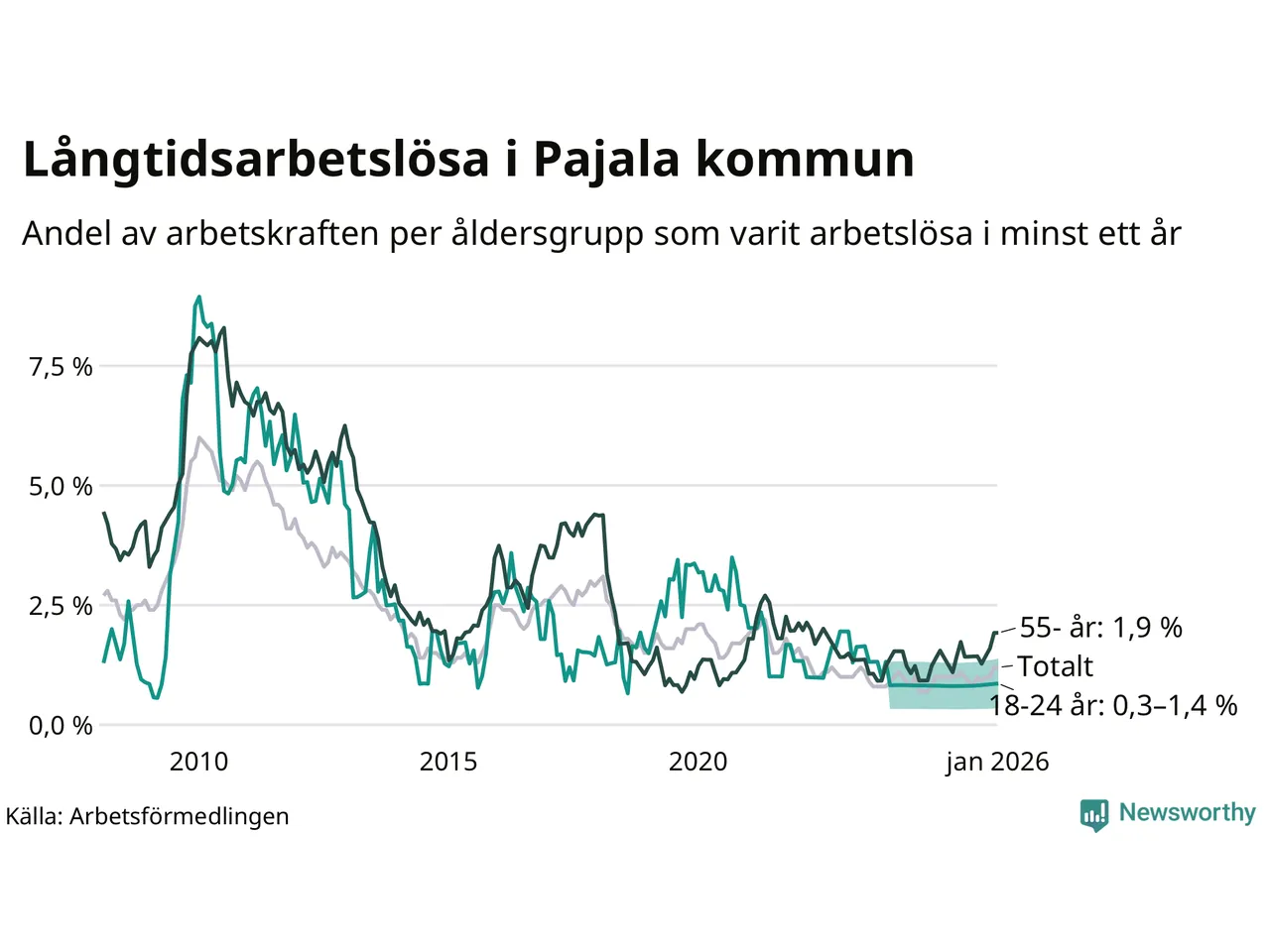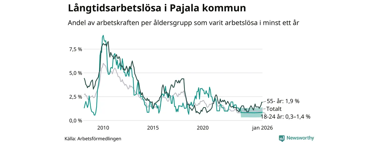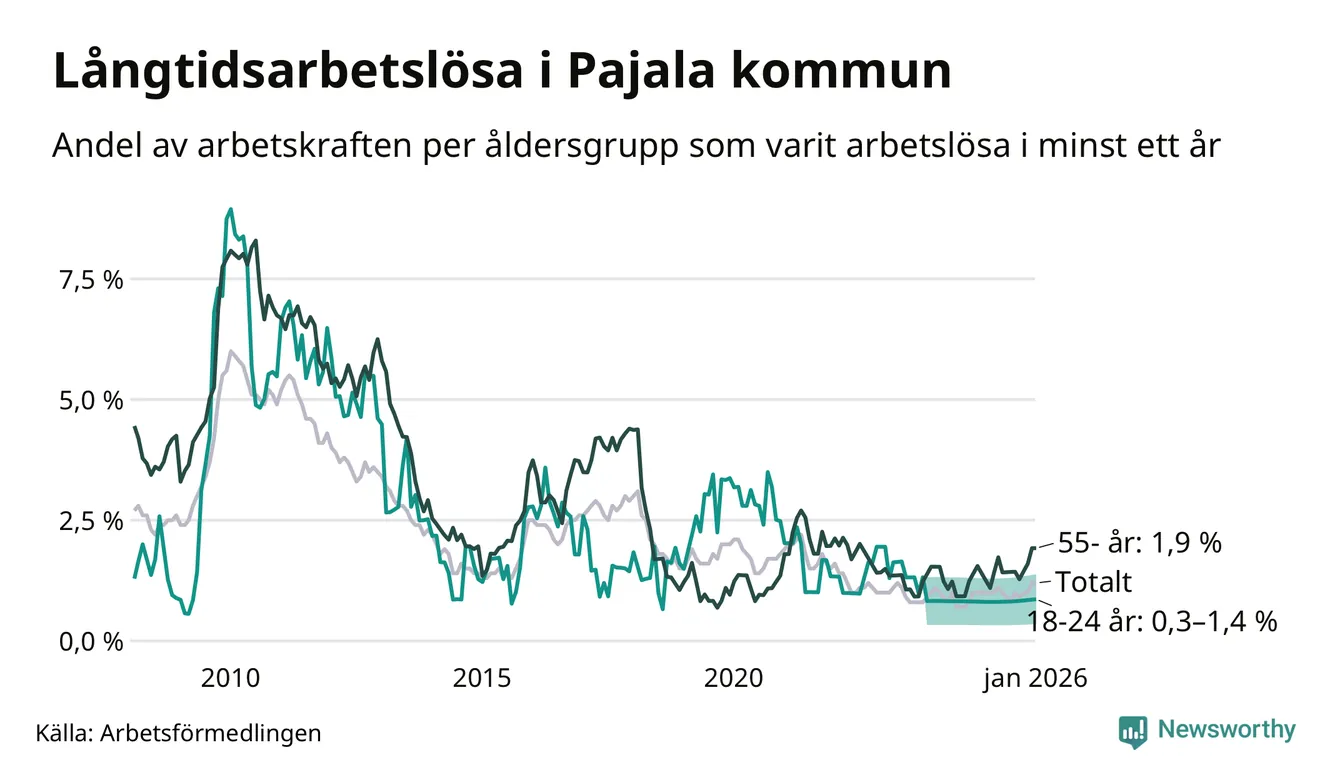 Av de 28 personerna som varit arbetslösa i mer än ett år i Pajala kommun är tolv personer mellan 55 och 661 år och mellan en och fyra är mellan 18 och 24 år. För den äldre gruppen är andelen arbetslösa 1,9 procent medan den i den yngre gruppen är mellan 0,3 och 1,4 procent. Även i riket som helhet är långtidsarbetslösheten högre i gruppen äldre.