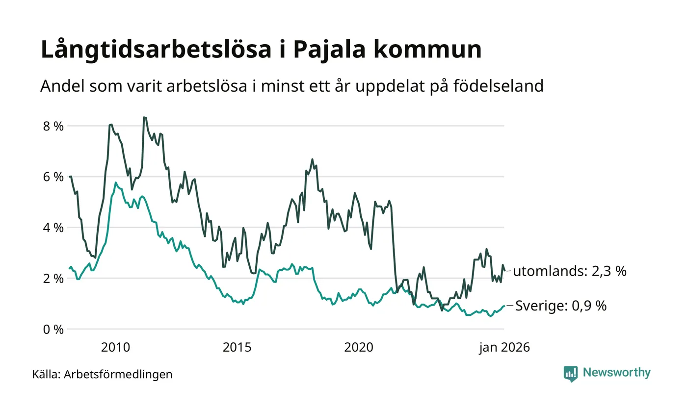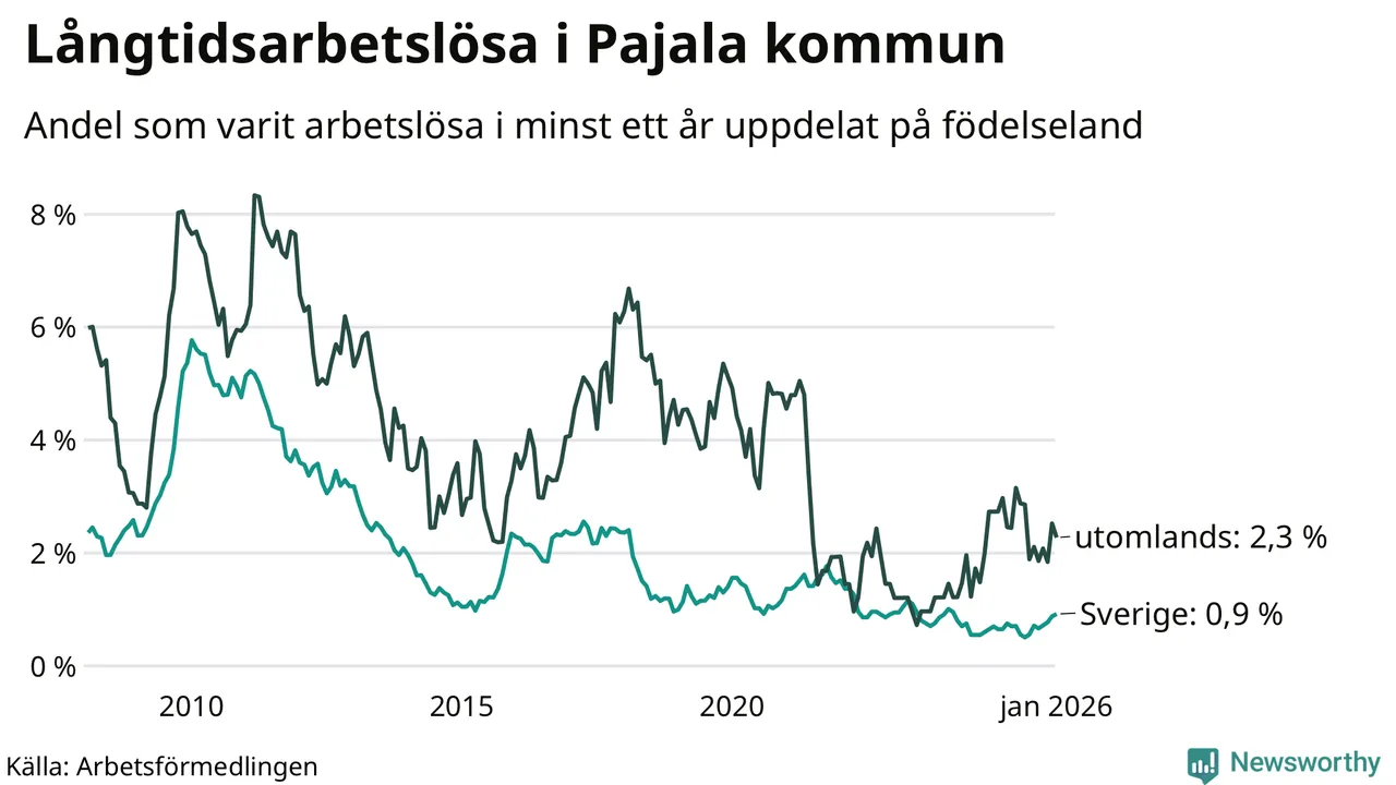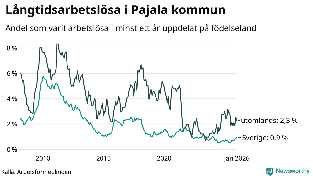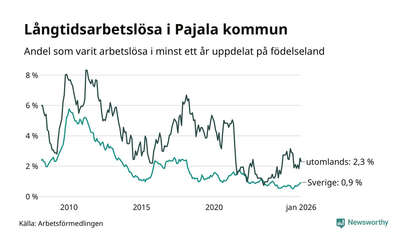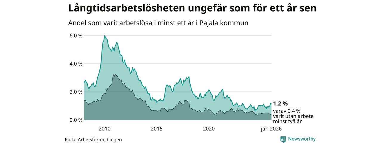 I januari hade 28 Pajalabor varit arbetslösa i minst ett år, vilket är lika många som månaden innan. Det är den fjärde månaden i rad med ökande eller oförändrat antal långtidsarbetslösa. 28 personer motsvarar 1,2 procent av arbetskraften i kommunen – andelen långtidsarbetslösa är ungefär på samma nivå som för ett år sedan. Pajala tillhör de kommuner som har lägst andel långtidsarbetslösa i hela landet just nu.