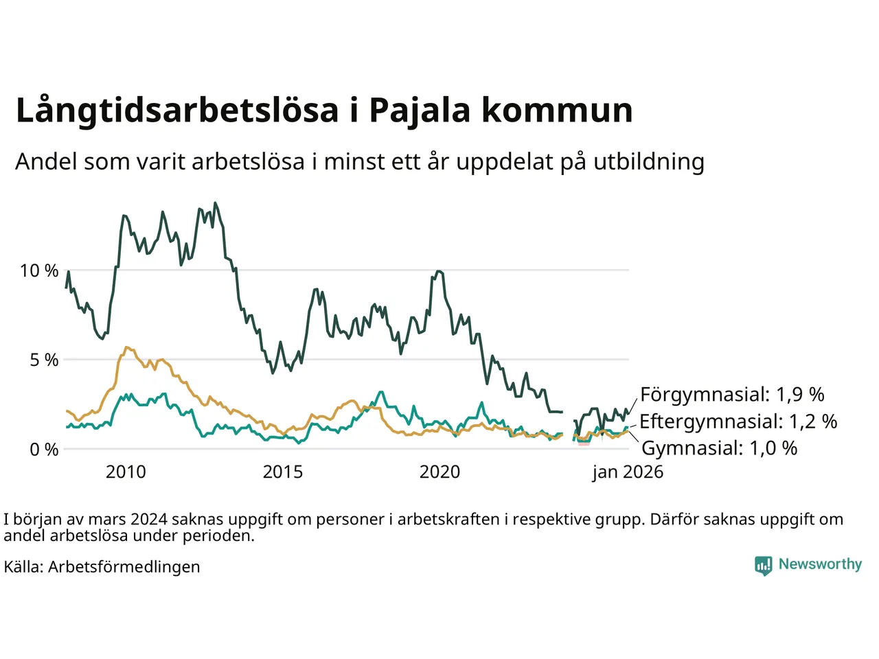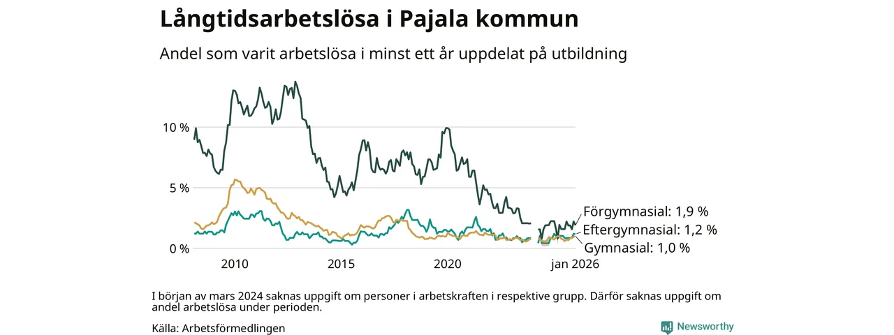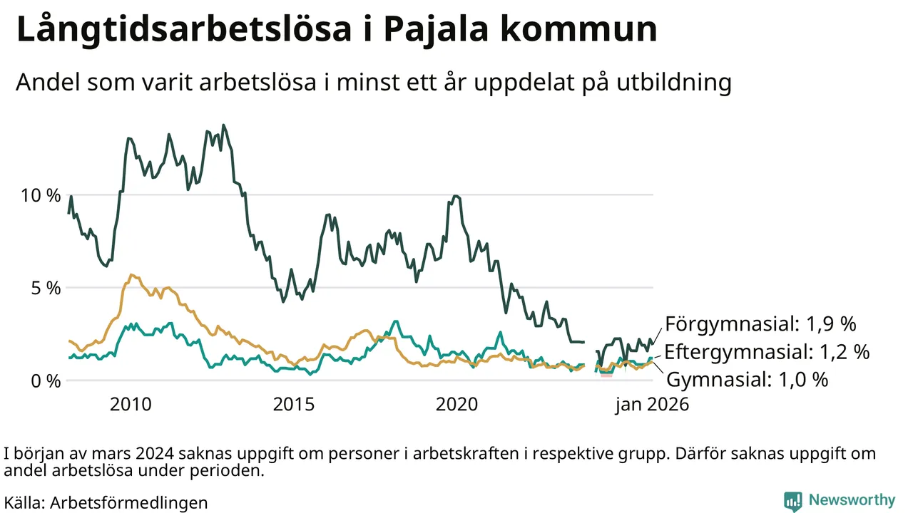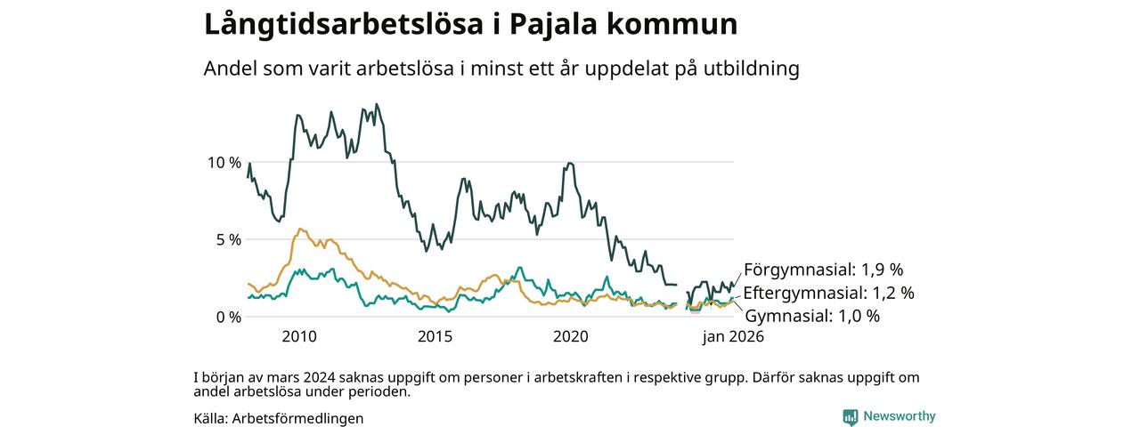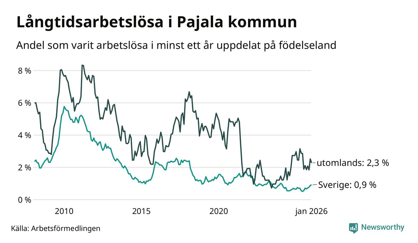 I januari hade 28 Pajalabor varit arbetslösa i minst ett år, vilket är lika många som månaden innan. Det är den fjärde månaden i rad med ökande eller oförändrat antal långtidsarbetslösa. 28 personer motsvarar 1,2 procent av arbetskraften i kommunen – andelen långtidsarbetslösa är ungefär på samma nivå som för ett år sedan. Pajala tillhör de kommuner som har lägst andel långtidsarbetslösa i hela landet just nu.