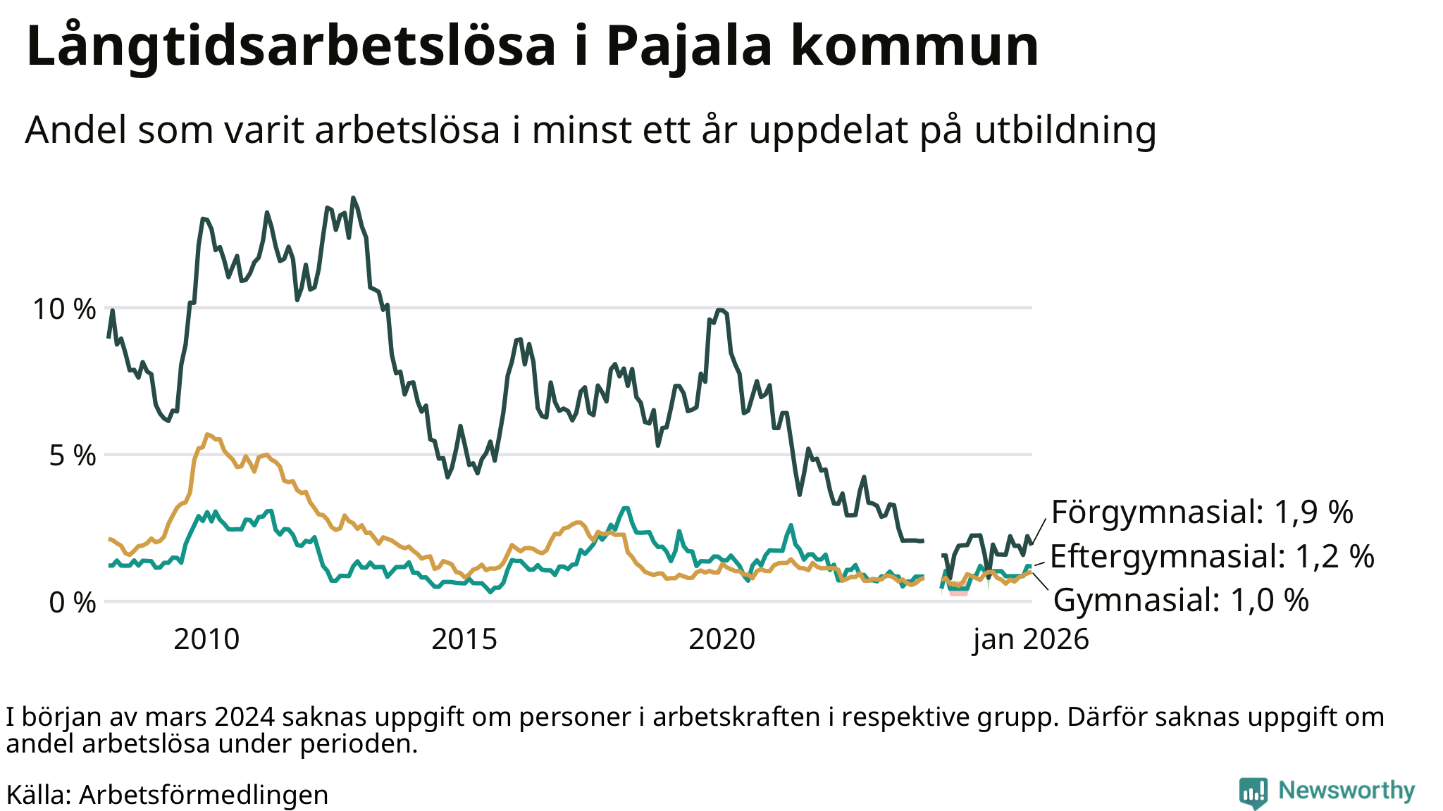 Andelen som varit utan arbete i minst ett år i Pajala var ungefär lika stor i januari jämfört med samma månad för ett år sedan. Det visar Arbetsfömedlingens senaste månadsstatistik.