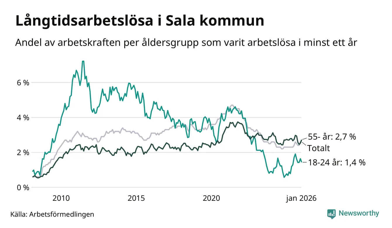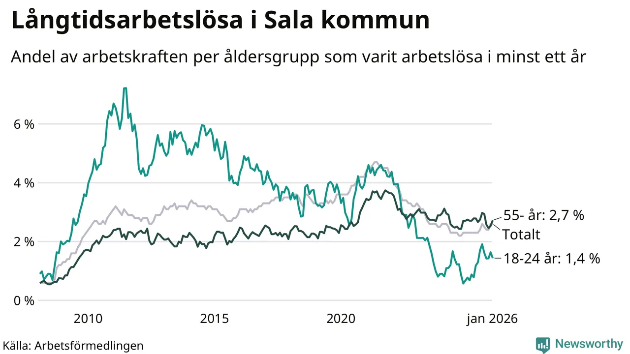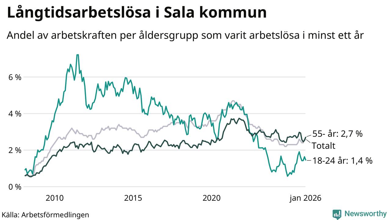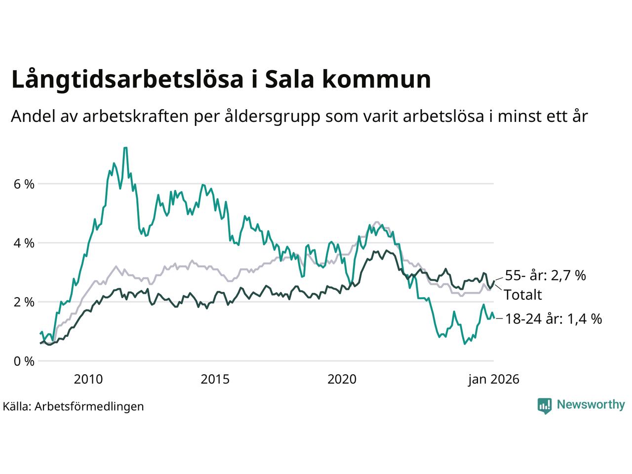 Av de 276 personerna som varit arbetslösa i mer än ett år i Sala kommun är 70 personer mellan 55 och 661 år och 14 är mellan 18 och 24 år. För den äldre gruppen är andelen arbetslösa 2,7 procent medan den i den yngre gruppen är 1,4 procent. Även i riket som helhet är långtidsarbetslösheten högre i gruppen äldre.