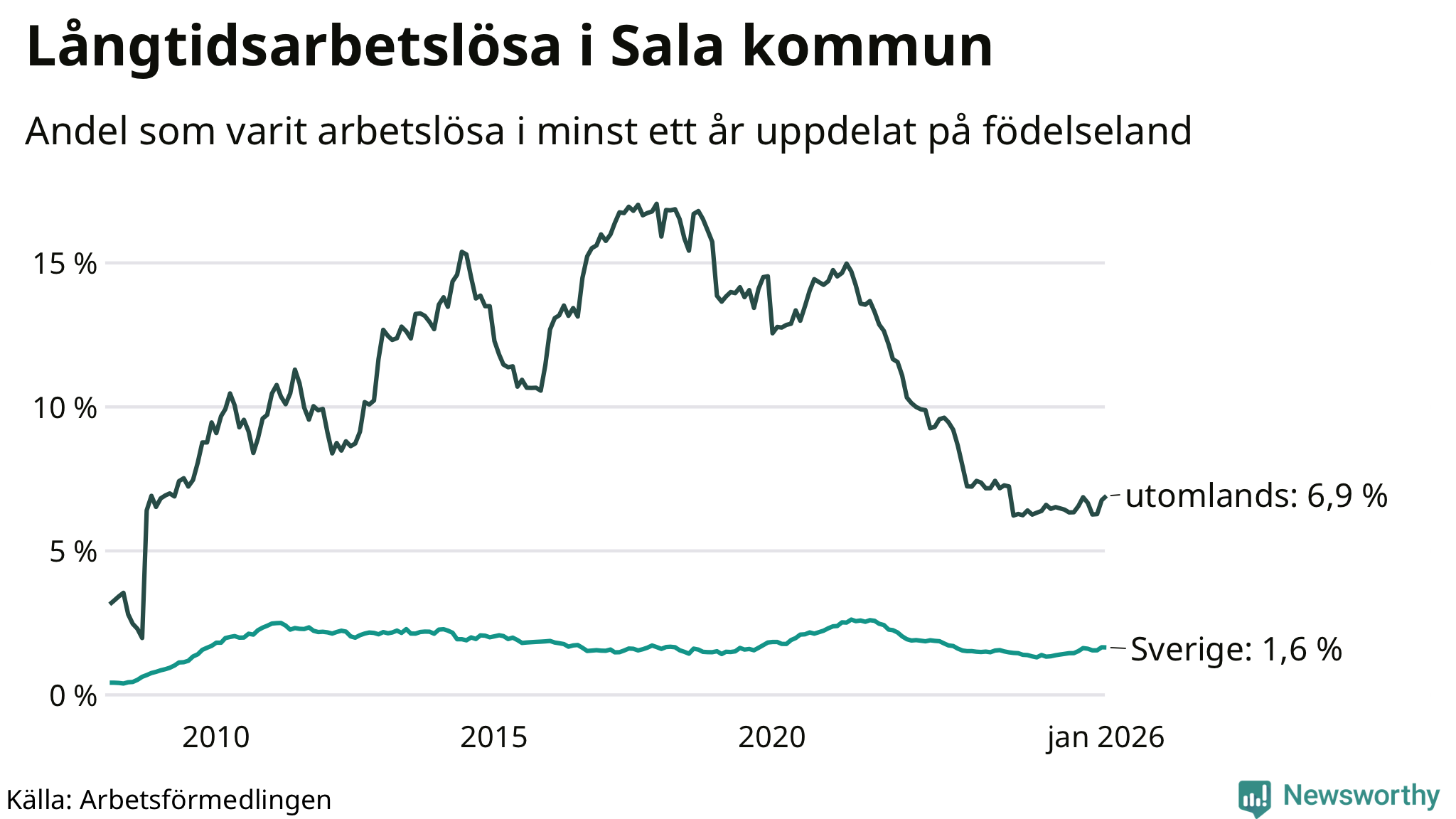 143 av de långtidsarbetslösa i Sala är födda i Sverige, medan 133 är födda utomlands. Det innebär att långtidsarbetslösheten bland Sverigefödda är 1,6 procent, medan den är fyra gånger så hög – 6,9 procent – bland födda utomlands. Även i riket som helhet är arbetslösheten högre bland utrikesfödda.