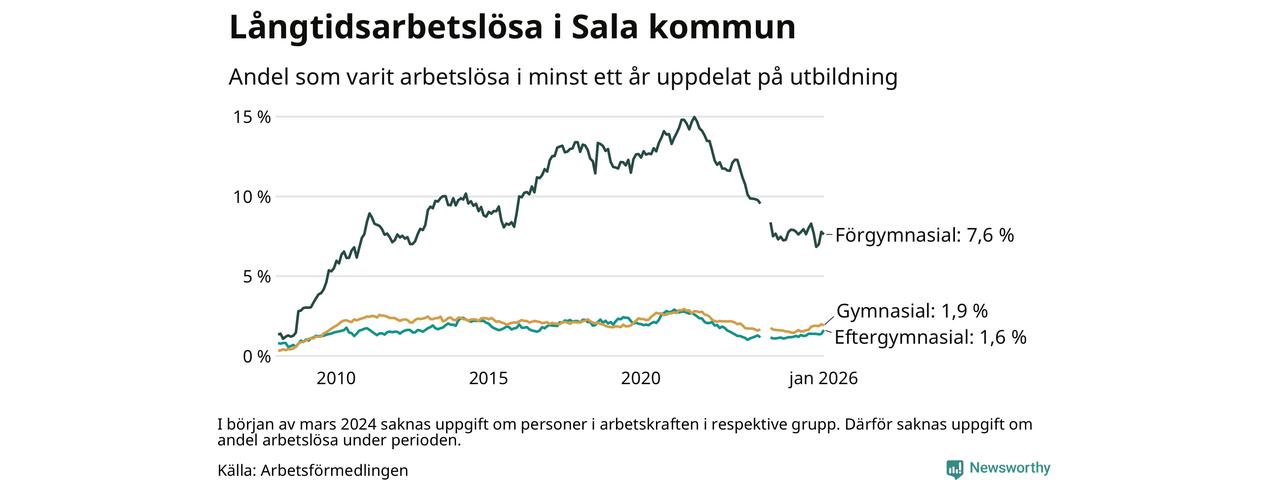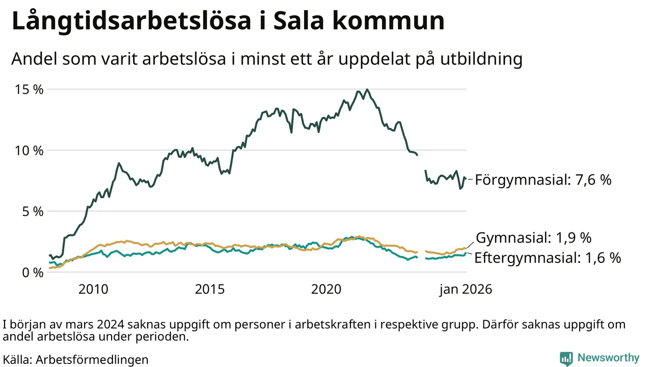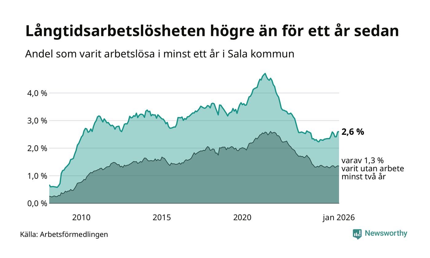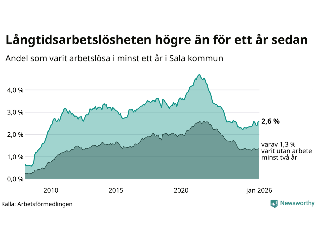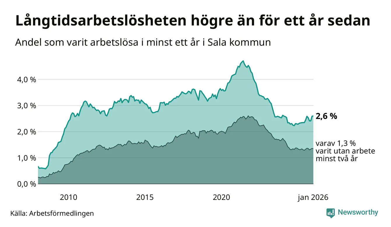 Andelen som varit utan arbete i minst ett år i Sala var högre i januari jämfört med samma månad för ett år sedan. Det visar Arbetsfömedlingens senaste månadsstatistik.
