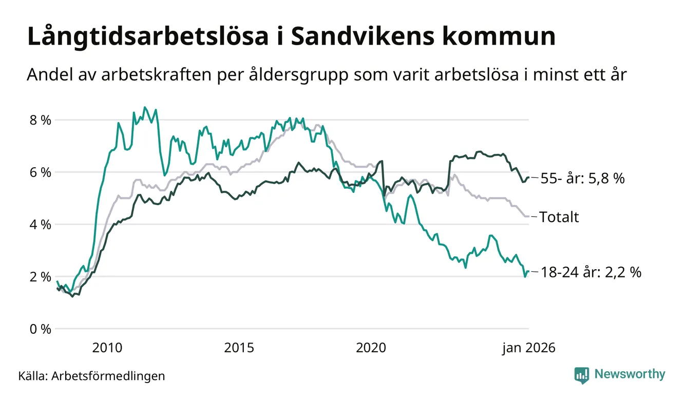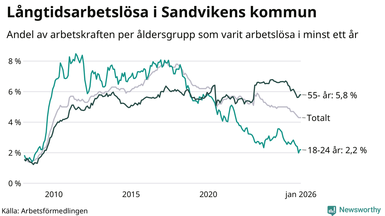 Av de 799 personerna som varit arbetslösa i mer än ett år i Sandvikens kommun är 267 personer mellan 55 och 661 år och 42 är mellan 18 och 24 år. För den äldre gruppen är andelen arbetslösa 5,8 procent medan den i den yngre gruppen är 2,2 procent. Även i riket som helhet är långtidsarbetslösheten högre i gruppen äldre.