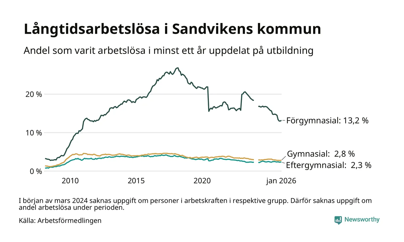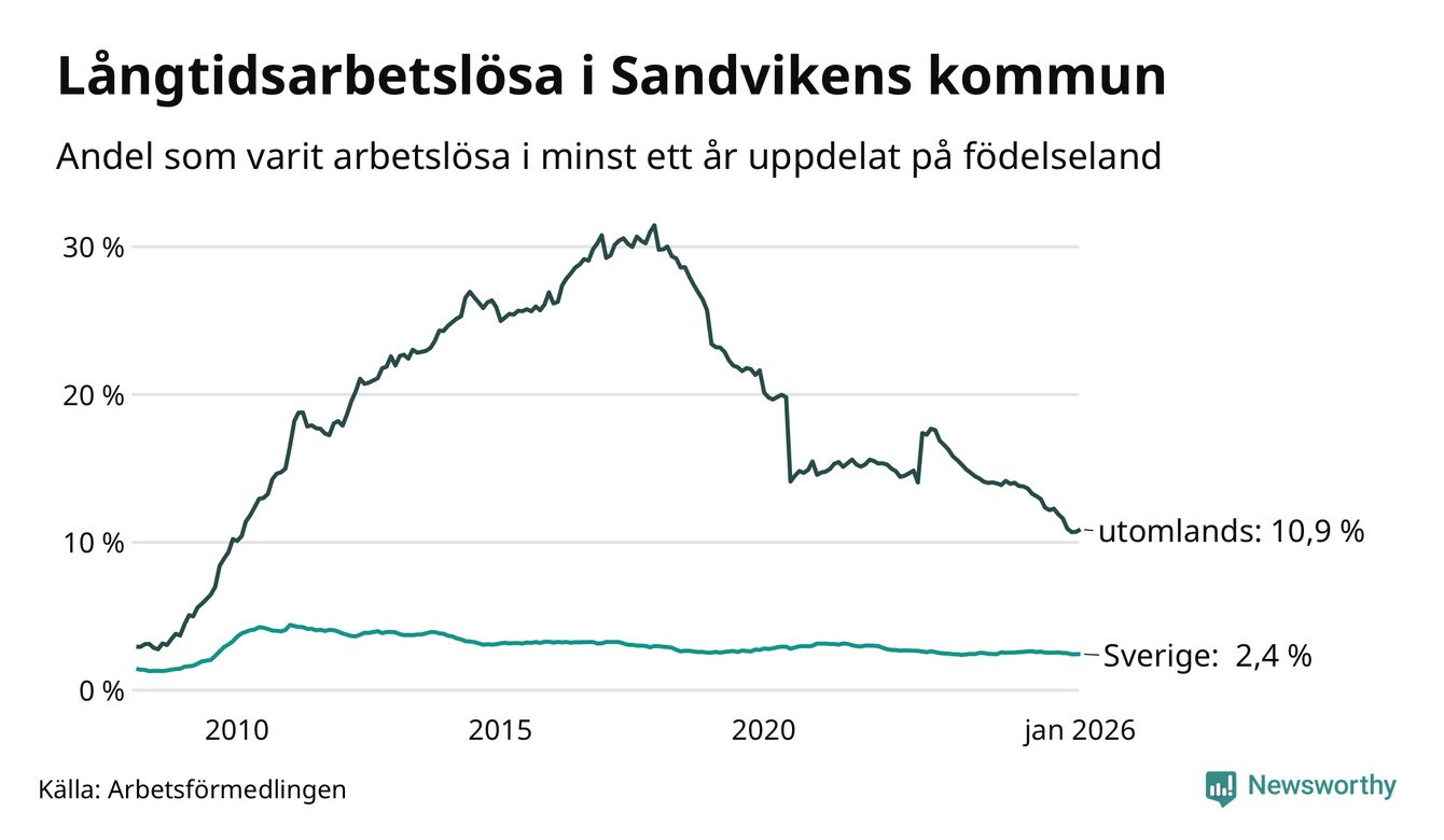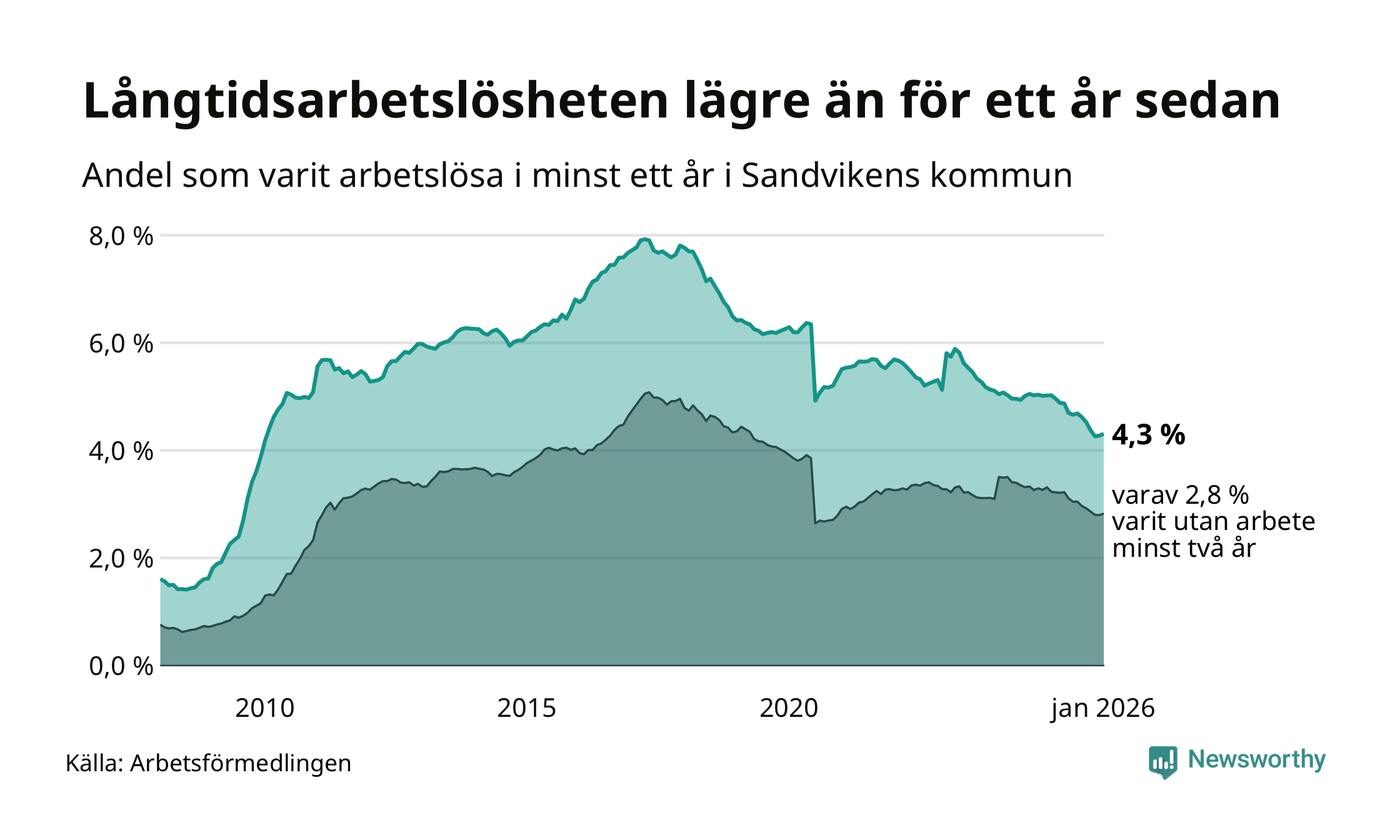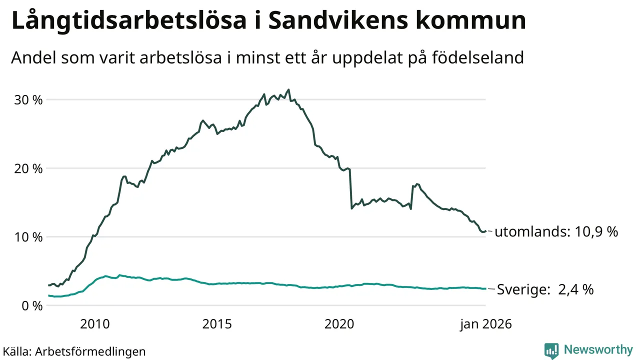 I januari hade 799 Sandvikenbor varit arbetslösa i minst ett år, vilket är tolv fler än månaden innan. 799 personer motsvarar 4,3 procent av arbetskraften i kommunen – andelen långtidsarbetslösa är 0,7 procentenheter lägre än samma månad för ett år sedan. Sandviken tillhör de kommuner som har högst andel långtidsarbetslösa i hela landet just nu.
