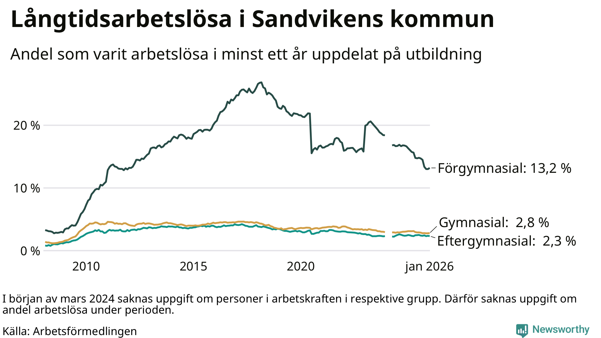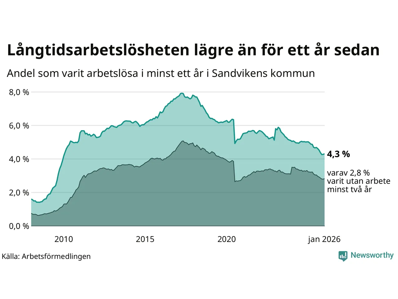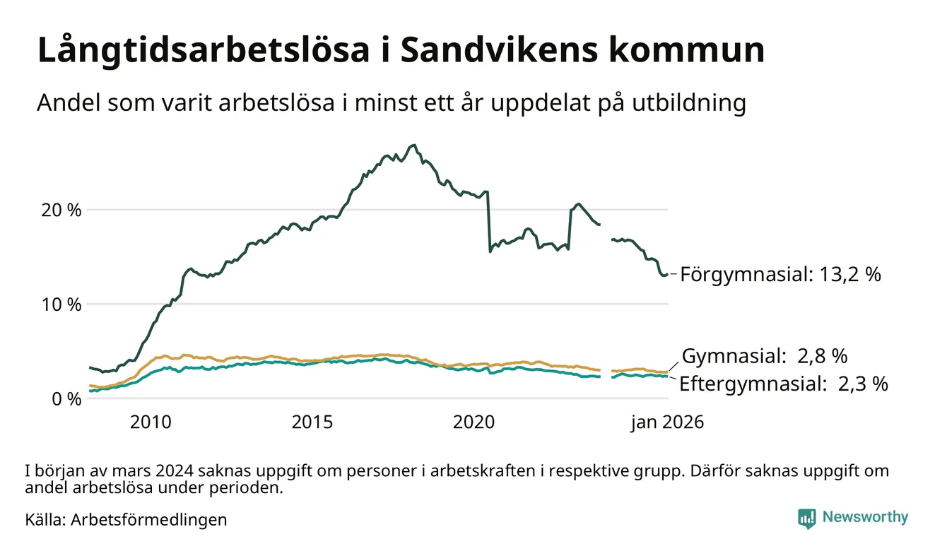 I januari hade 799 Sandvikenbor varit arbetslösa i minst ett år, vilket är tolv fler än månaden innan. 799 personer motsvarar 4,3 procent av arbetskraften i kommunen – andelen långtidsarbetslösa är 0,7 procentenheter lägre än samma månad för ett år sedan. Sandviken tillhör de kommuner som har högst andel långtidsarbetslösa i hela landet just nu.