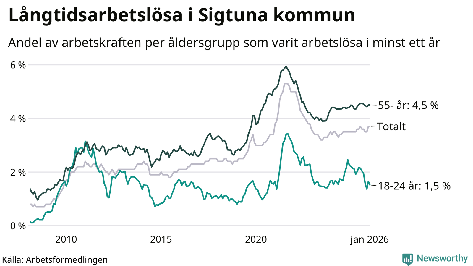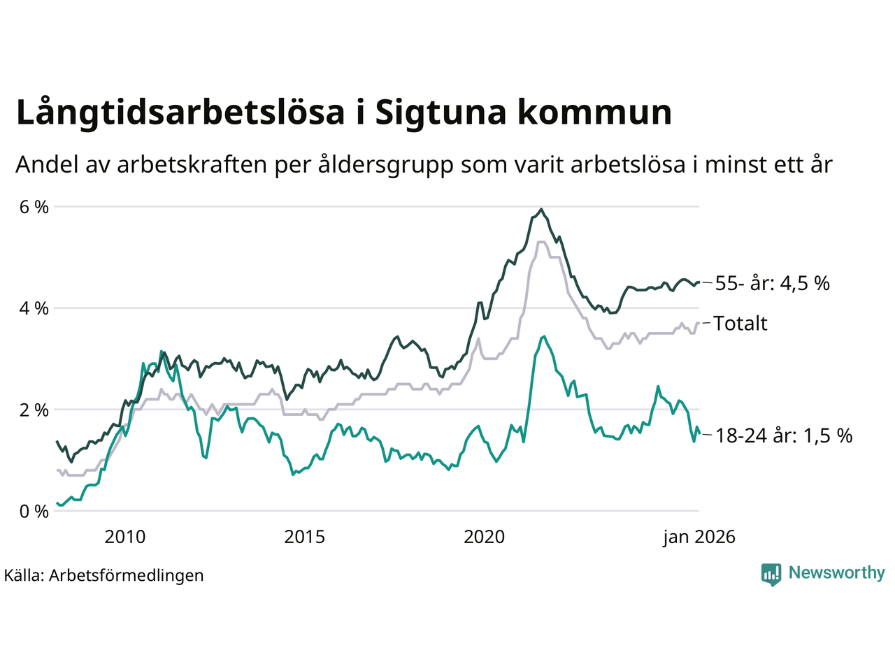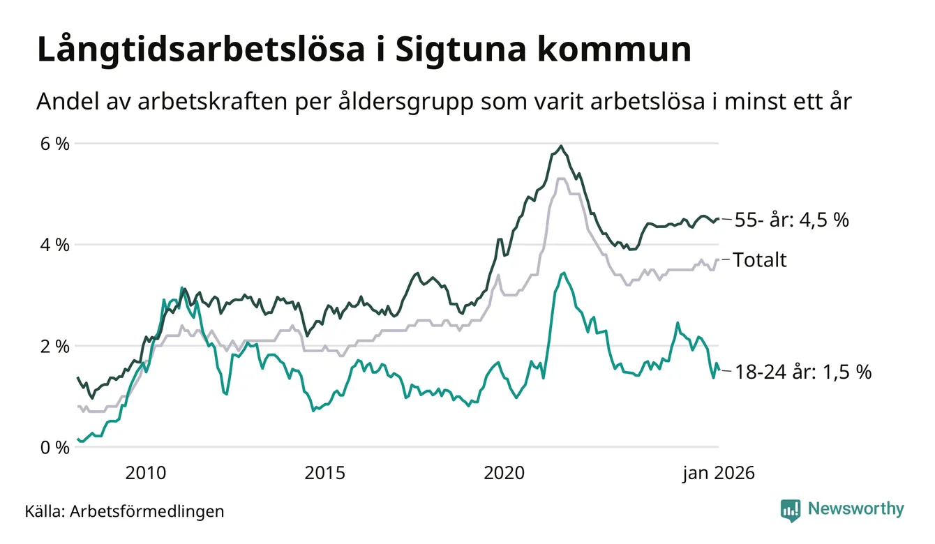 Av de 1 000 personerna som varit arbetslösa i mer än ett år i Sigtuna kommun är 243 personer mellan 55 och 661 år och 42 är mellan 18 och 24 år. För den äldre gruppen är andelen arbetslösa 4,5 procent medan den i den yngre gruppen är 1,5 procent. Även i riket som helhet är långtidsarbetslösheten högre i gruppen äldre.
